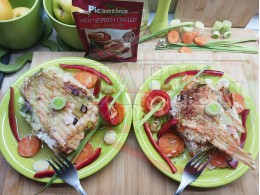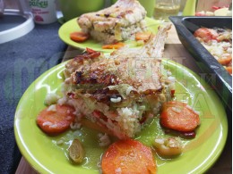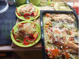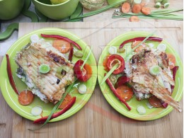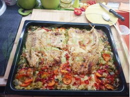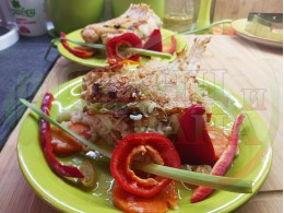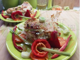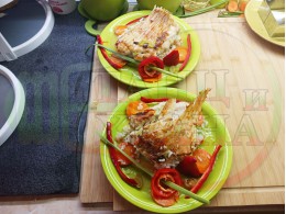 Никулденски филетиран шаран "Шарановофилев червеночушковоморковен празлученооризов 2025 г." запечен на фурна с праз лук, ориз, червени пресни чушки и моркови