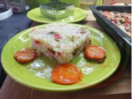 Оформете ориза в квадратна форма в средата на чиниите и поставете част от запечените рибни филета върху ориза. Украсете порциите със сварени кръгчета от морковите, с част от сварените лучени кръгчета и сурови такива и с перцата на празия лук и чушковите обръчи ивички и връхчета (украсете порциите по ваше желание и усмотрение).