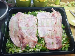 Измийте шарана, почистете го от люспите и вътрешностите и го оставете да се отцеди (тази година не осолявах шарана и сипах сол само в тавата със зеленчуците). Повторете процедурата с измиването минимум 2 пъти и пуснете течаща вода от чешмата през устата и хрилете на шарана, в случай че ще приготвите някакво ястие от главата на шарана. Отрежете главата на шарана, всичките гръбни и странични перки и малка част от по-тлъстото месо за  рибената супа. Разрежете шарана през гръбната кост за да се оформят големи филета, измийте ги под течаща вода и ги оставете да се отцедят.