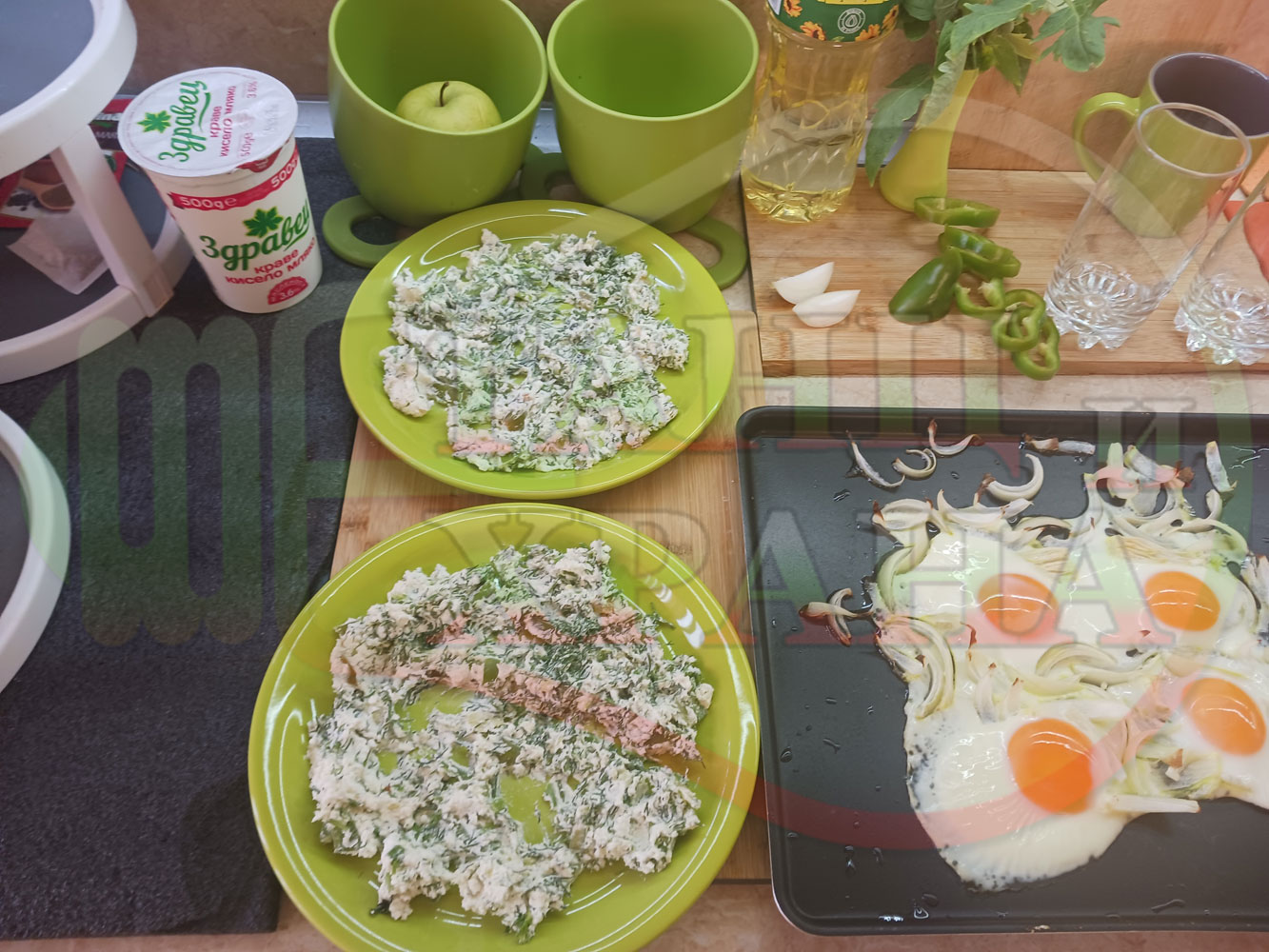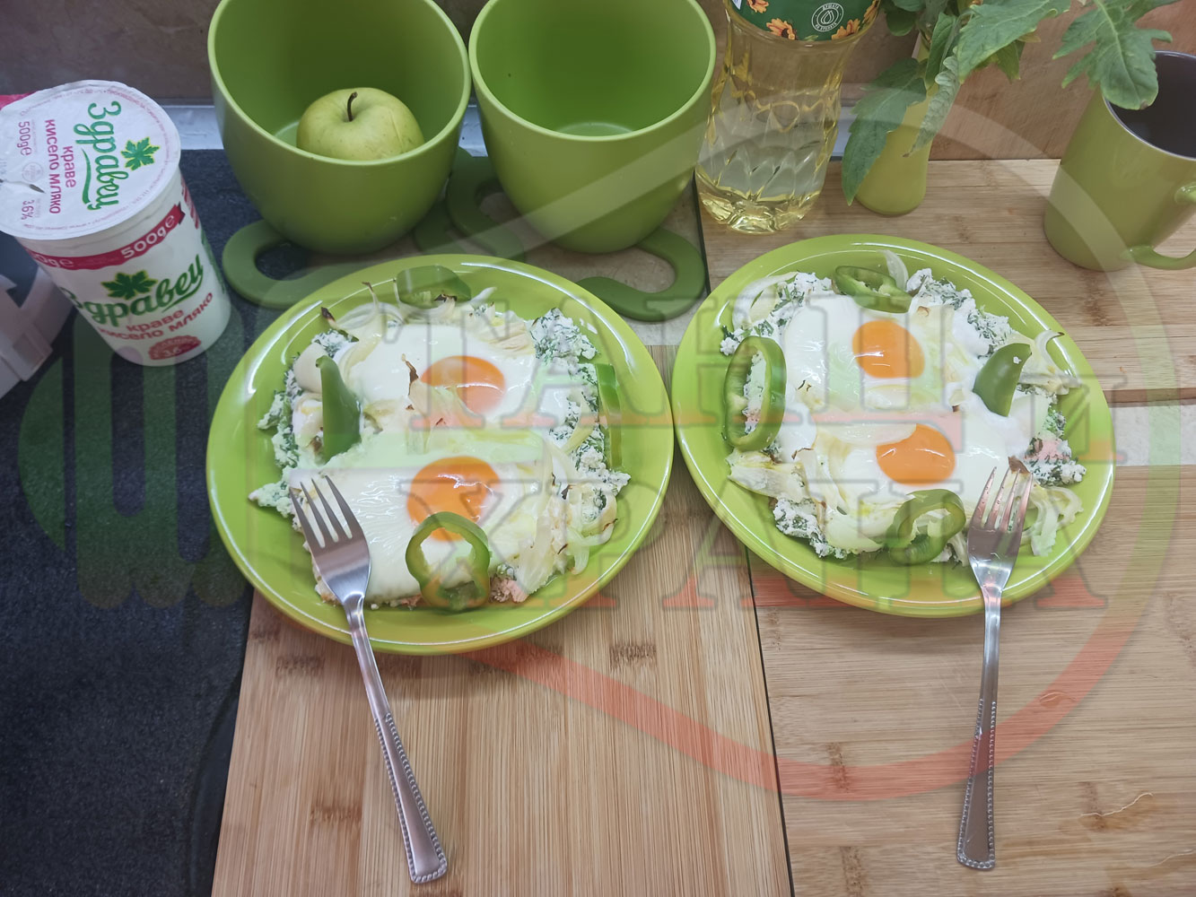 Българска зеленчукова млечна яйчена салата "Зеленочушкова с БГсирене" запечена на фурна с кромид лук и яйца на очи гарнирана в суров сиренов крем от зелени пресни чушки, копър, чесън, краве бяло сирене и кисело мляко от България - двукомпонентна