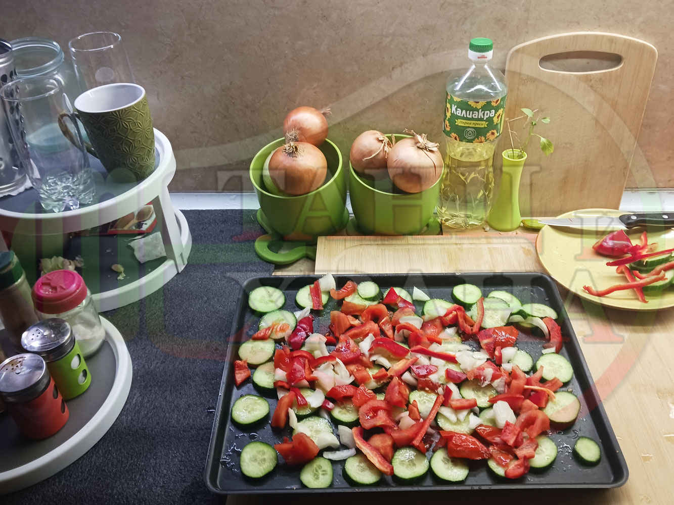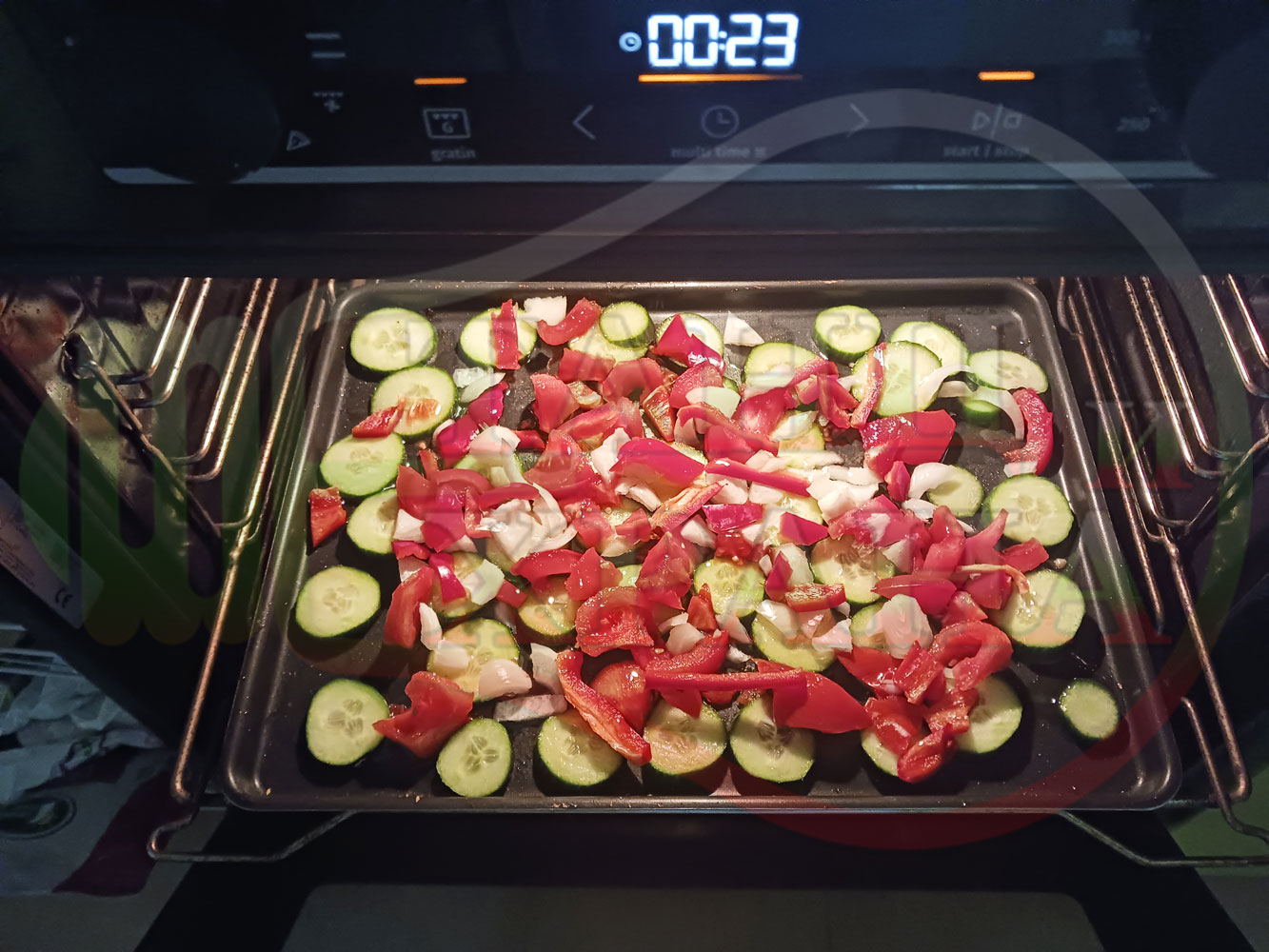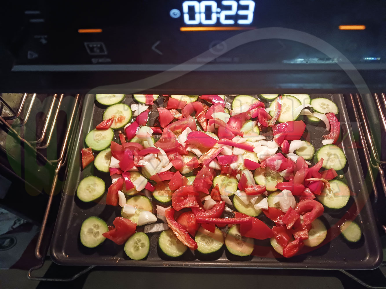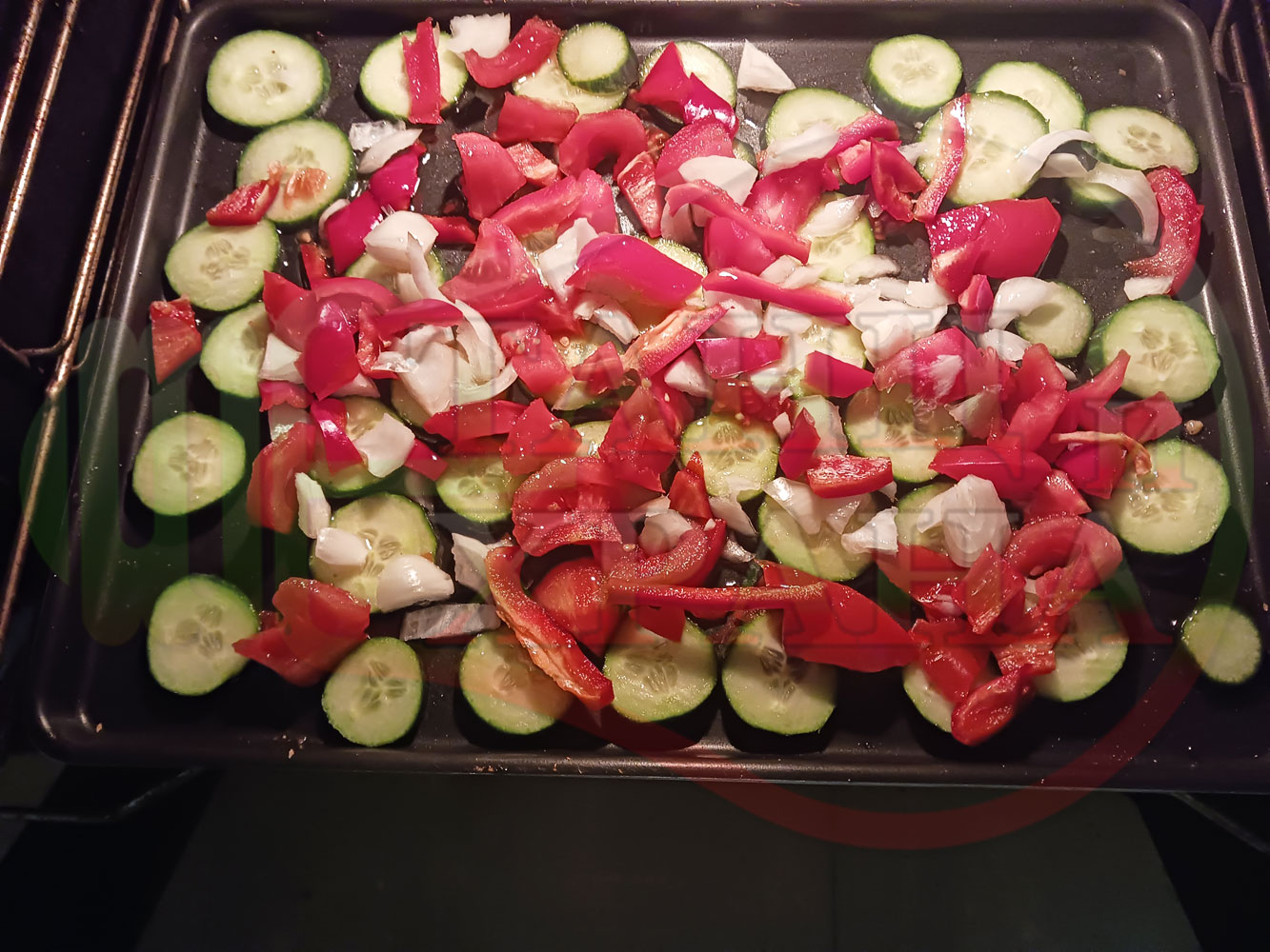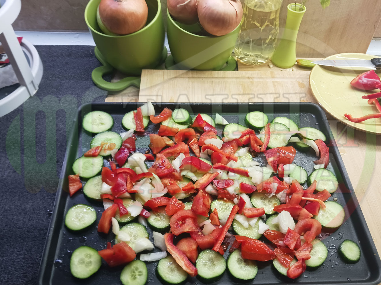 Измийте краставицата, нарежете я на кръгчета и я подредете в намазана със слънчогледово олио тава за печене заедно с измития и нарязан на средни по големина парченца домат (запазете кръгчета от краставицата за украса). Измийте чушката, отстранете семките, нарежете я на средни по големина парченца и ги сипете в тавата заедно с обеления, измит и нарязан на различни по големина парченца кромид лук (нарежете част от чушката на ивички и запазете връхчетата за украса). Разбъркайте и поставете тавата в предварително загрятата фурна (загрейте я за поне 5 минути). Запържете и задушете зеленчуците на фурна без вентилатор на 180 градуса за около 30 минути.