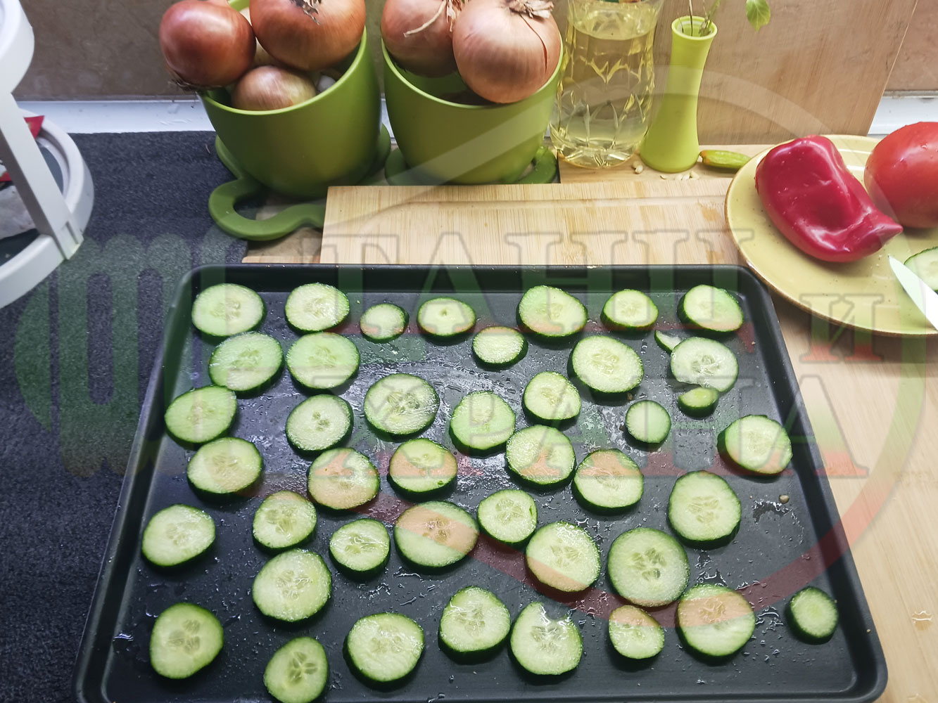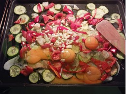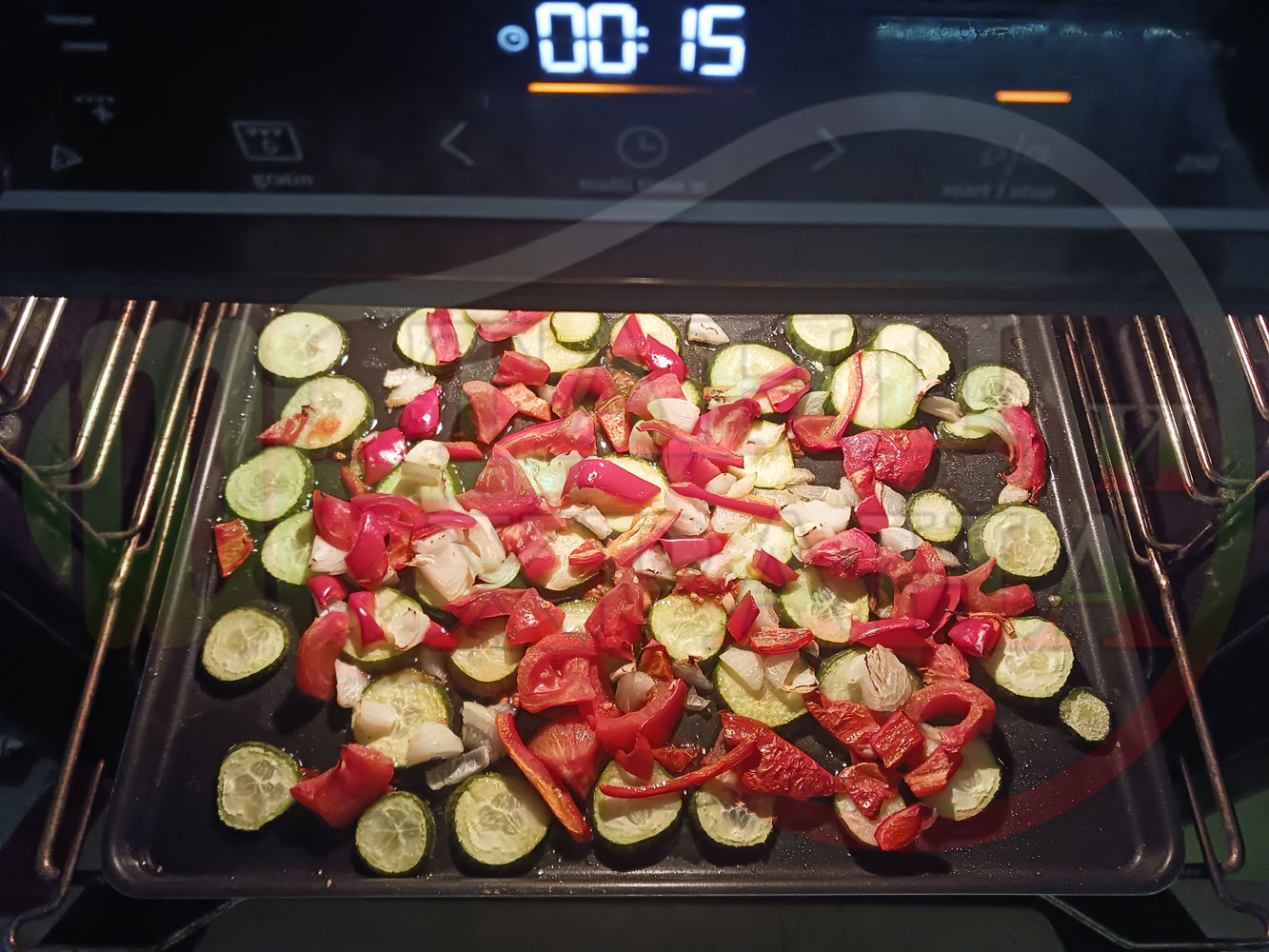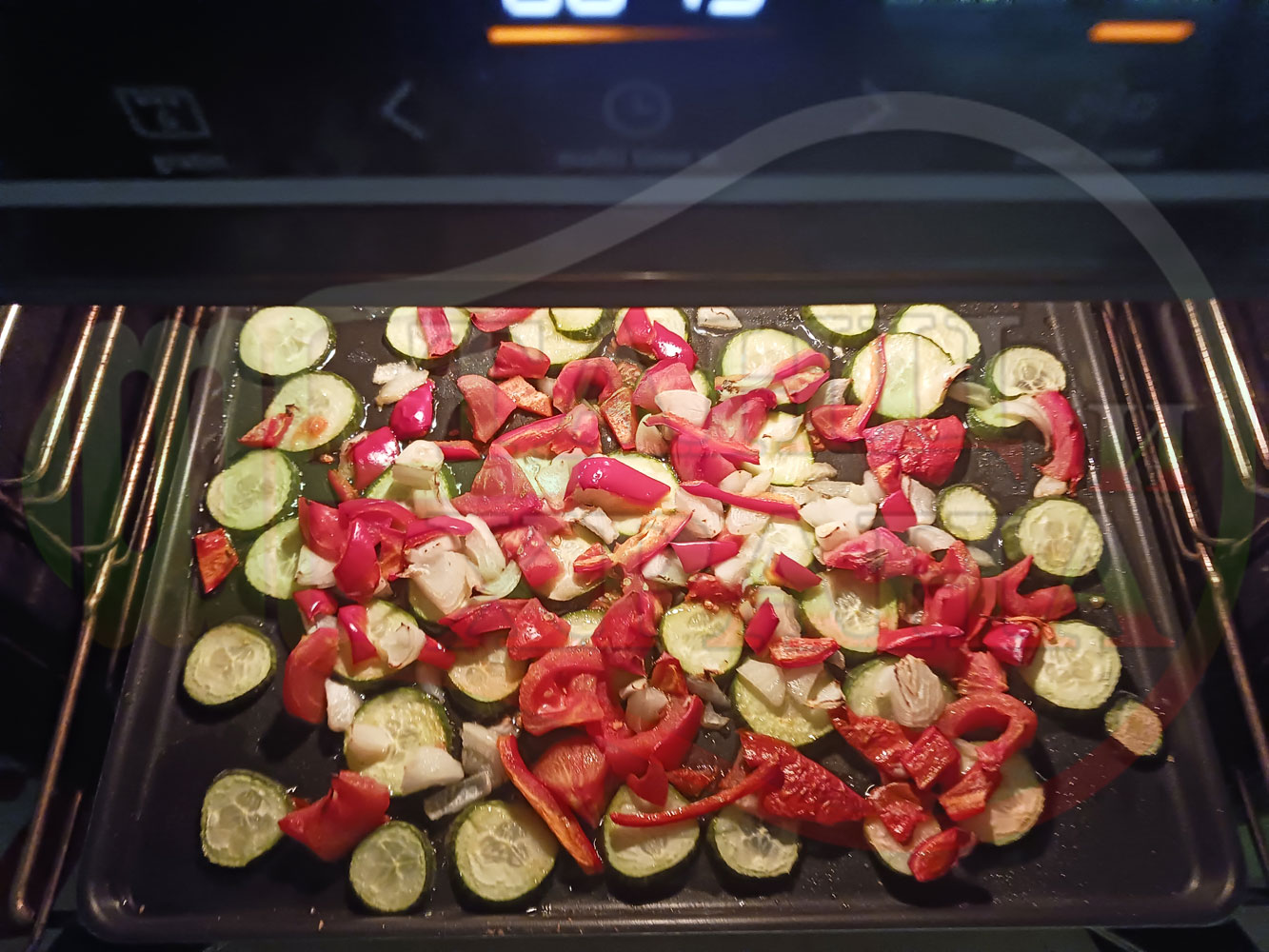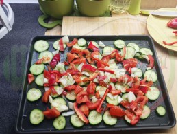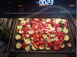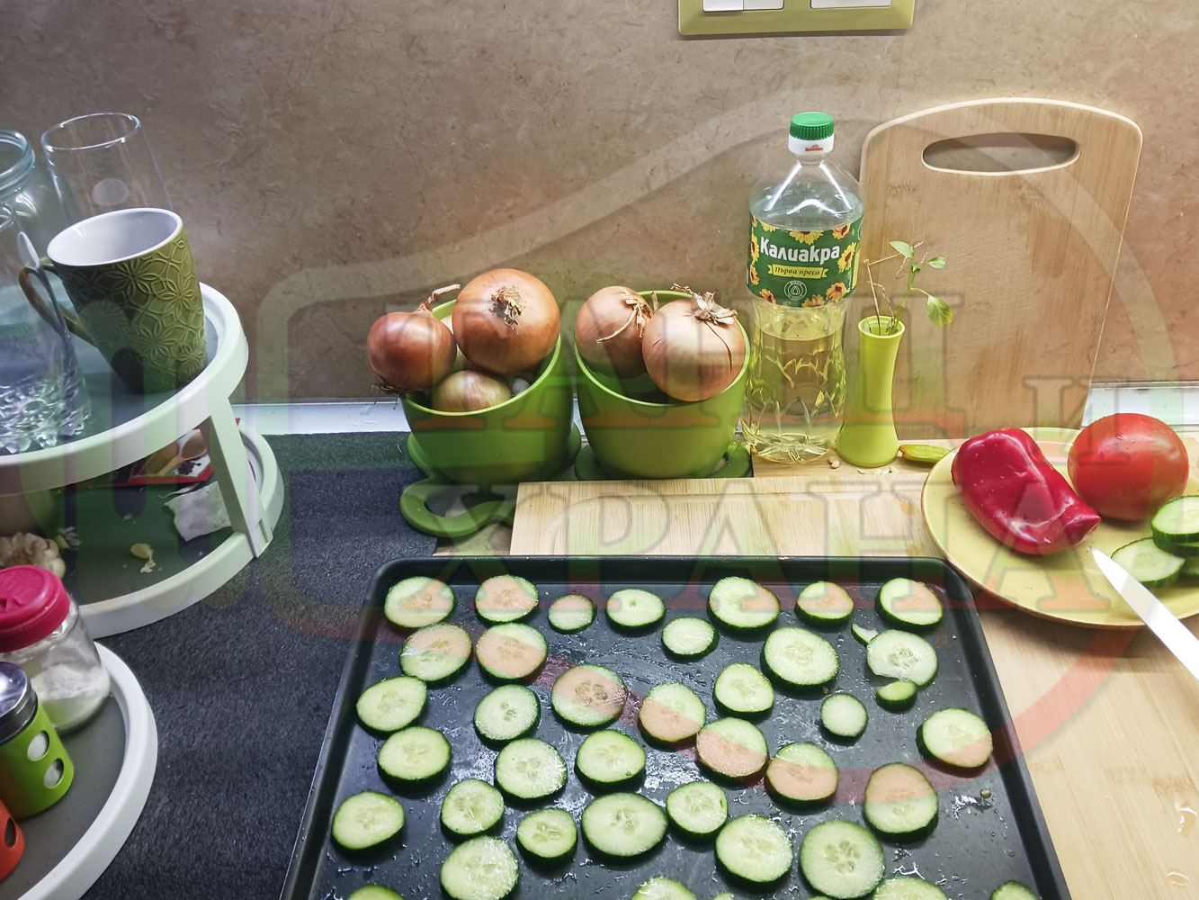 Измийте краставицата, нарежете я на кръгчета и я подредете в намазана със слънчогледово олио тава за печене заедно с измития и нарязан на средни по големина парченца домат (запазете кръгчета от краставицата за украса). Измийте чушката, отстранете семките, нарежете я на средни по големина парченца и ги сипете в тавата заедно с обеления, измит и нарязан на различни по големина парченца кромид лук (нарежете част от чушката на ивички и запазете връхчетата за украса). Разбъркайте и поставете тавата в предварително загрятата фурна (загрейте я за поне 5 минути). Запържете и задушете зеленчуците на фурна без вентилатор на 180 градуса за около 30 минути.