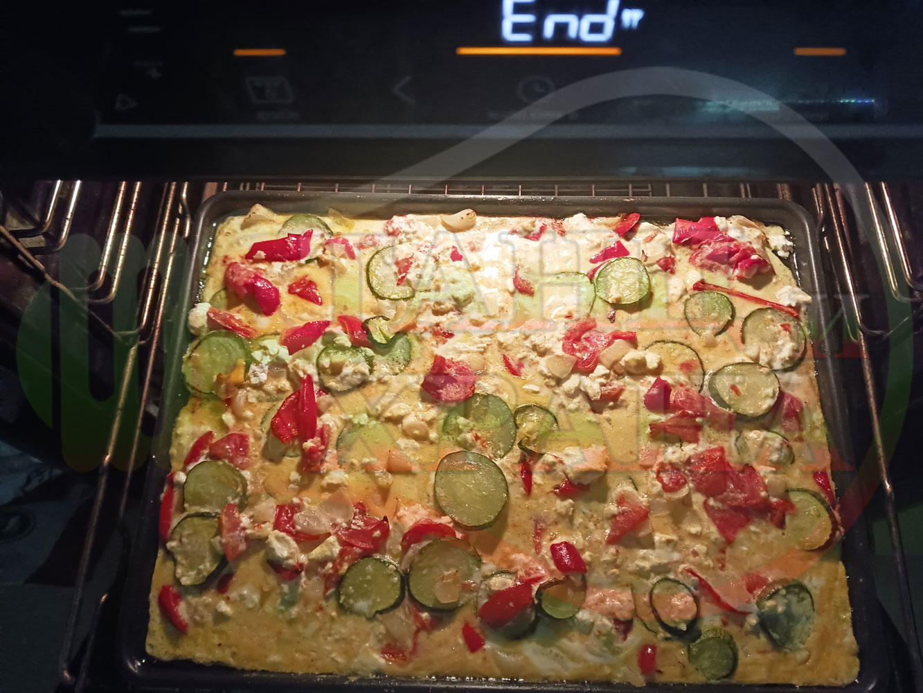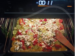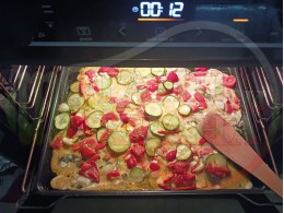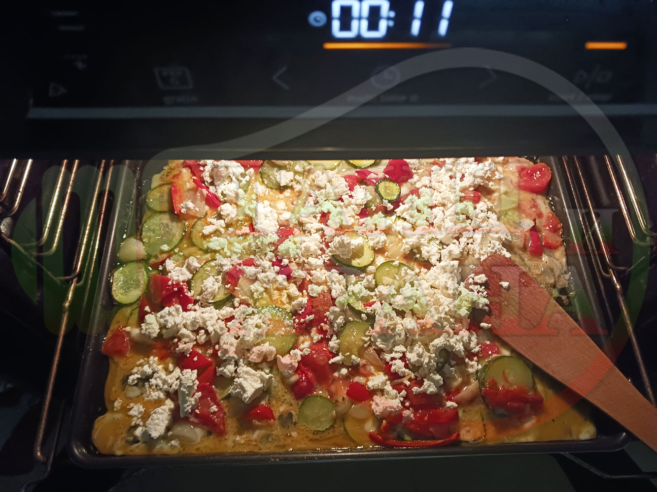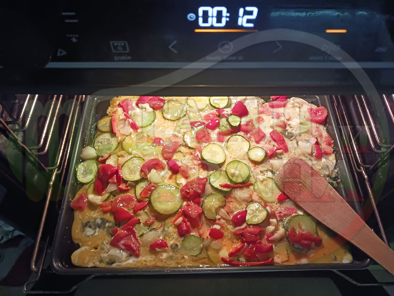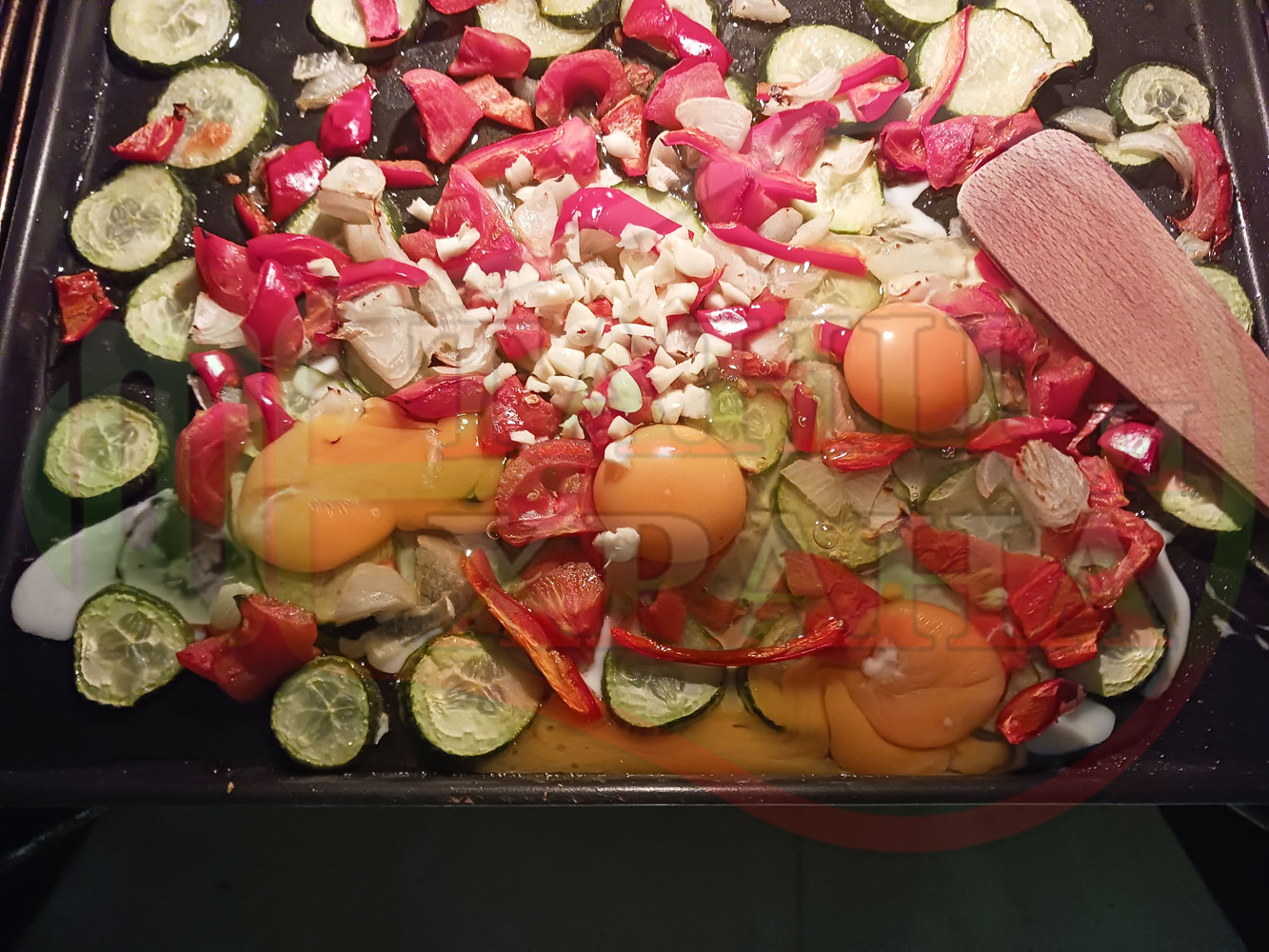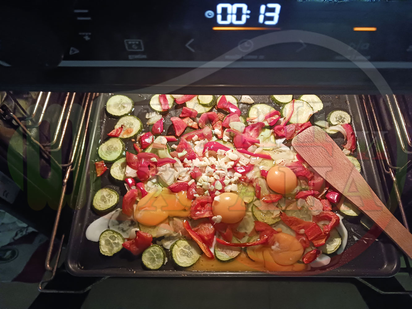 ВНИМАНИЕ: Фурните са различни и съответно времето за запичане е ориентировъчно. Наблюдавайте процеса на запичане и при необходимост, покрийте с хартия или фолио за печене. Разбърквайте яйцата след добавянето им за да не се "споят" и да станат на яйчена пита.
