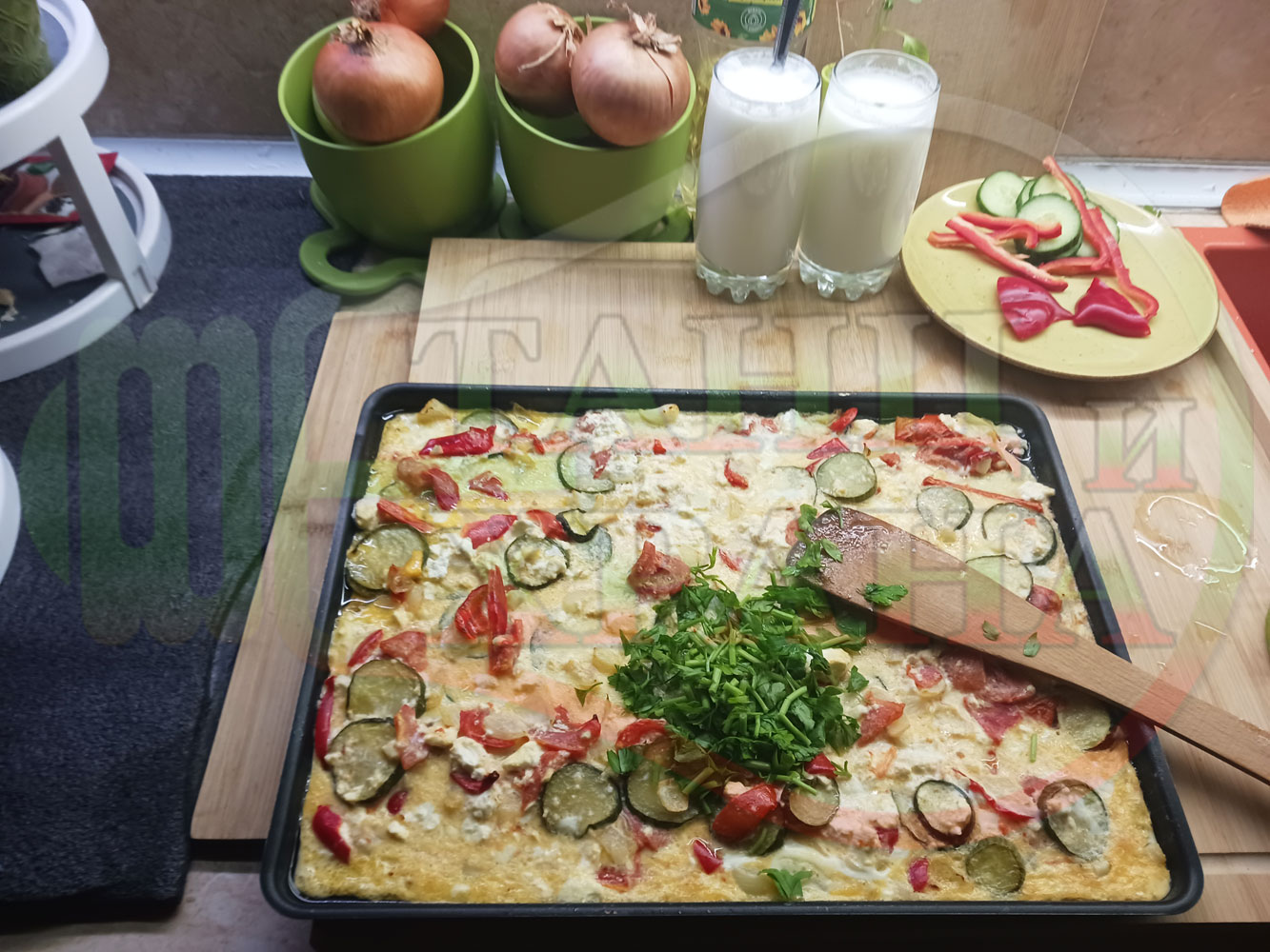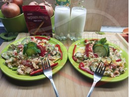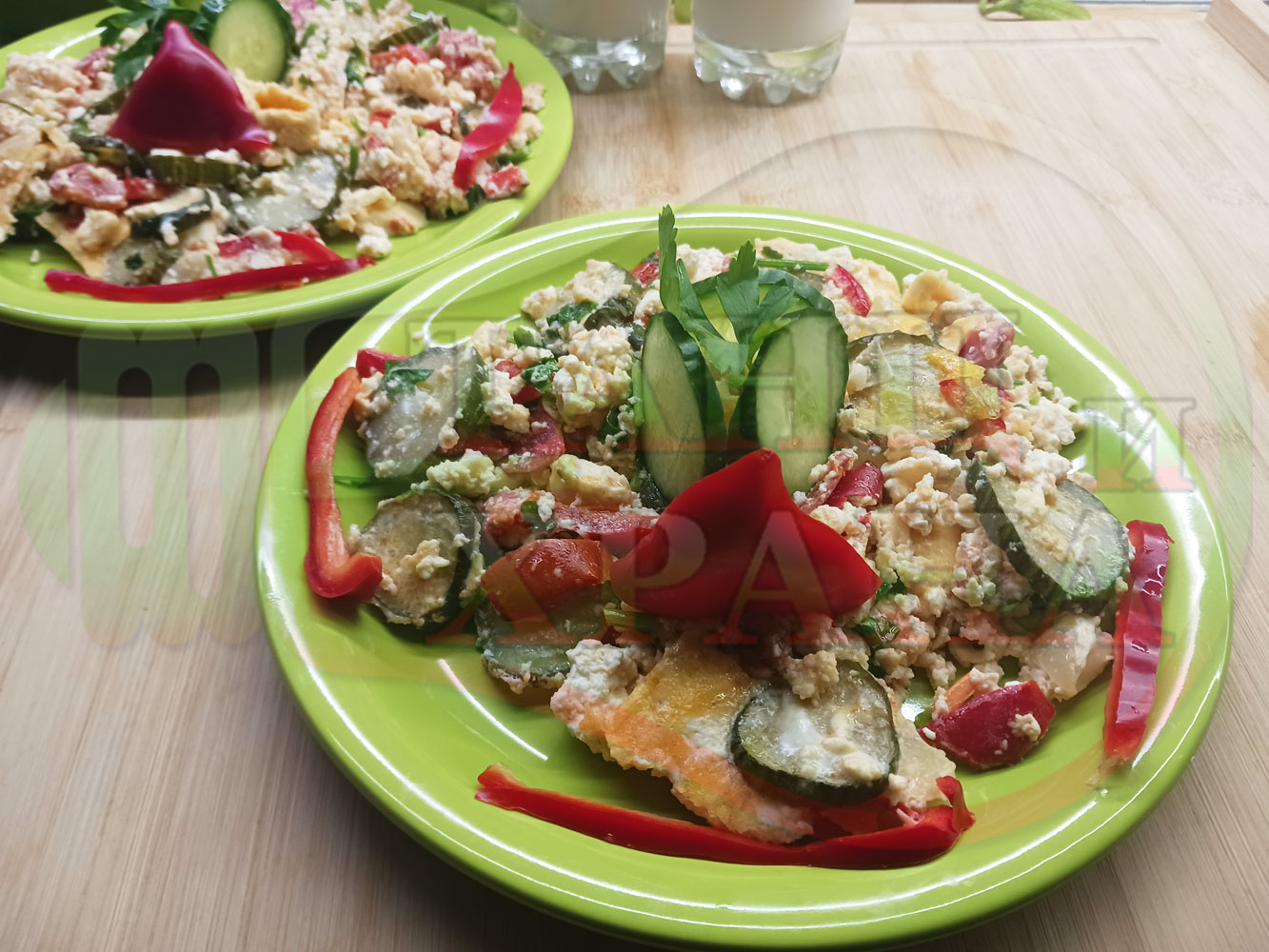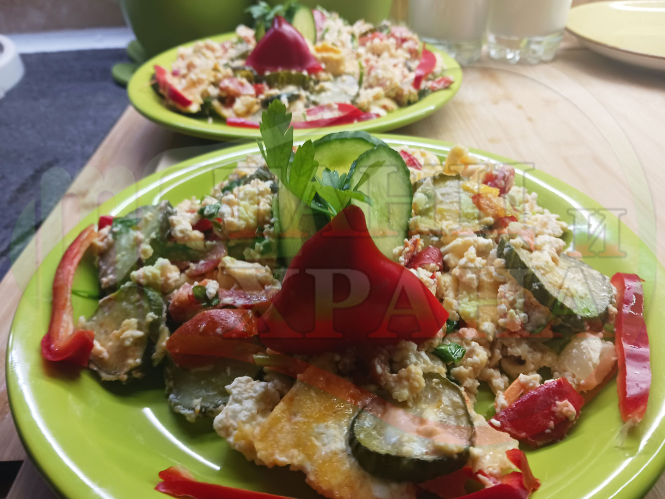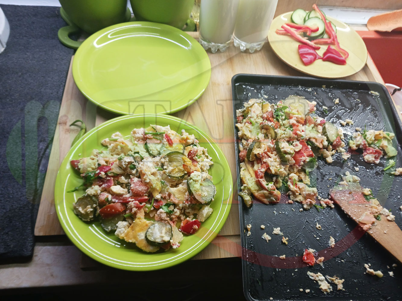 Български бъркани яйца "Яйчена краставична мишмашовица с БГсирене" приготвени на фурна с краставици, червени пресни чушки, домати, кромид лук, стар чесън, свеж магданоз и краве бяло сирене (българско, саламурено)