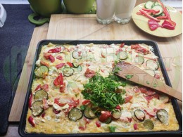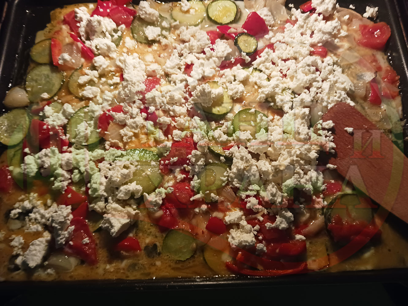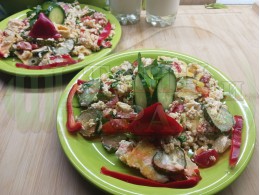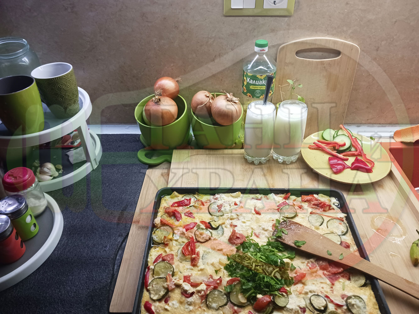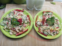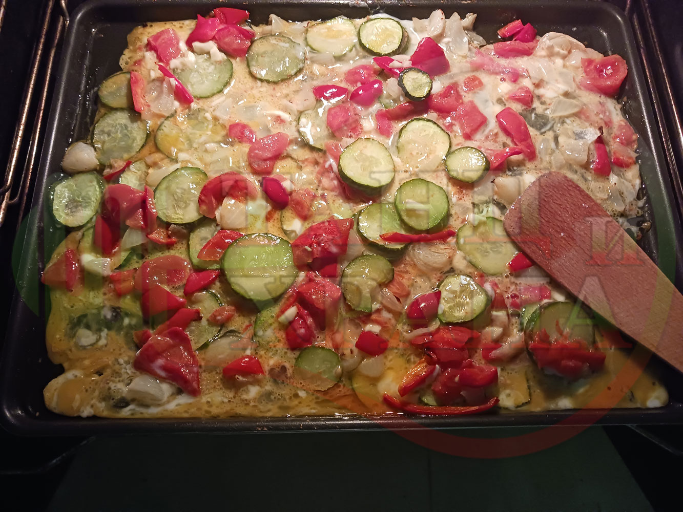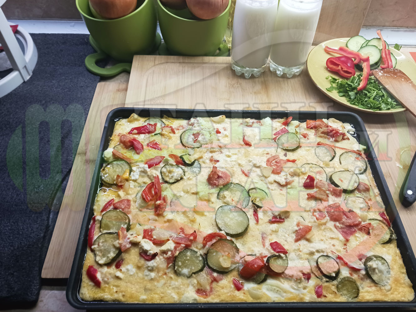 Български бъркани яйца "Яйчена краставична мишмашовица с БГсирене" приготвени на фурна с краставици, червени пресни чушки, домати, кромид лук, стар чесън, свеж магданоз и краве бяло сирене (българско, саламурено)