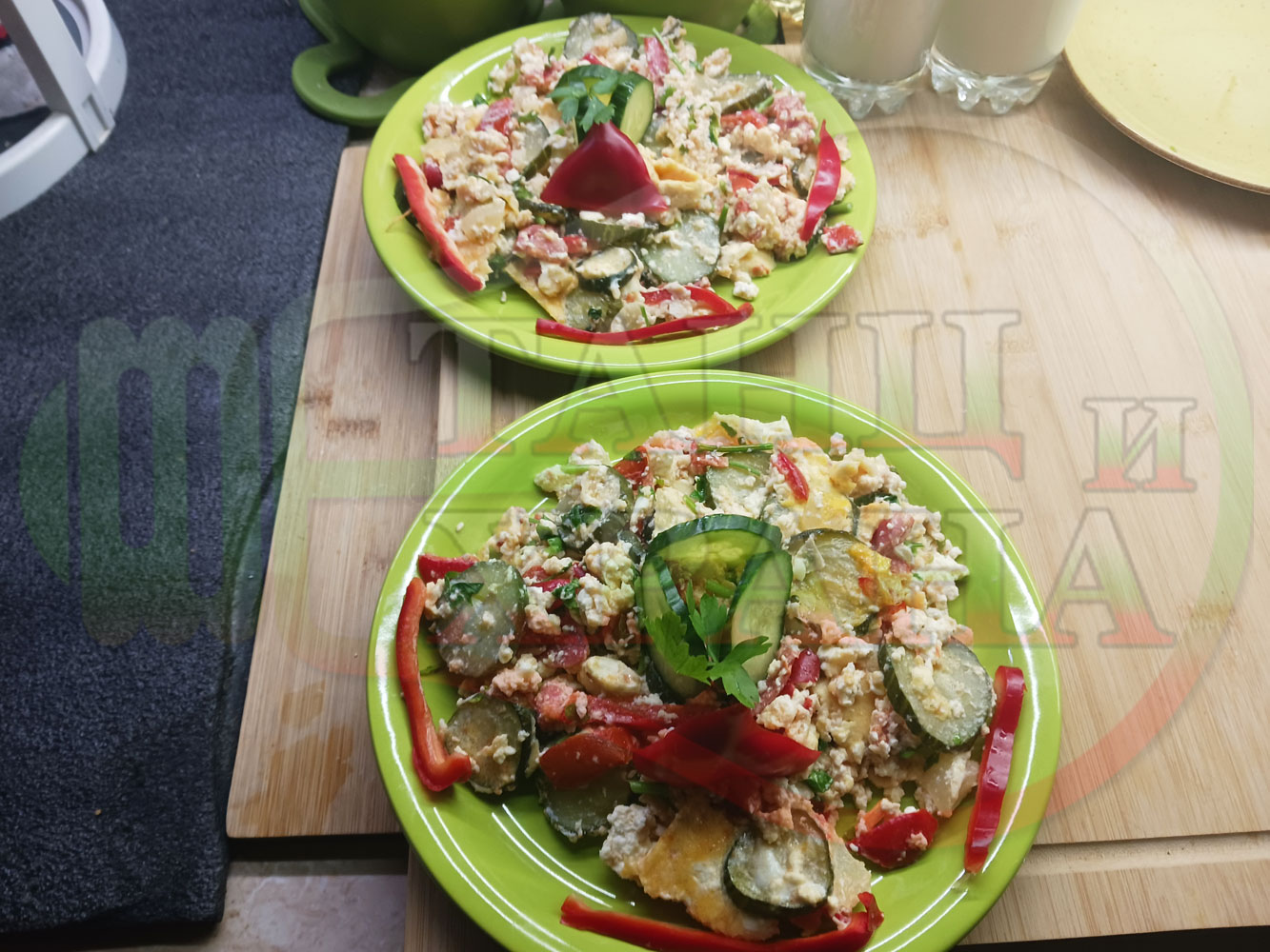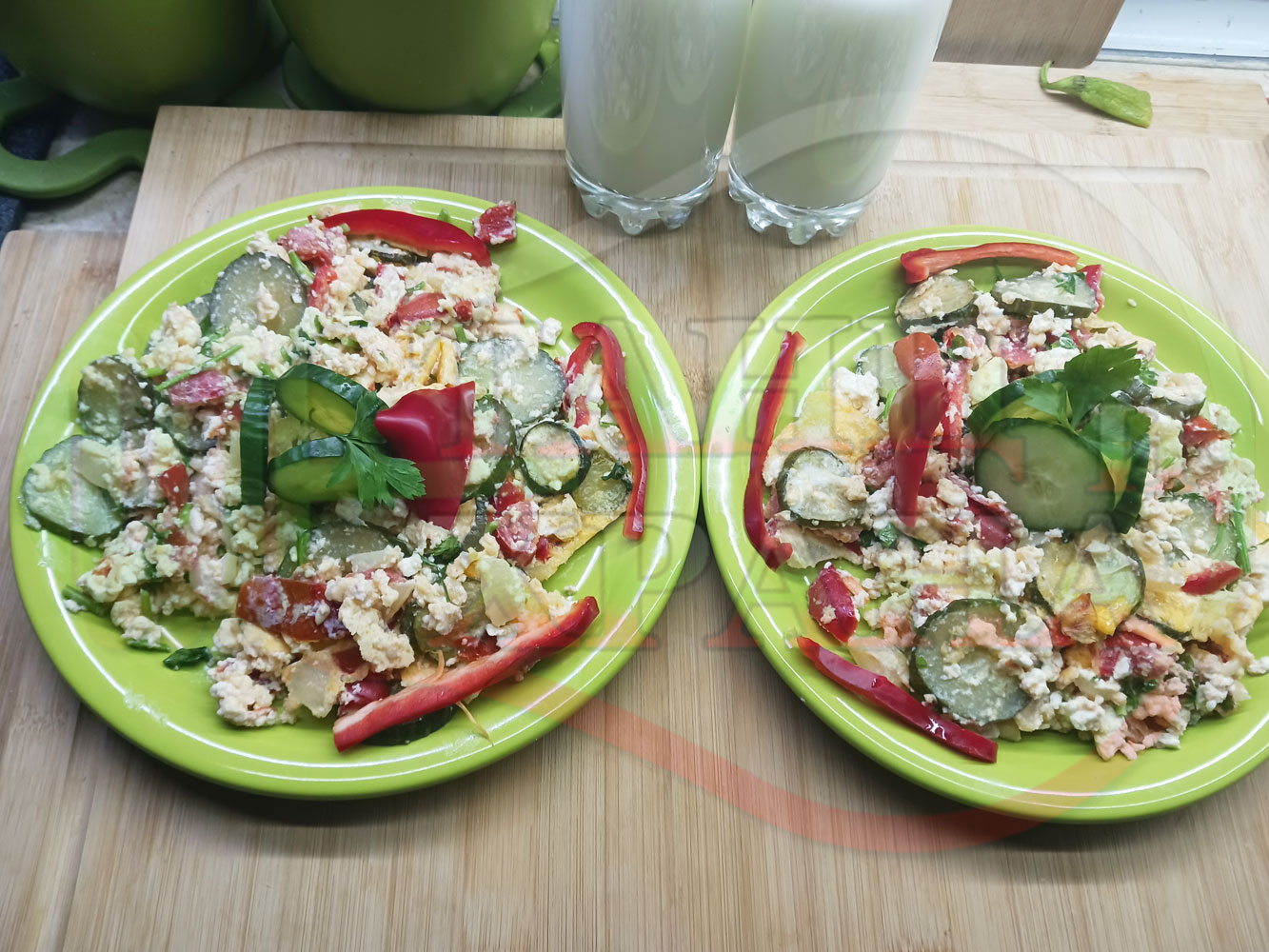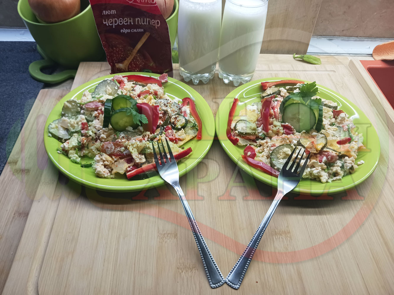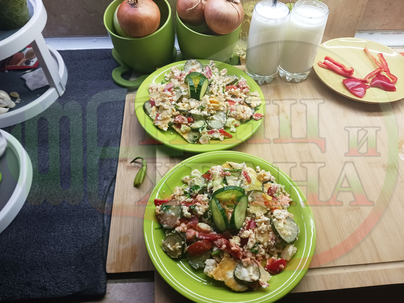 Спретнах яйчена бърканица с краставици, домати, червени пресни чушки, кромид лук, магданоз, чесън и българско краве бяло сирене. В кухнята се носи аромат на запечени и съвсем леко карамелизирани пиперки с кромид лук... Ммммм... отново се получи невероятна вкусно, вкусна, вкусотия (вкуснотия).