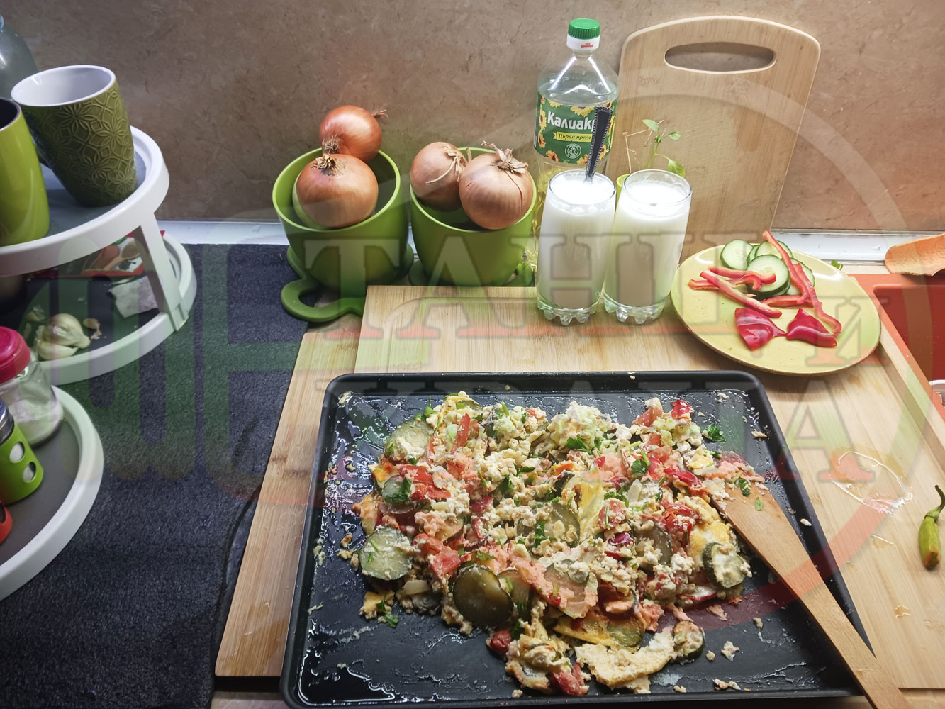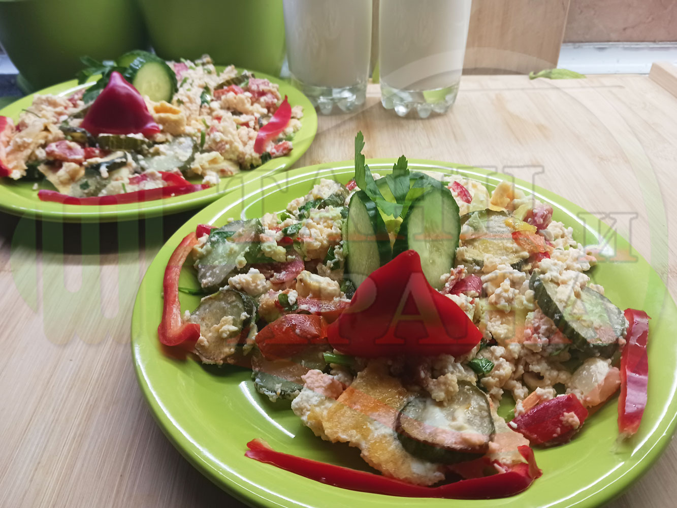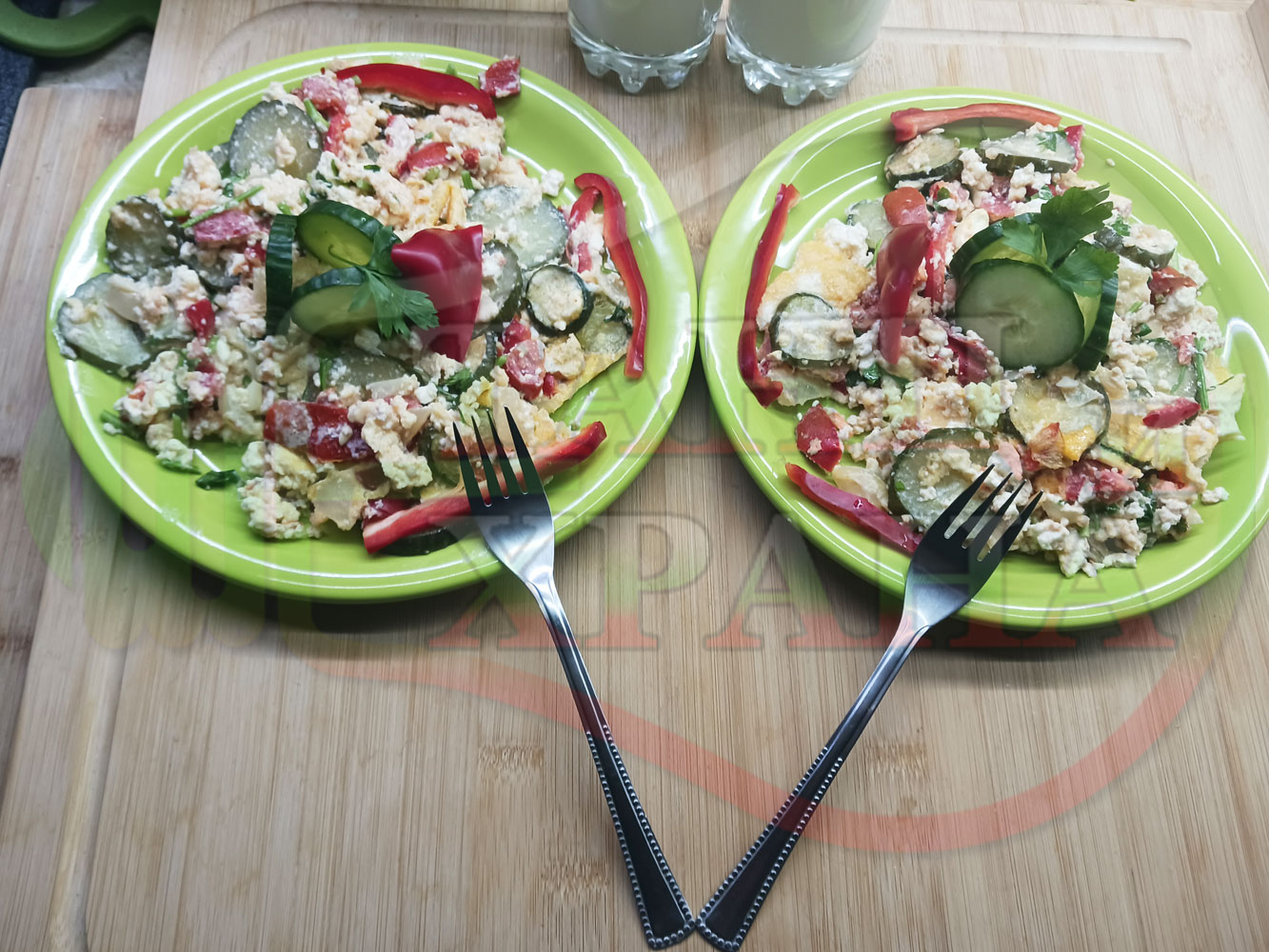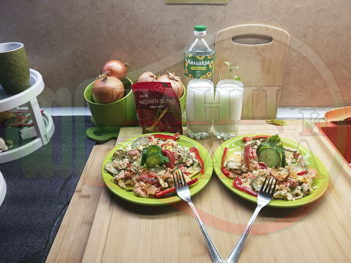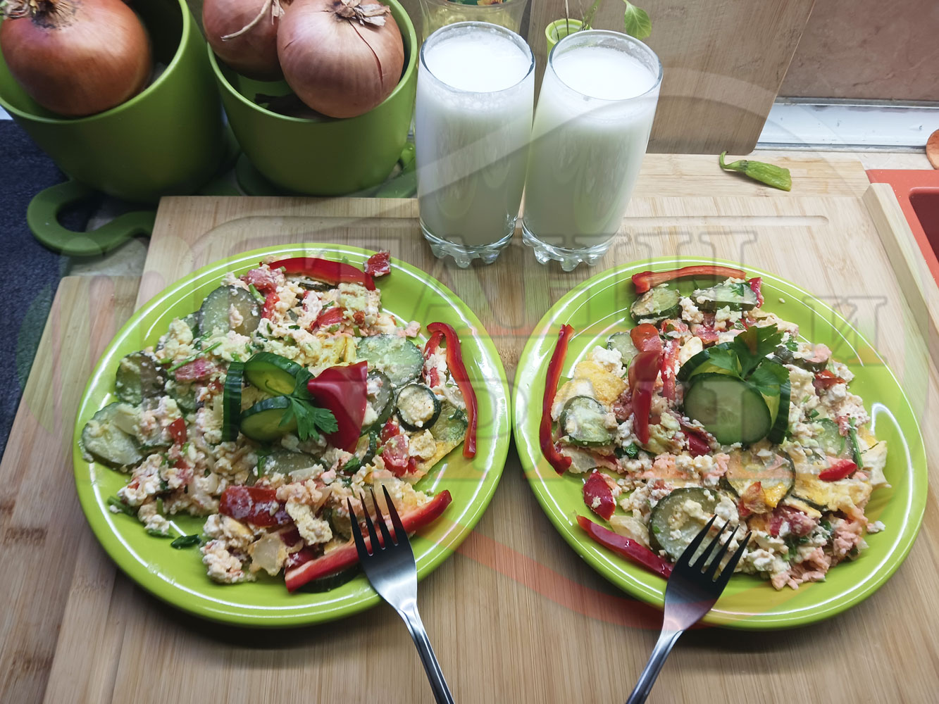 Спретнах яйчена бърканица с краставици, домати, червени пресни чушки, кромид лук, магданоз, чесън и българско краве бяло сирене. В кухнята се носи аромат на запечени и съвсем леко карамелизирани пиперки с кромид лук... Ммммм... отново се получи невероятна вкусно, вкусна, вкусотия (вкуснотия).