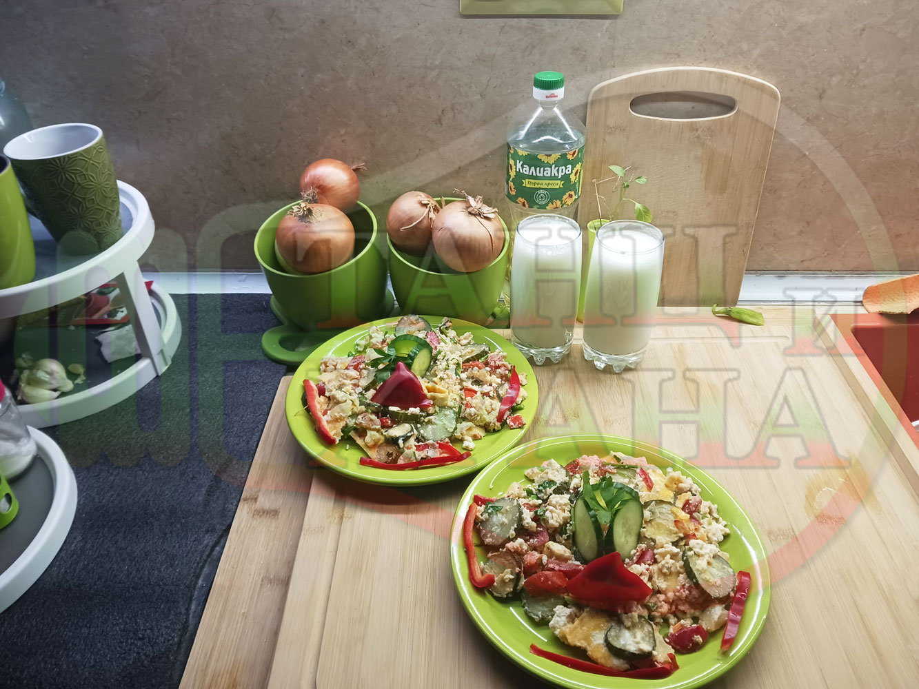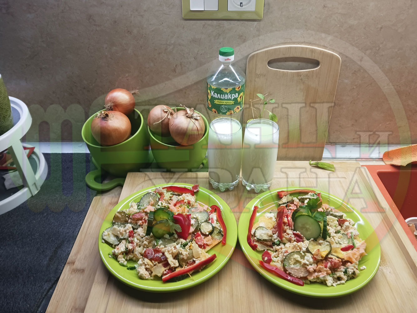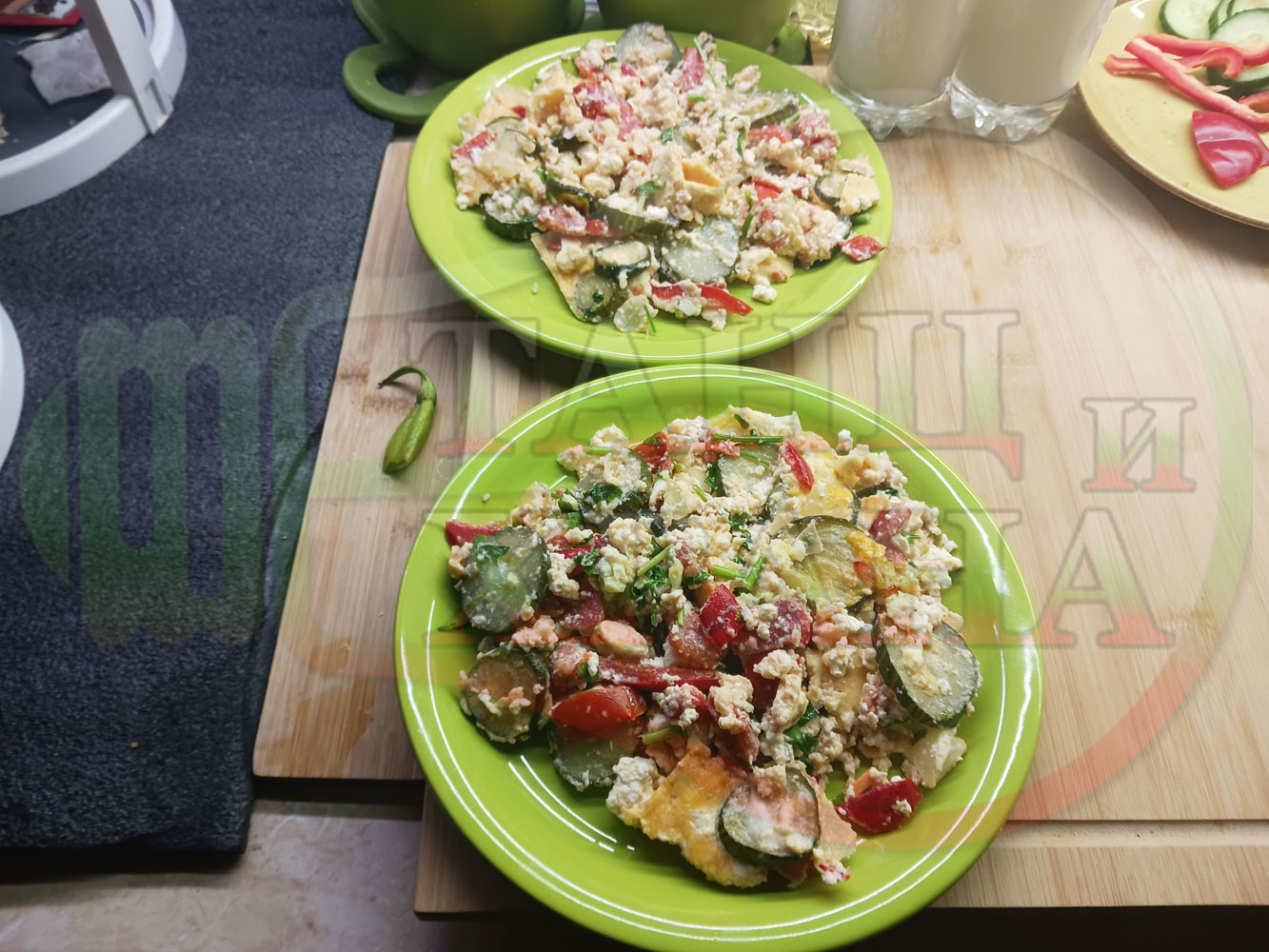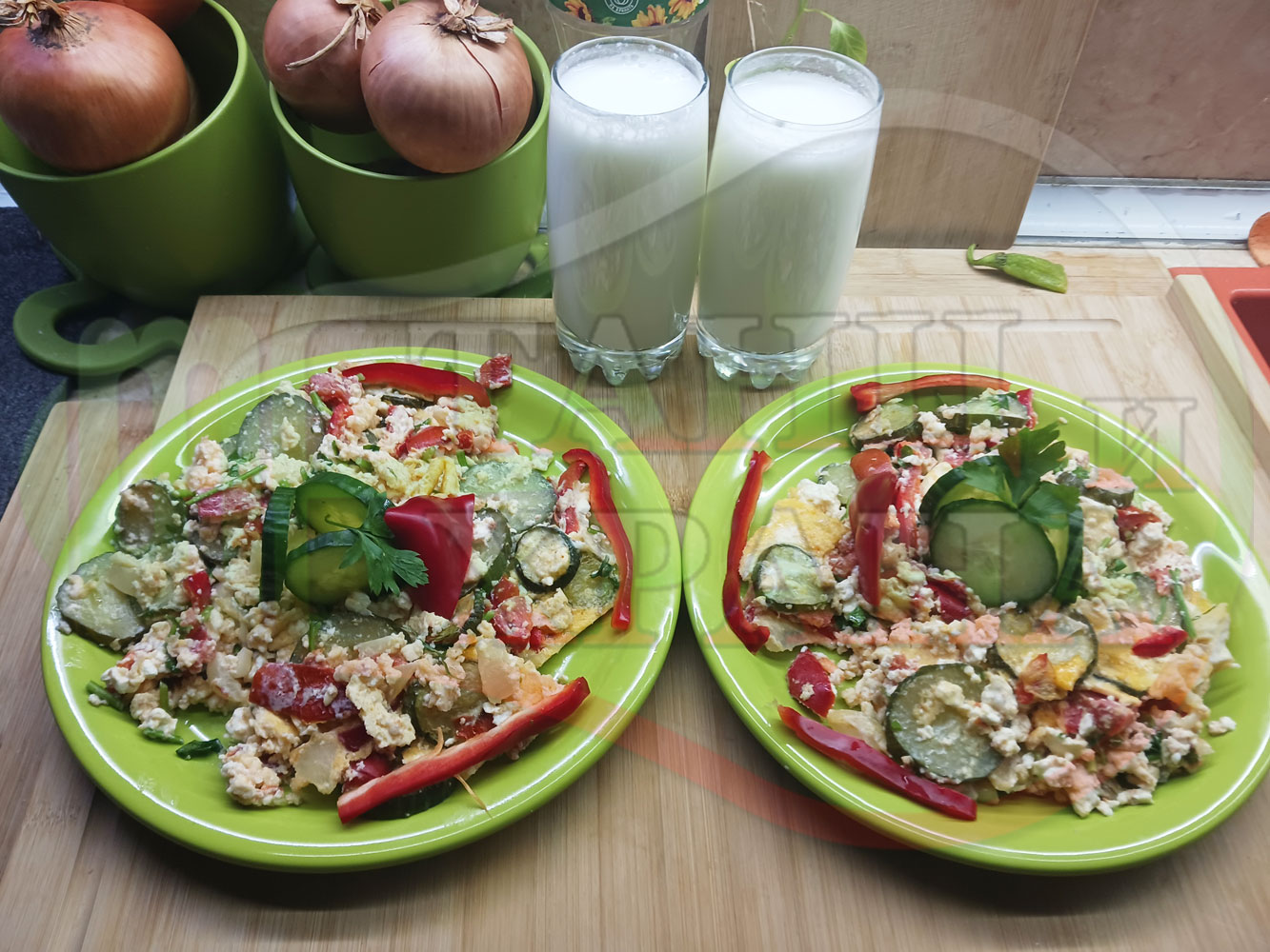Спретнах яйчена бърканица с краставици, домати, червени пресни чушки, кромид лук, магданоз, чесън и българско краве бяло сирене. В кухнята се носи аромат на запечени и съвсем леко карамелизирани пиперки с кромид лук... Ммммм... отново се получи невероятна вкусно, вкусна, вкусотия (вкуснотия).