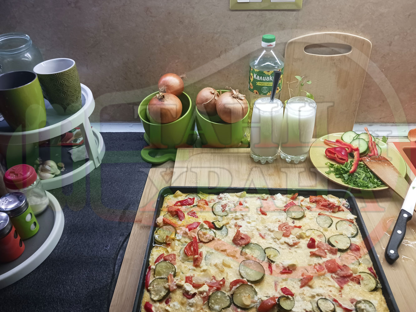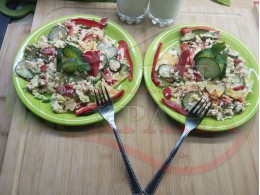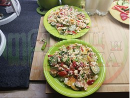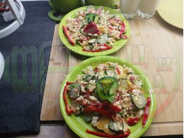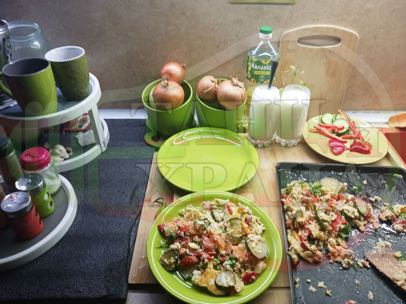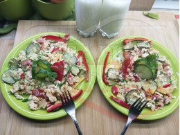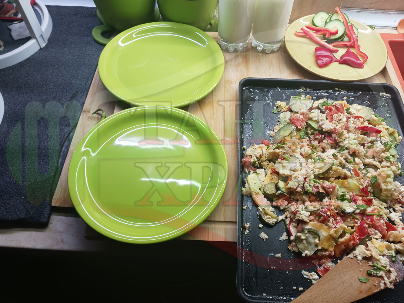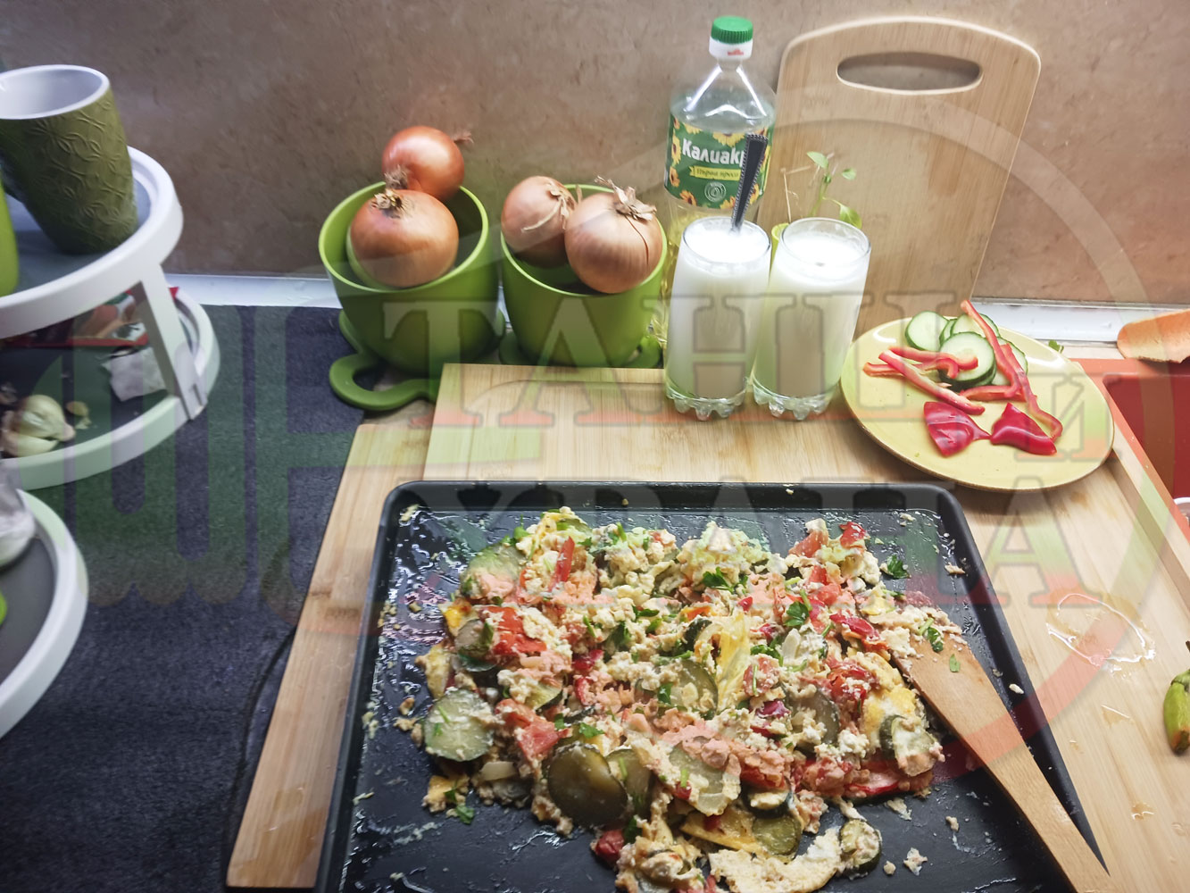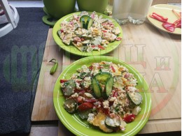 Спретнах яйчена бърканица с краставици, домати, червени пресни чушки, кромид лук, магданоз, чесън и българско краве бяло сирене. В кухнята се носи аромат на запечени и съвсем леко карамелизирани пиперки с кромид лук... Ммммм... отново се получи невероятна вкусно, вкусна, вкусотия (вкуснотия).