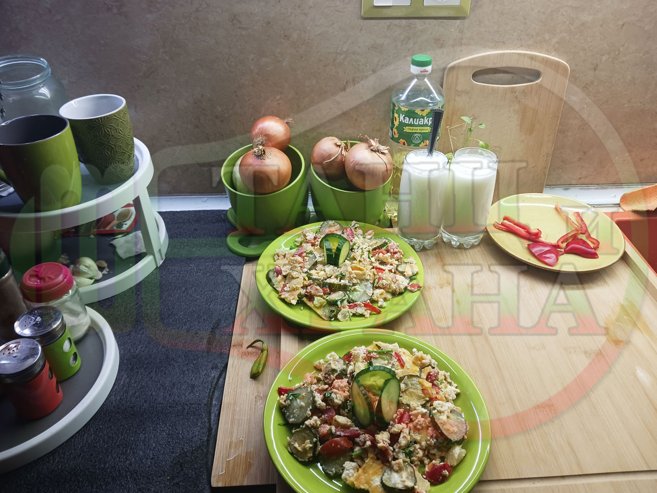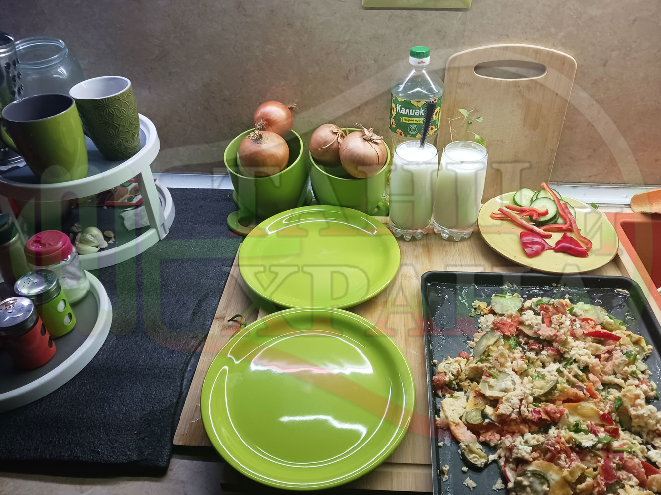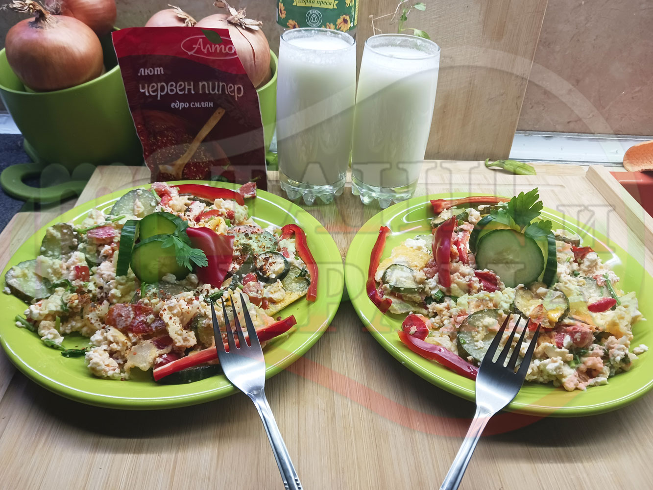 ПРОДУКТИ: Приблизителни количества за български бъркани яйца "Яйчена краставична мишмашовица с БГсирене" приготвени на фурна с краставици, червени пресни чушки, домати, кромид лук, стар чесън, свеж магданоз и краве бяло сирене (българско, саламурено)
