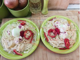 Спретнах производни спагети с топчета от сиреново червеночушков яйчен крем от основно сварените спагети със зелени пресни чушки и кромид лук "Скумриевобосилекови зеленочушкови" и снимките от сваряването на спагетите са към рецептата за сумриевобосилековите спагети. Производните спагети са двукомпонентни и се състоят от сварен и суров елемент приготвен с червени пресни чушки, яйце и българско краве бяло сирене. Сиреново червеночушковите топчета обогатяват вкуса на спагетите с едни от най-обичаните български продукти и в комбинация с яйцата са изключително вкусни. Гарнирах порциите с по 1 цяло сварено яйце, което набавя необходимите животински протеини за деня. Отново се получи голяма вкусно, вкусна, вкусотия (вкуснотия).