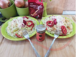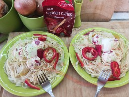 Добавете червен лют и/или сладък пипер при сваряването на спагетите и/или поръсете готовите порции на вкус.