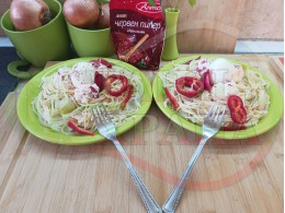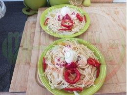 Български спагети на фурна "Варенояйчени зеленочервеночушкови с БГсирене" сварени с кромид лук и зелени пресни чушки гарнирани с топчета от сиреново червеночушков крем с червени пресни чушки и краве бяло сирене и с цели варени яйца - производни