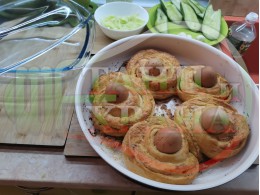 Вземате кръглите топки и ги разтегляте на фитили с въртеливи движения на ръцете. Оформяте дълги фитили колкото позволява заделеното тесто. Фитилите ги разтегляте или разточвате на ширина. Ширината не е голяма, гледате да е достатъчна за да поръсите с плънката. Добавяте парченца масло и поръсвате с червен пипер. Затваряте двата края на фитилите по цялата дължина с притискане с пръсти. Навивате фитилите на кравайче като започвате от единия край.