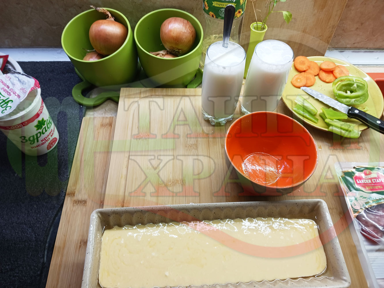 ПРОДУКТИ: Приблизителни количества за яйчено руло "Саламеноколбасово зеленочушково киселомлечно с БГсирене" приготвено с яйчено млечна заливка от яйца, краве бяло сирене (българско, саламурено), чесън и кисело мляко от България запечено на фурна със зелени пресни чушки и колбасов салам
