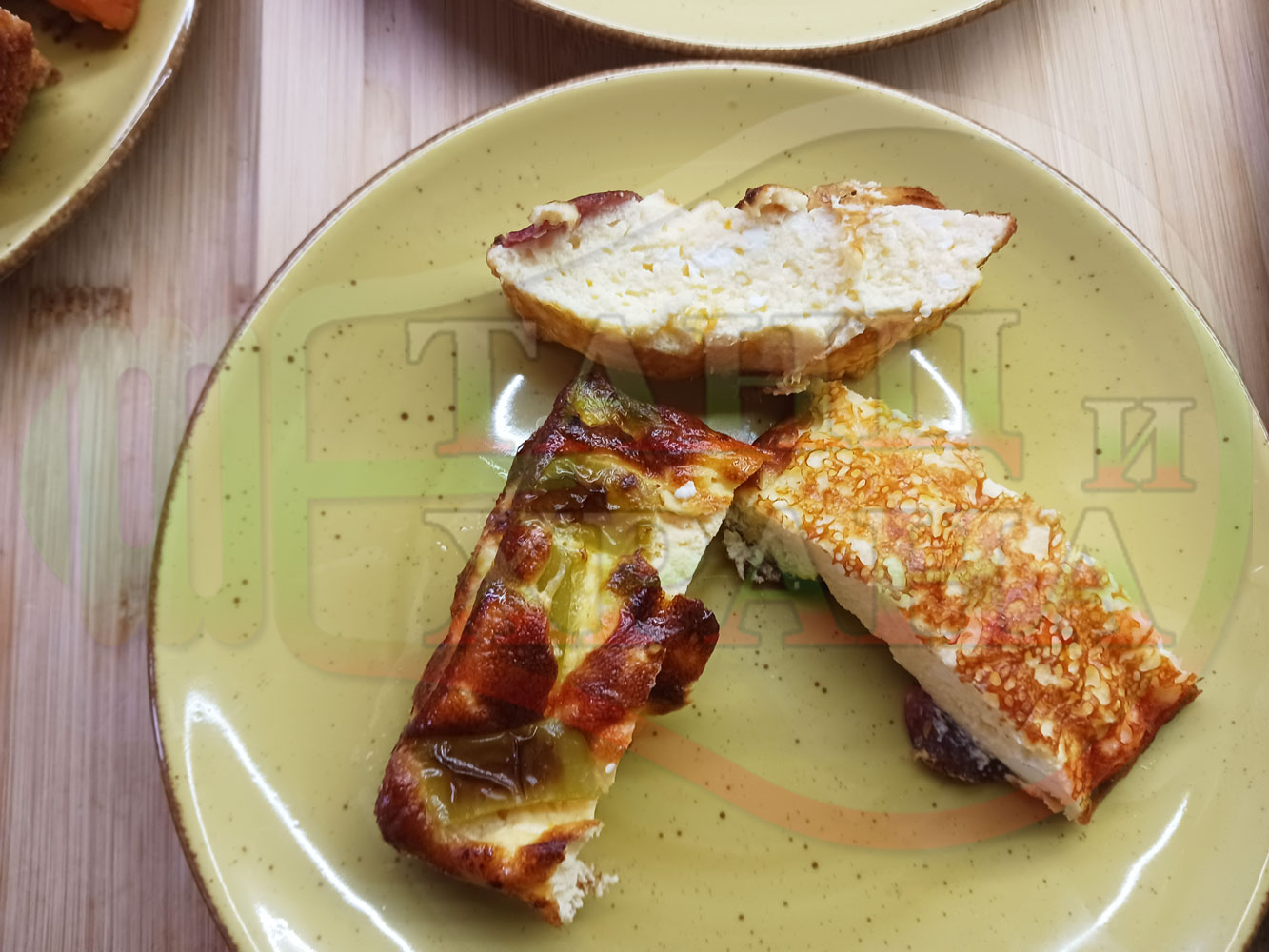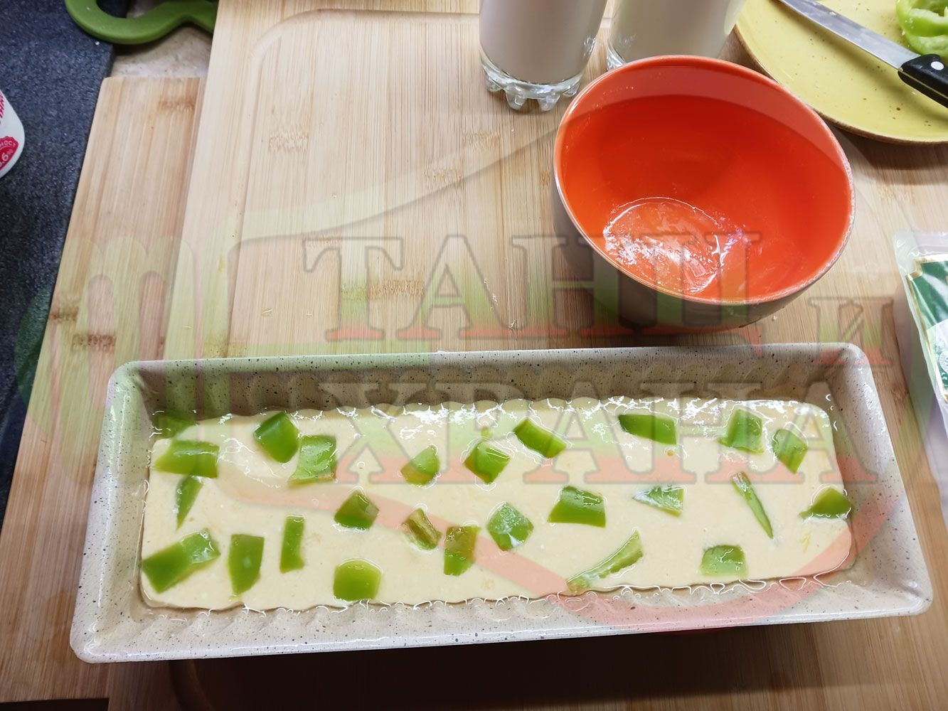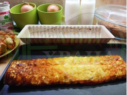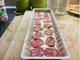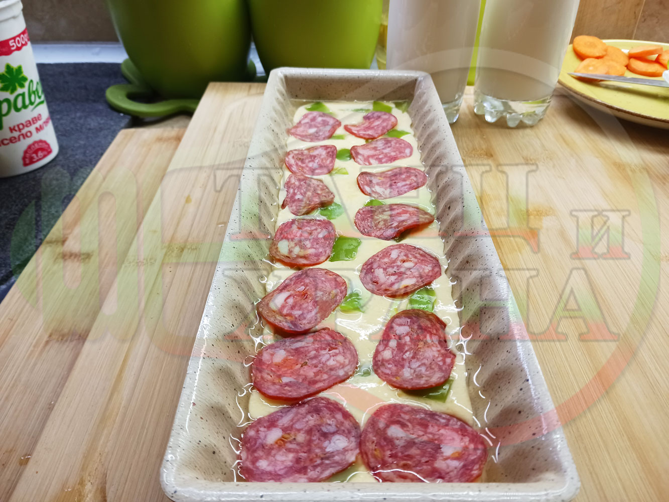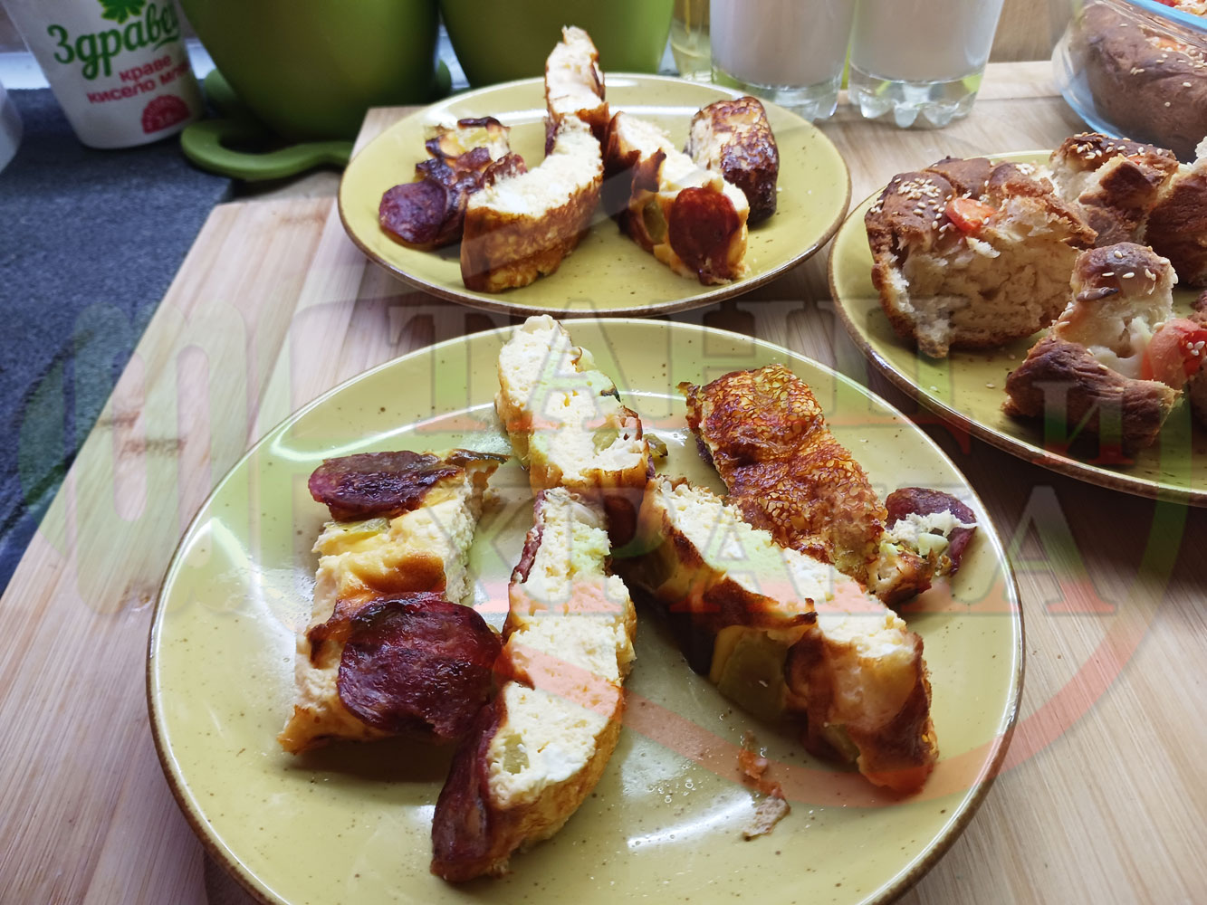 Яйчено руло "Саламеноколбасово зеленочушково киселомлечно с БГсирене" приготвено с яйчено млечна заливка от яйца, краве бяло сирене (българско, саламурено), чесън и кисело мляко от България запечено на фурна със зелени пресни чушки и колбасов салам