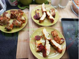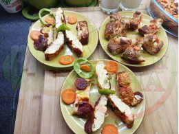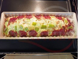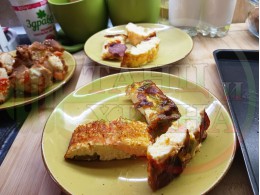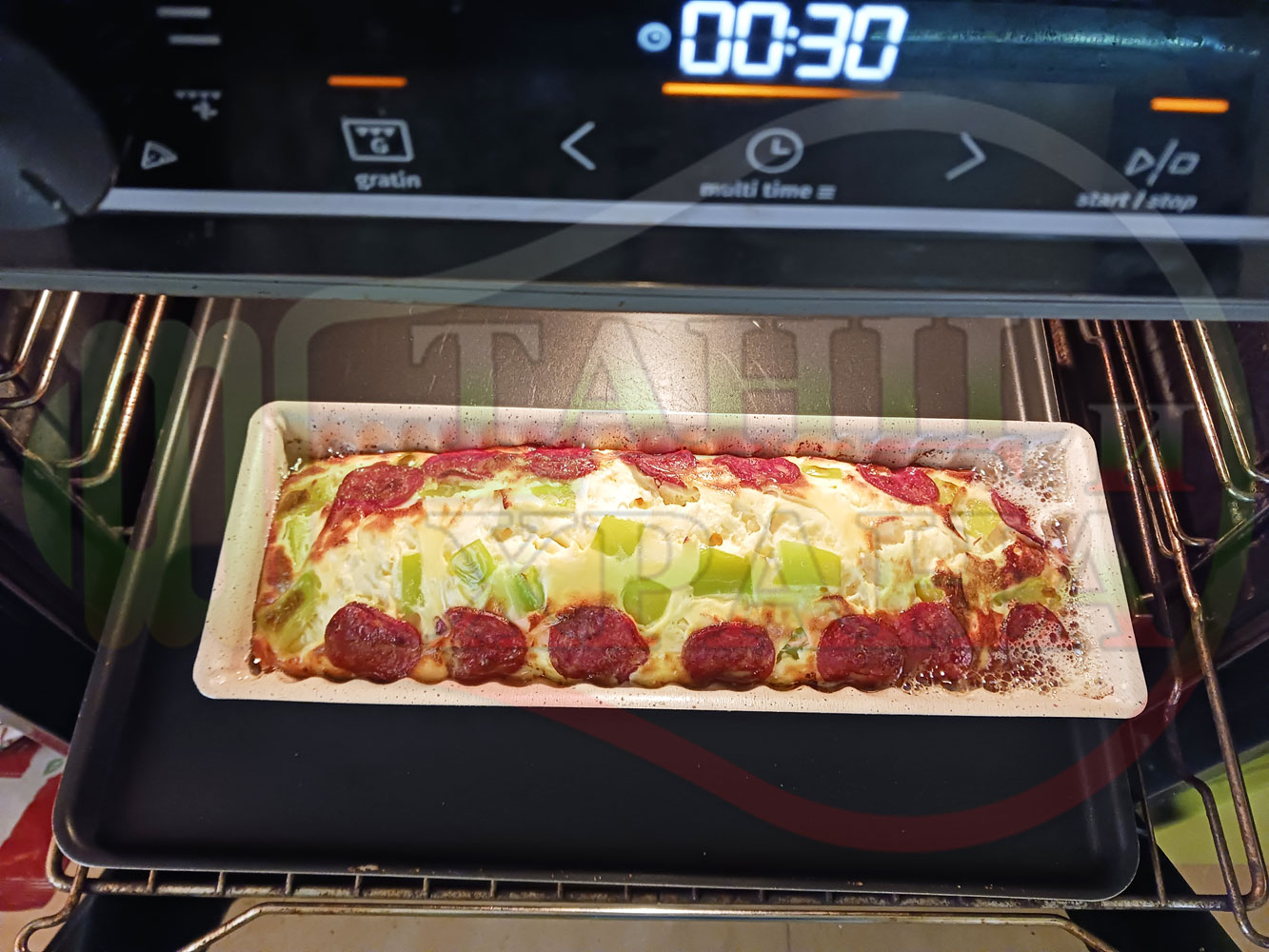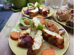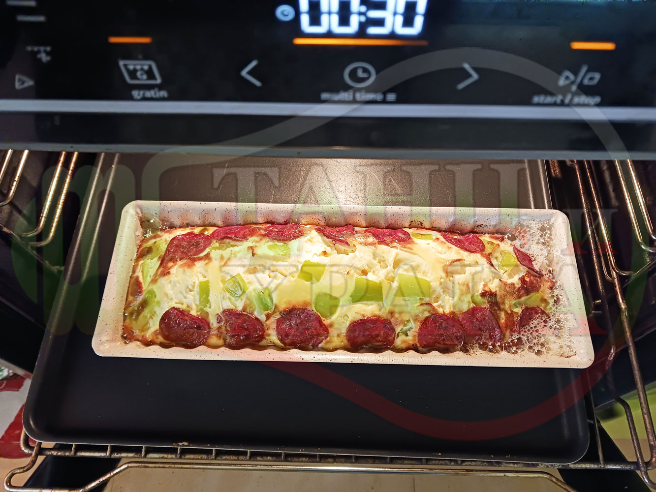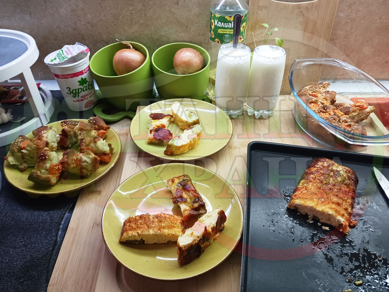 Яйчено руло "Саламеноколбасово зеленочушково киселомлечно с БГсирене" приготвено с яйчено млечна заливка от яйца, краве бяло сирене (българско, саламурено), чесън и кисело мляко от България запечено на фурна със зелени пресни чушки и колбасов салам