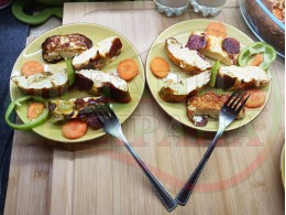 Извадете изпеченото руло от фурната, обърнете го и го нарежете на различни по дебелина парчета. Поставете по 5 парчета в чиниите и украсете порциите с чушковите обръчи, връхчета и с кръгчетата от измития и нарязан пресен морков в унисон с кравайния хляб с моркови (броят на парчетата, гарнирането и украсата са по ваше желание и усмотрение).