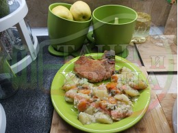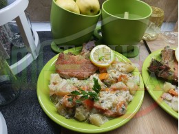 Свински пържоли "Краставични с моркови" запечени на фурна с пресни краставици, моркови, пресен лук и картофи със сметаново яйчена заливка със свеж магданоз гарнирани с резенчета лимон