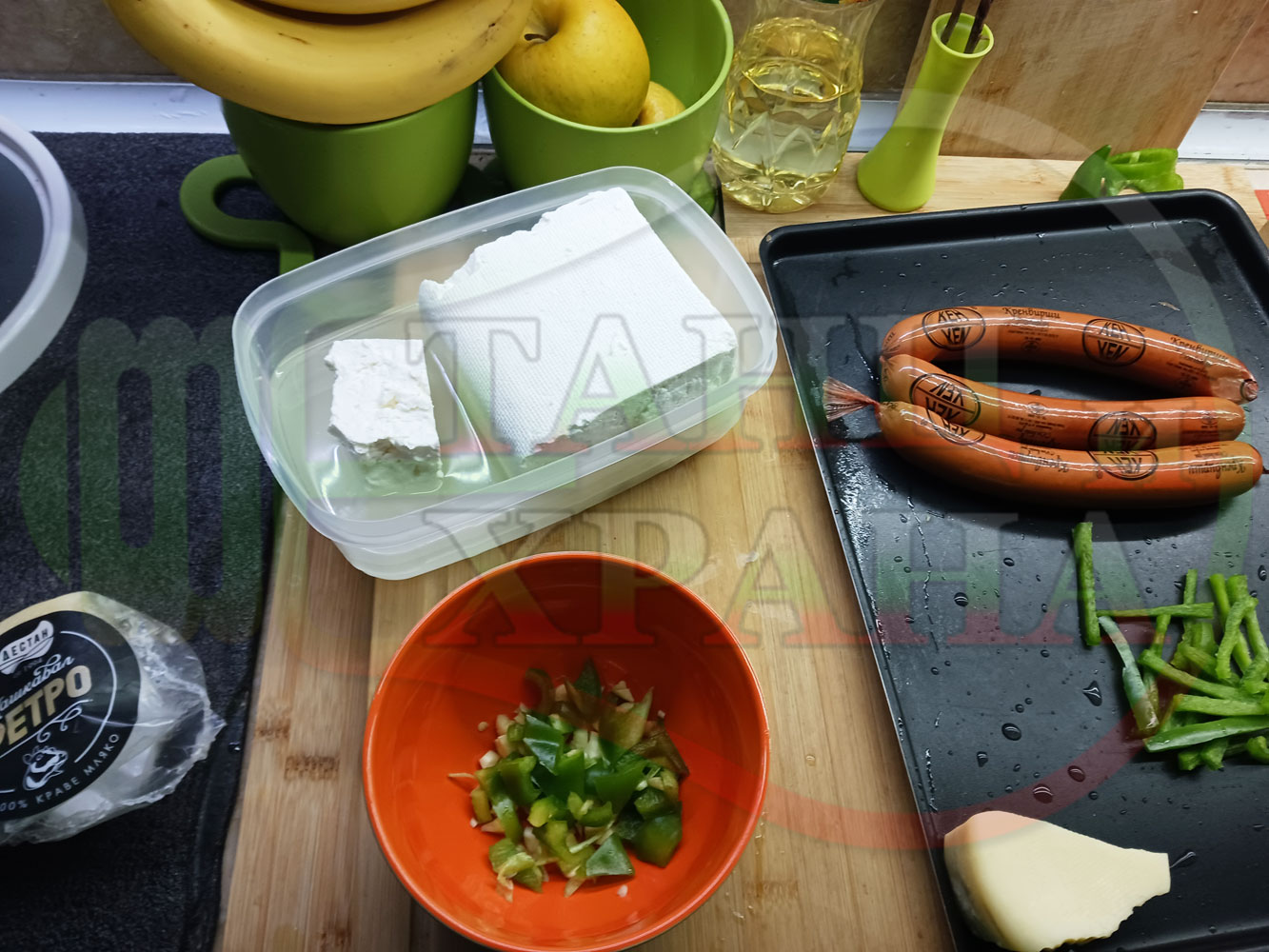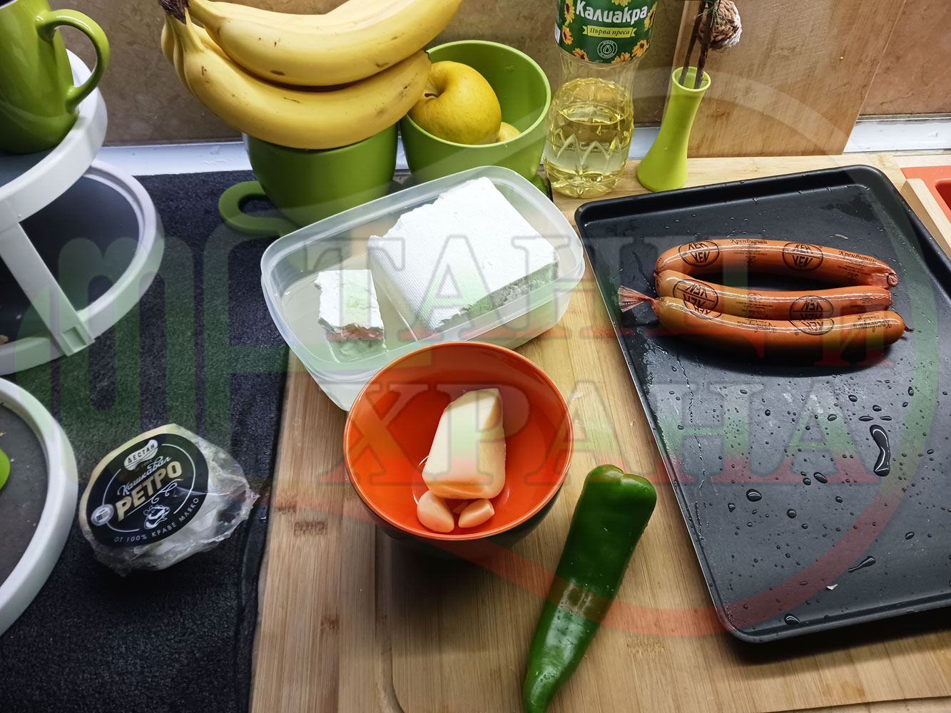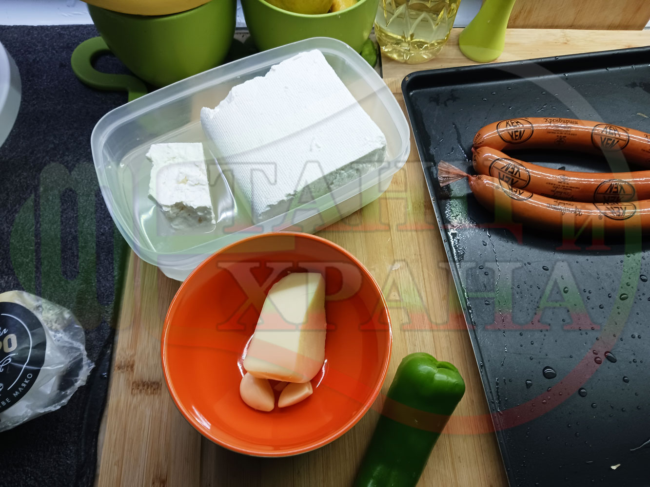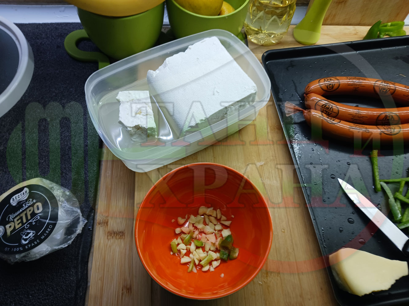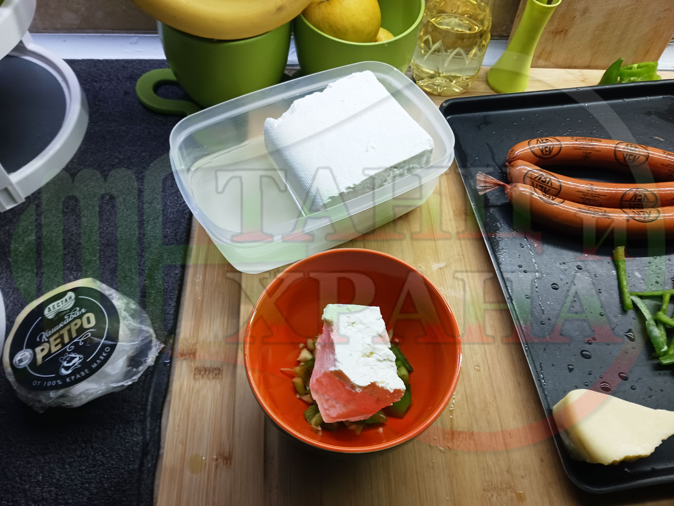 ПРОДУКТИ: Приблизителни количества за големи сиренови кюфтета "Кренвиршови зеленочушковокашкавалени с БГсирене" приготвени от яйца, зелени пресни чушки, стар чесън, кашкавал и краве бяло сирене (българско, саламурено) гарнирани и запечени на фурна с нарязани кренвирши