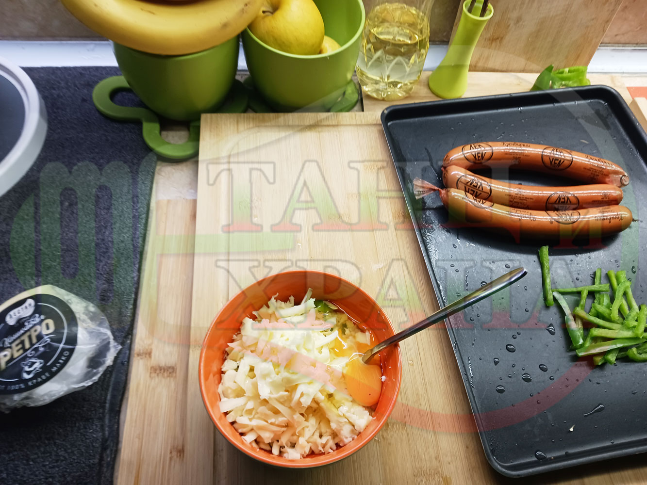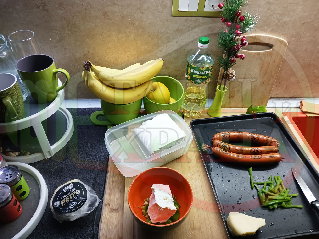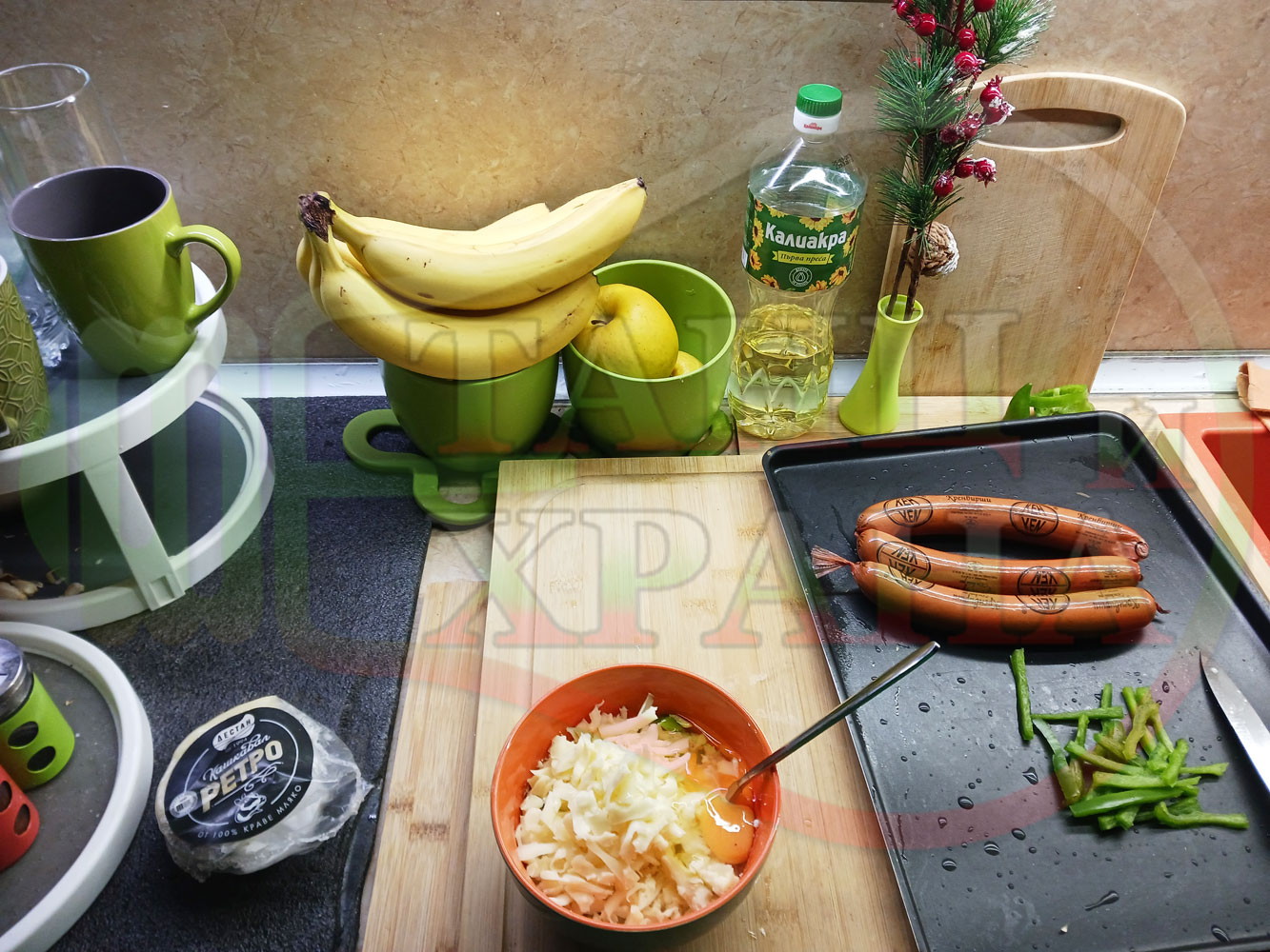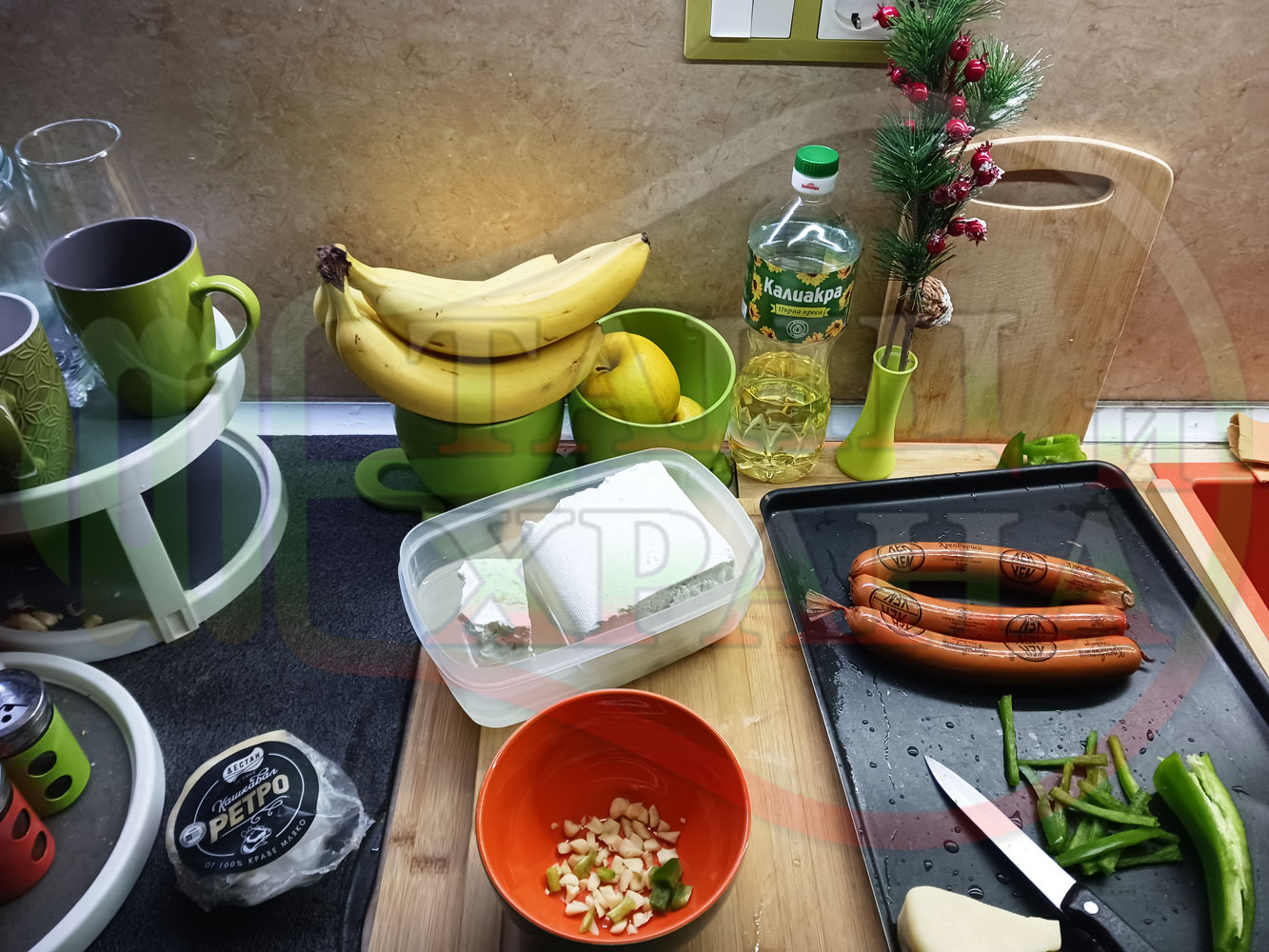 ПРОДУКТИ: Приблизителни количества за големи сиренови кюфтета "Кренвиршови зеленочушковокашкавалени с БГсирене" приготвени от яйца, зелени пресни чушки, стар чесън, кашкавал и краве бяло сирене (българско, саламурено) гарнирани и запечени на фурна с нарязани кренвирши