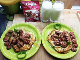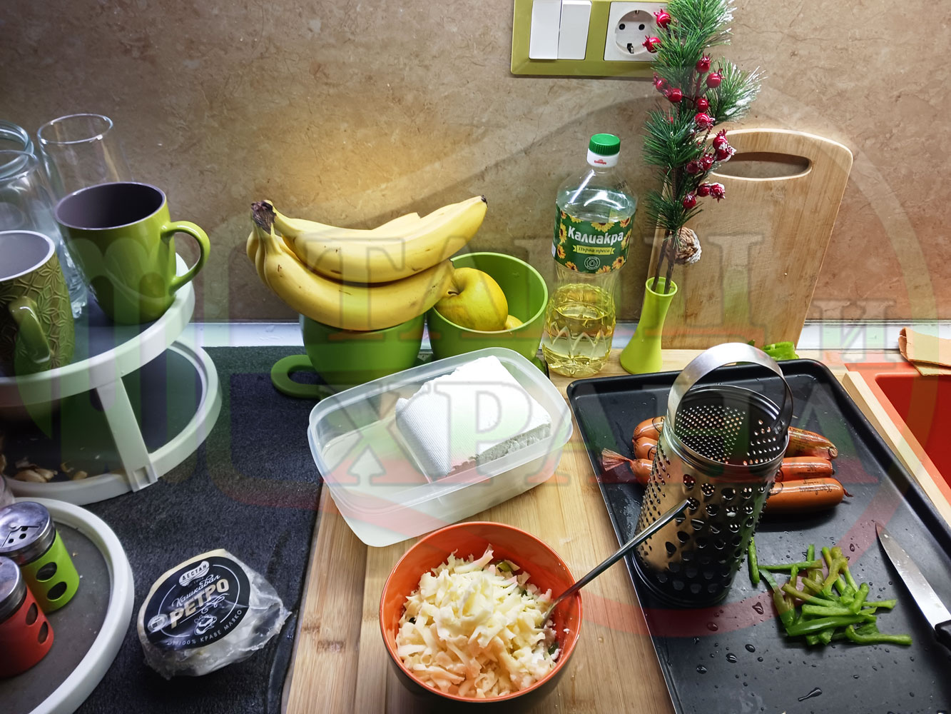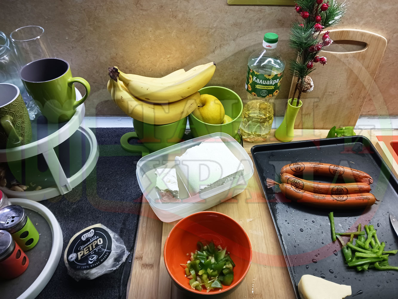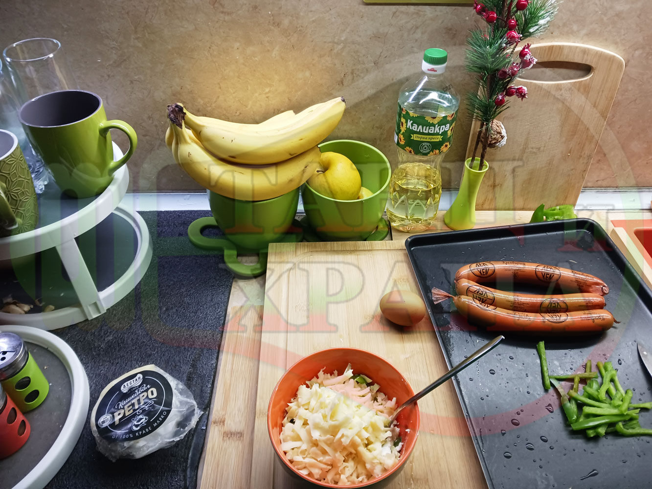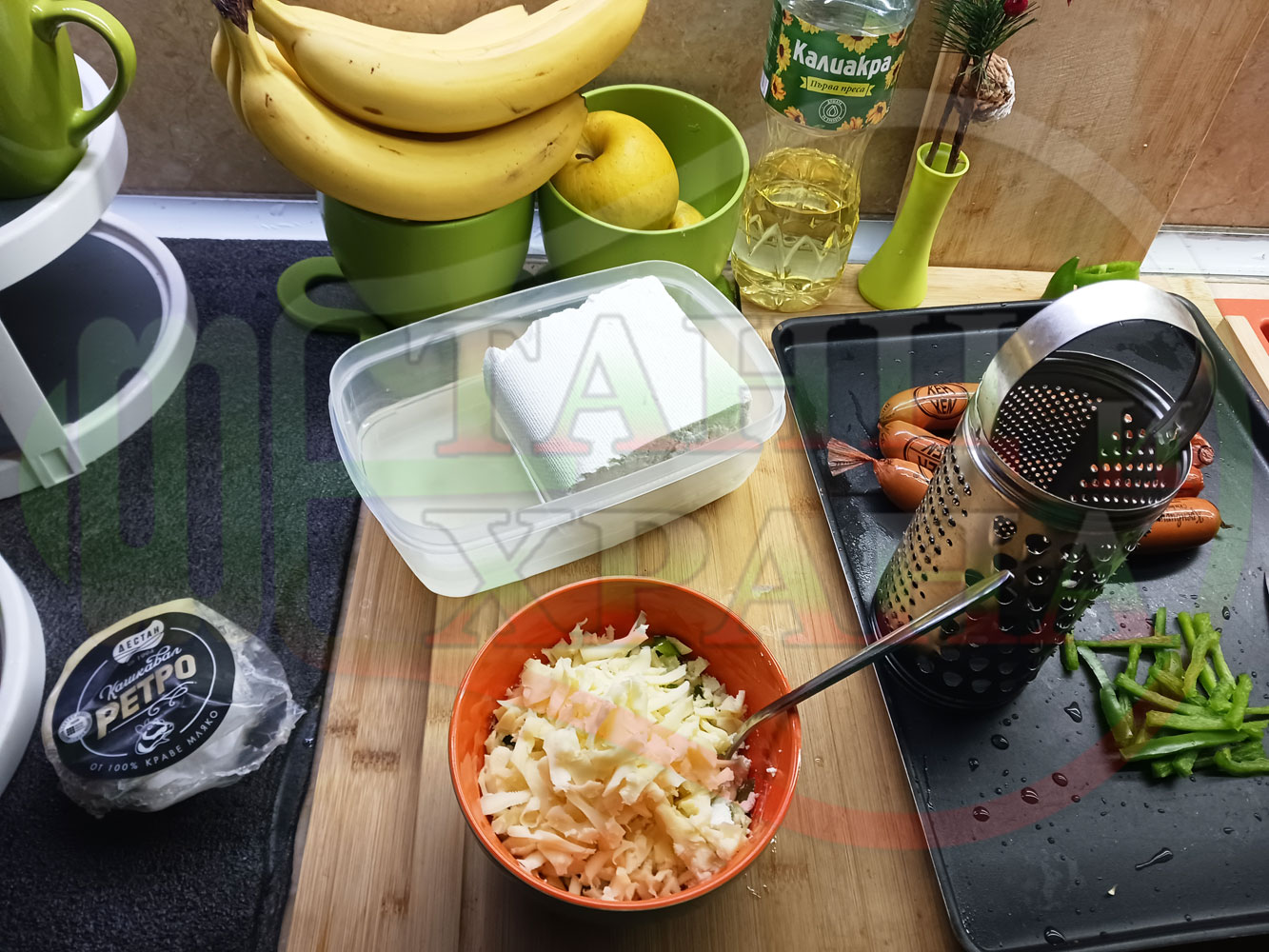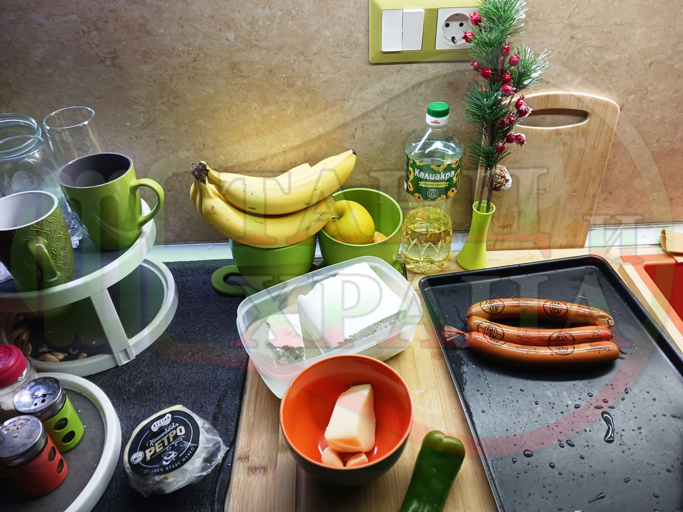 ПРОДУКТИ: Приблизителни количества за големи сиренови кюфтета "Кренвиршови зеленочушковокашкавалени с БГсирене" приготвени от яйца, зелени пресни чушки, стар чесън, кашкавал и краве бяло сирене (българско, саламурено) гарнирани и запечени на фурна с нарязани кренвирши