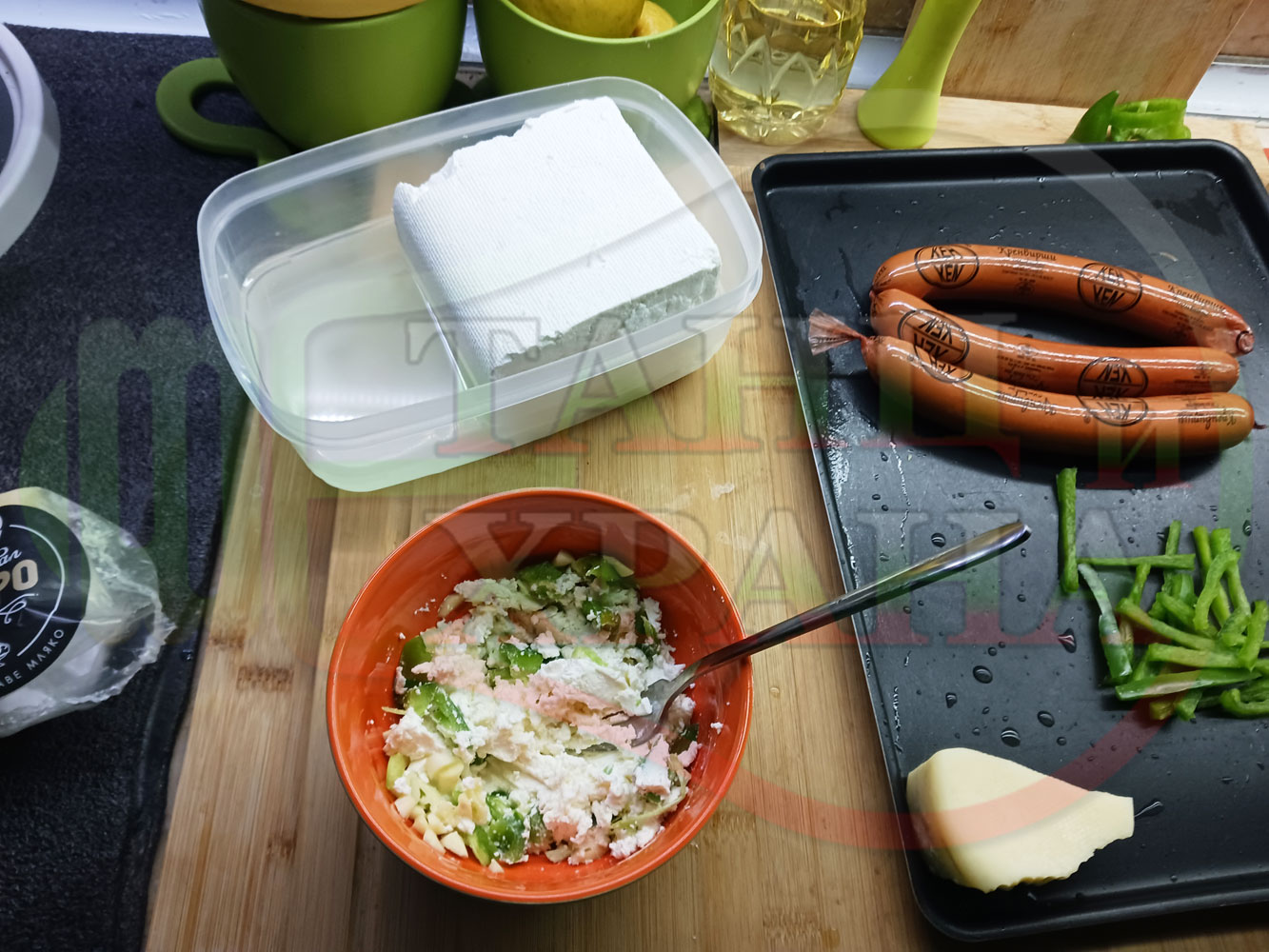 Обелете чесъна, нарежете го на едро в купа и добавете измитата, почистена от семките чрез т.нар. "изтърбушване" и нарязана на малки парченца зелена чушка (нарежете част от чушката на ивички и "обръчи" и запазете връхчетата за украса). Добавете българското краве бяло саламурено сирене и настържете кашкавала на едро. Разбъркайте и намачкайте с вилица за да се овкусят продуктите, добавете яйцето и отново разбъркайте и намачкайте с вилица до образуване на средно гъста яйчено сиренова, хомогенизирана смес с чесън и зелени пресни чушки (сиренова смес).