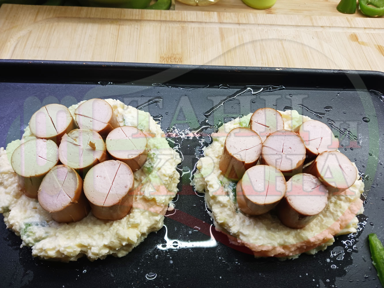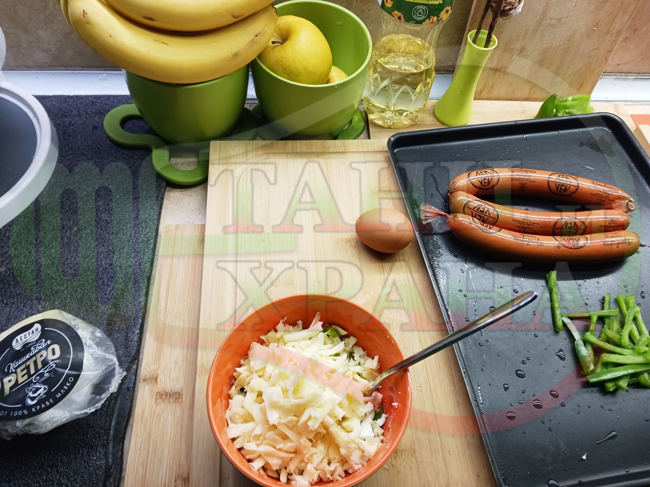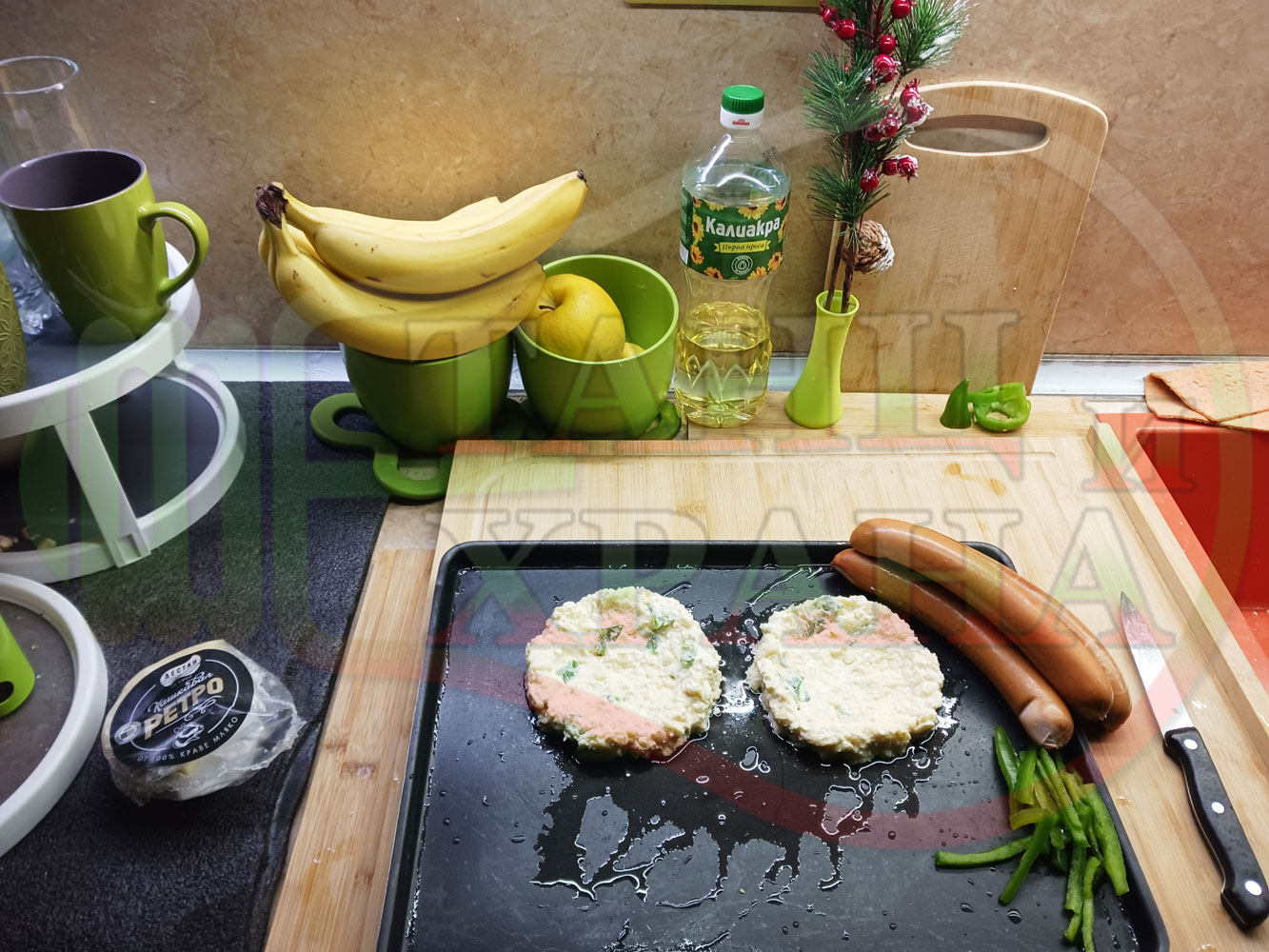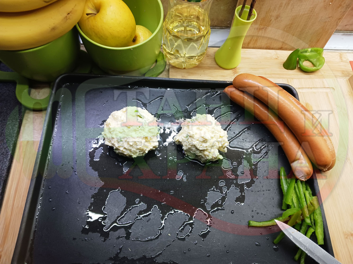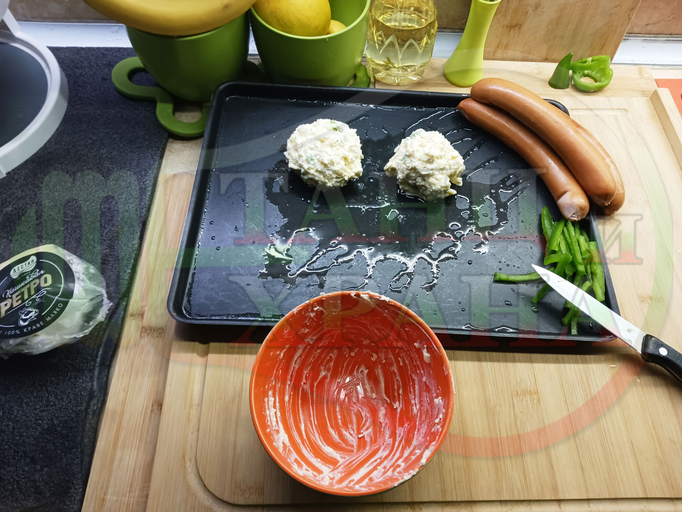 Големи сиренови кюфтета "Кренвиршови зеленочушковокашкавалени с БГсирене" приготвени от яйца, зелени пресни чушки, стар чесън, кашкавал и краве бяло сирене (българско, саламурено) гарнирани и запечени на фурна с нарязани кренвирши