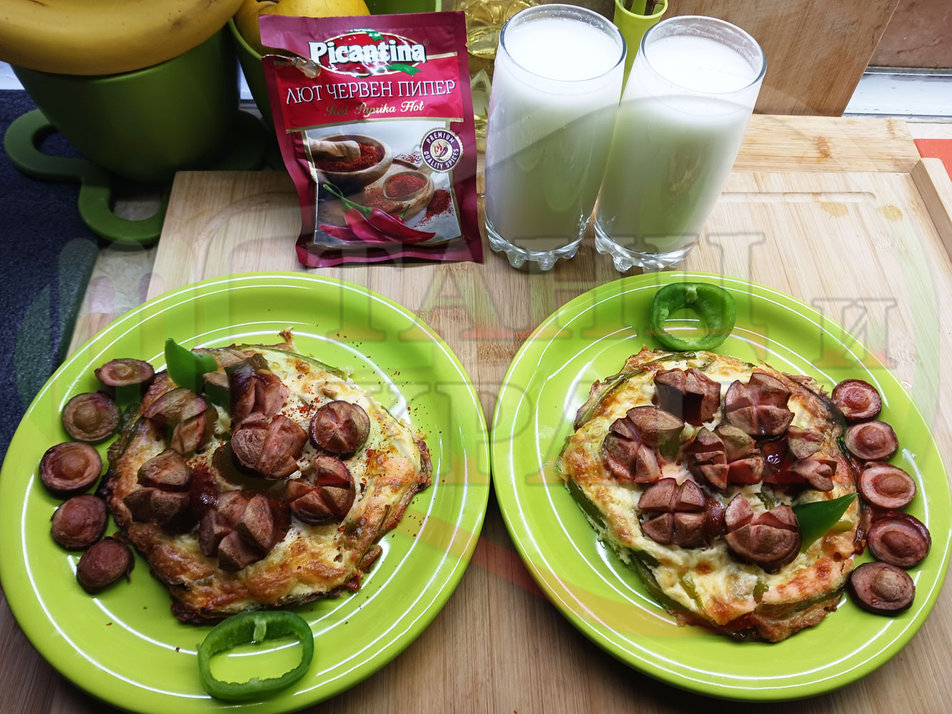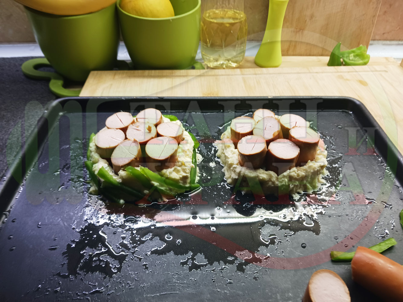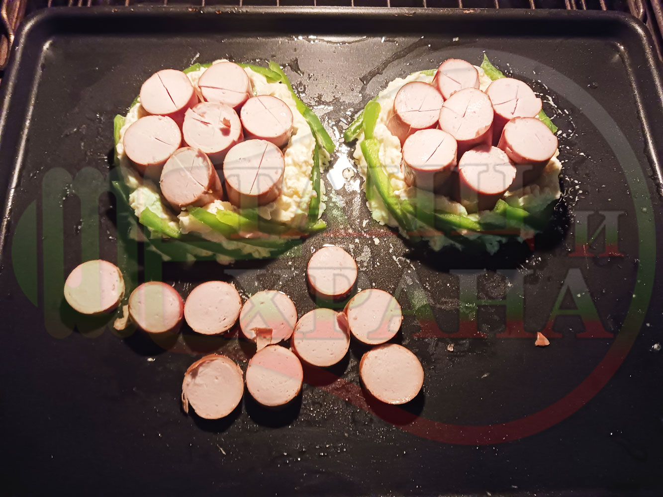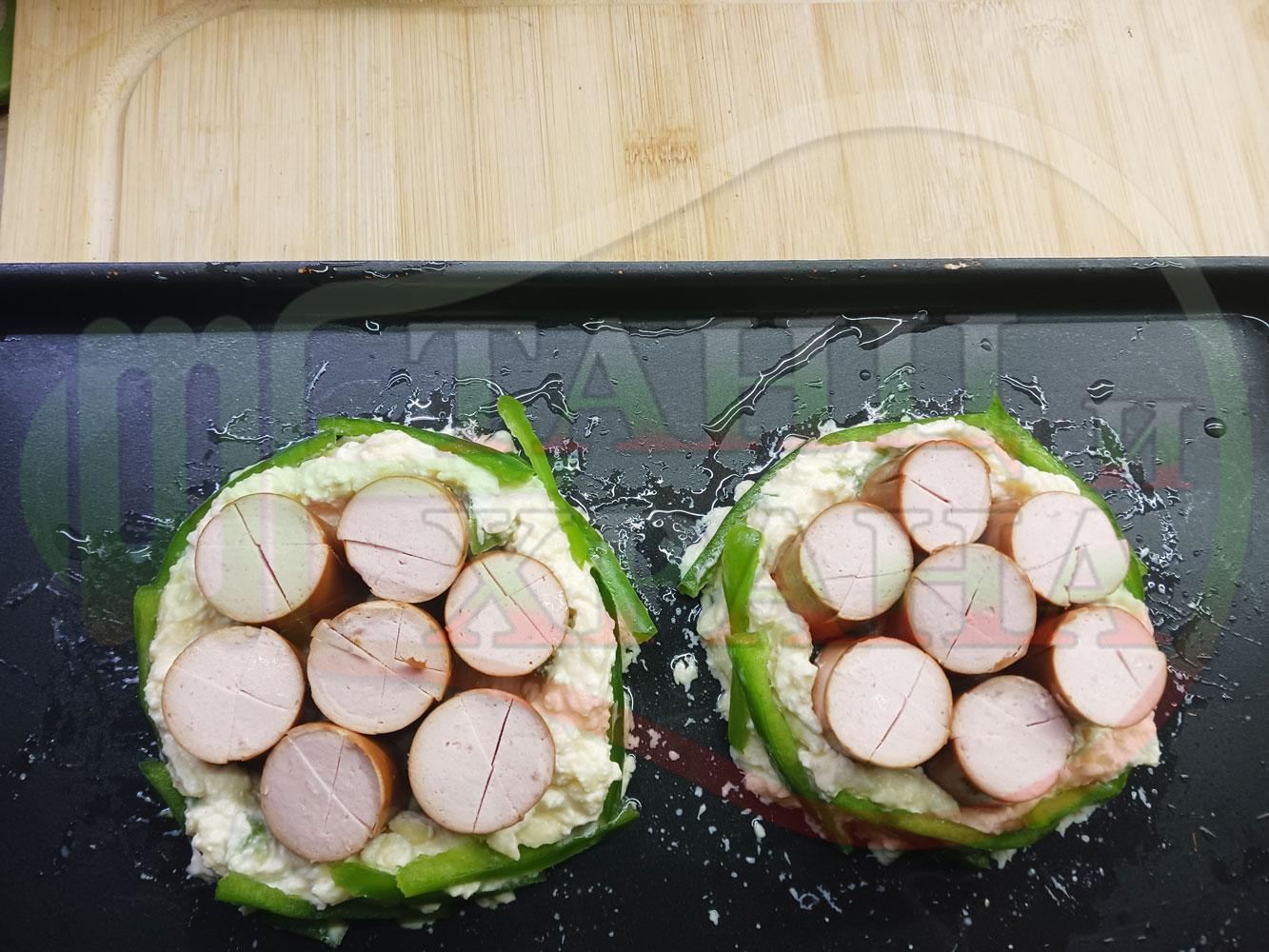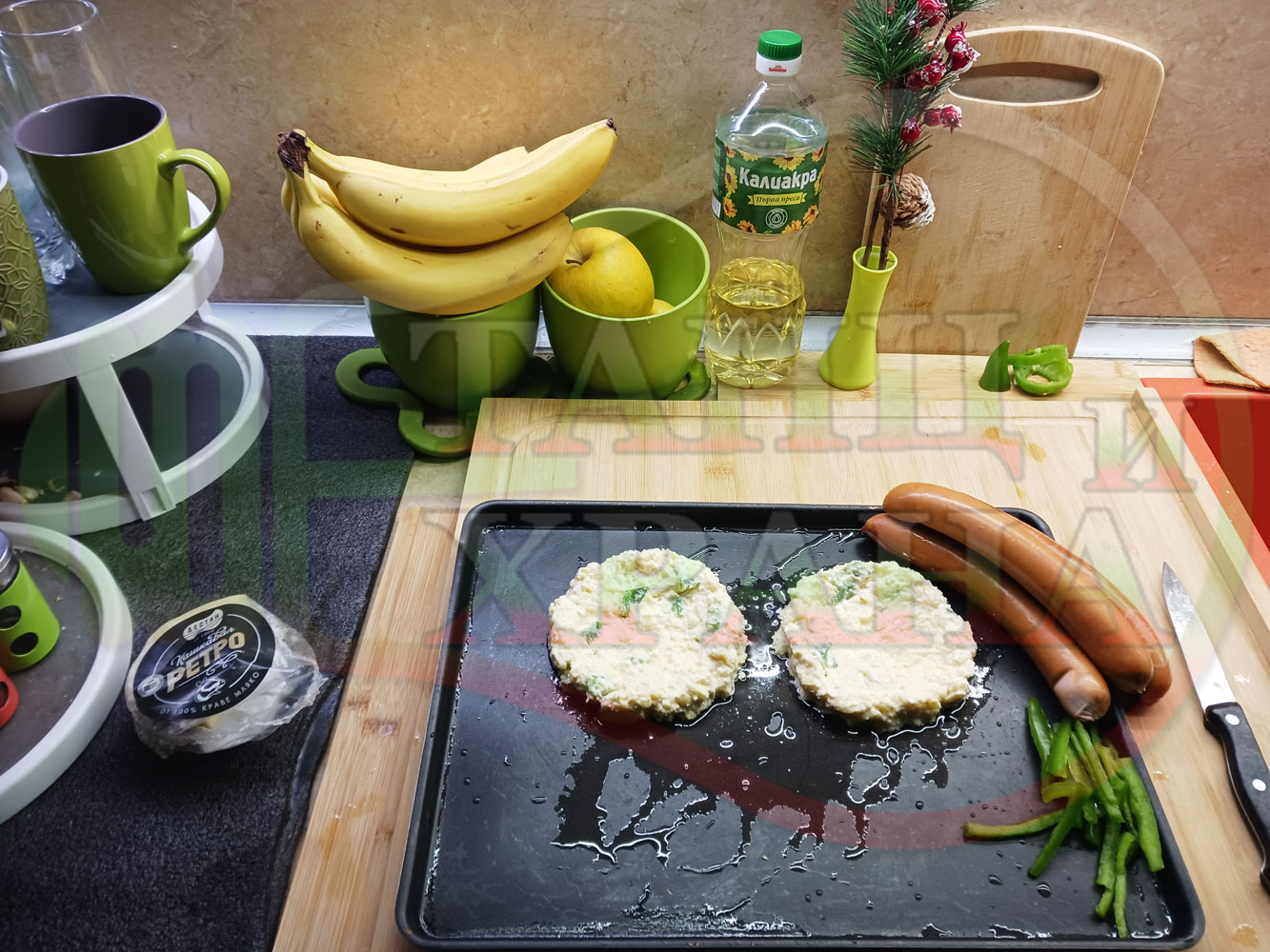 Големи сиренови кюфтета "Кренвиршови зеленочушковокашкавалени с БГсирене" приготвени от яйца, зелени пресни чушки, стар чесън, кашкавал и краве бяло сирене (българско, саламурено) гарнирани и запечени на фурна с нарязани кренвирши