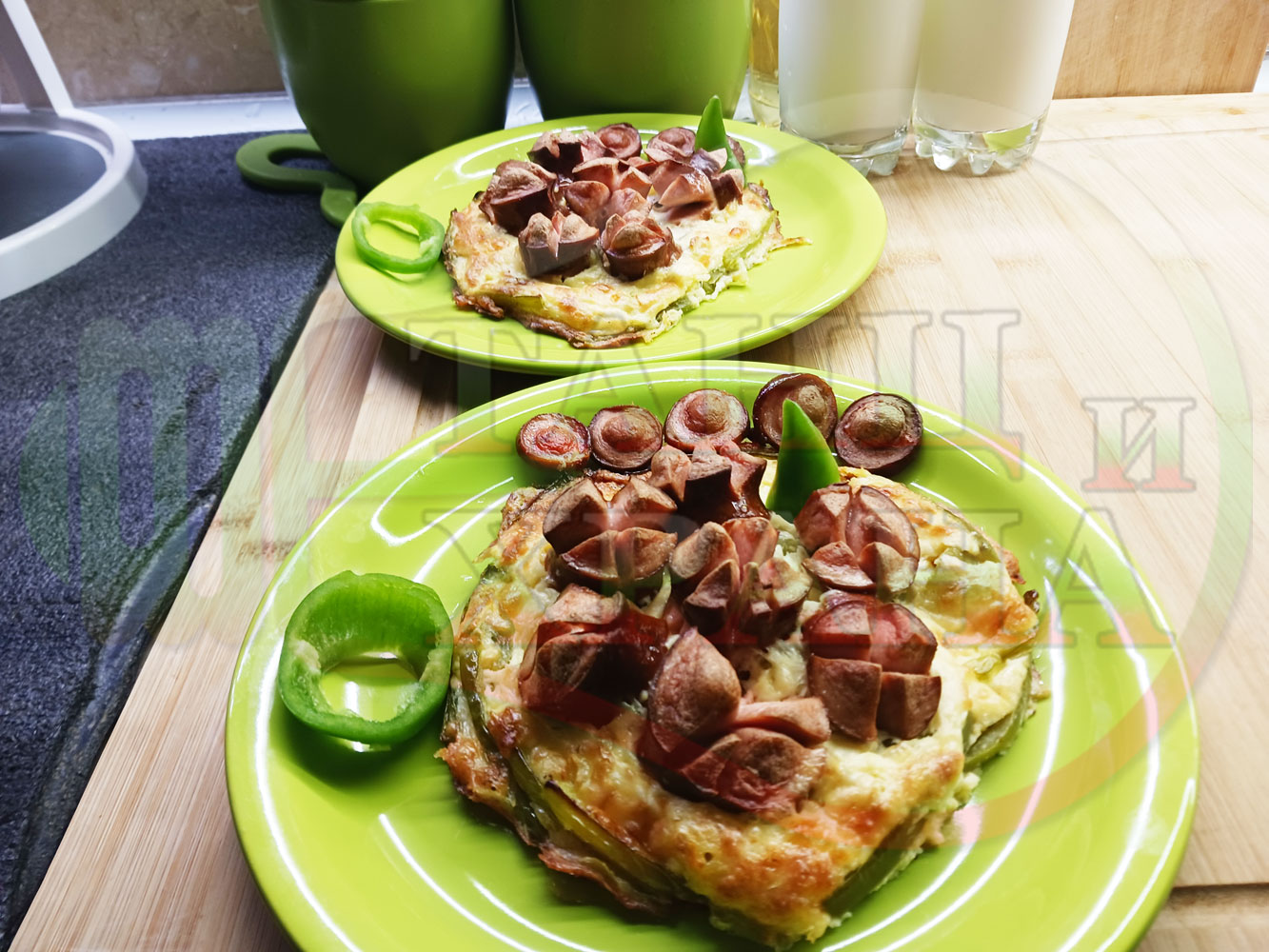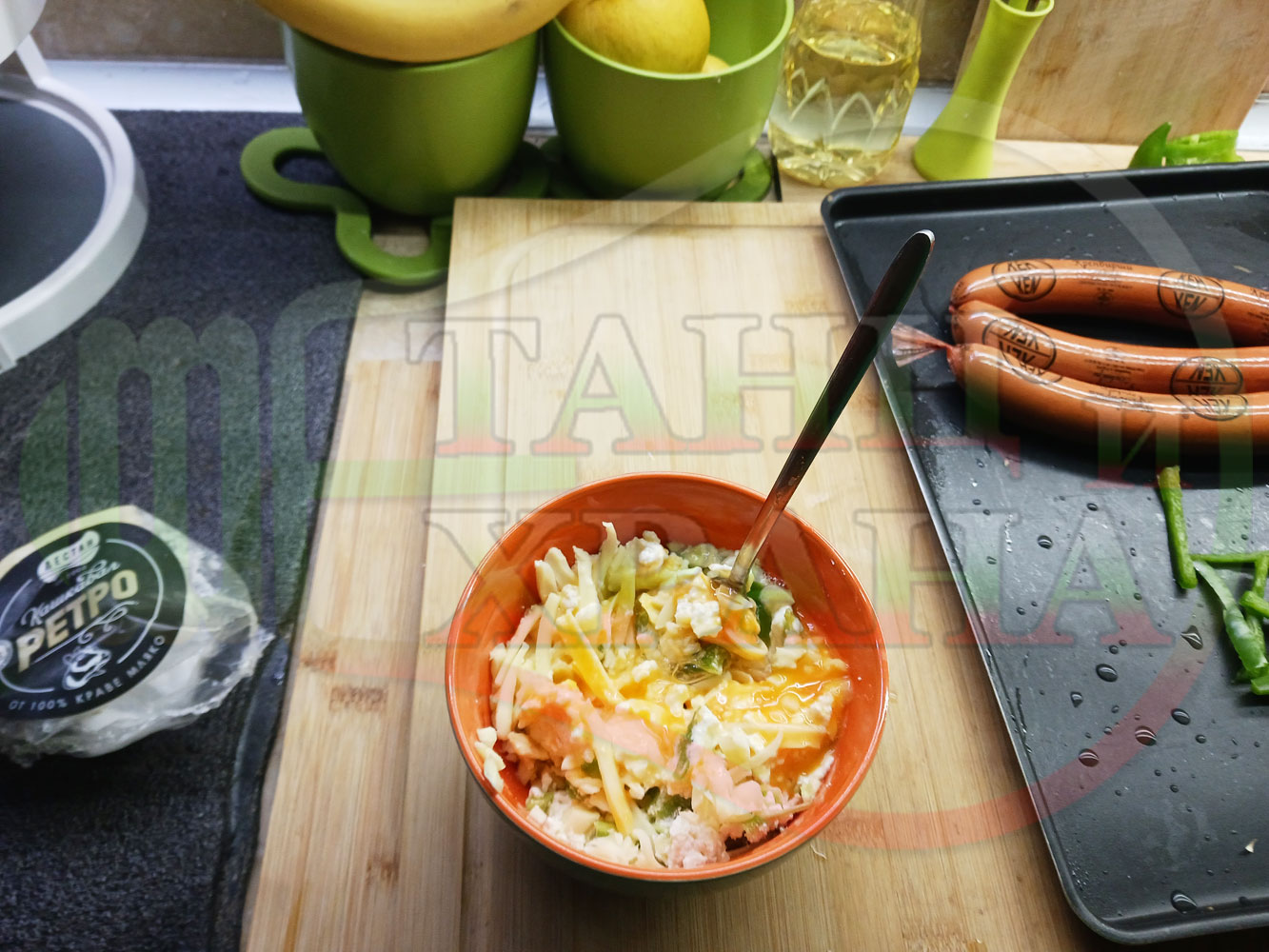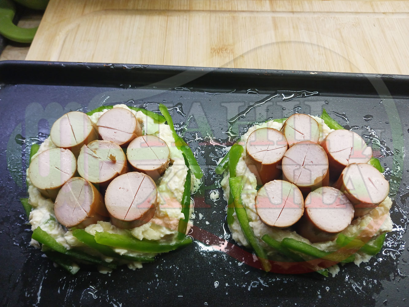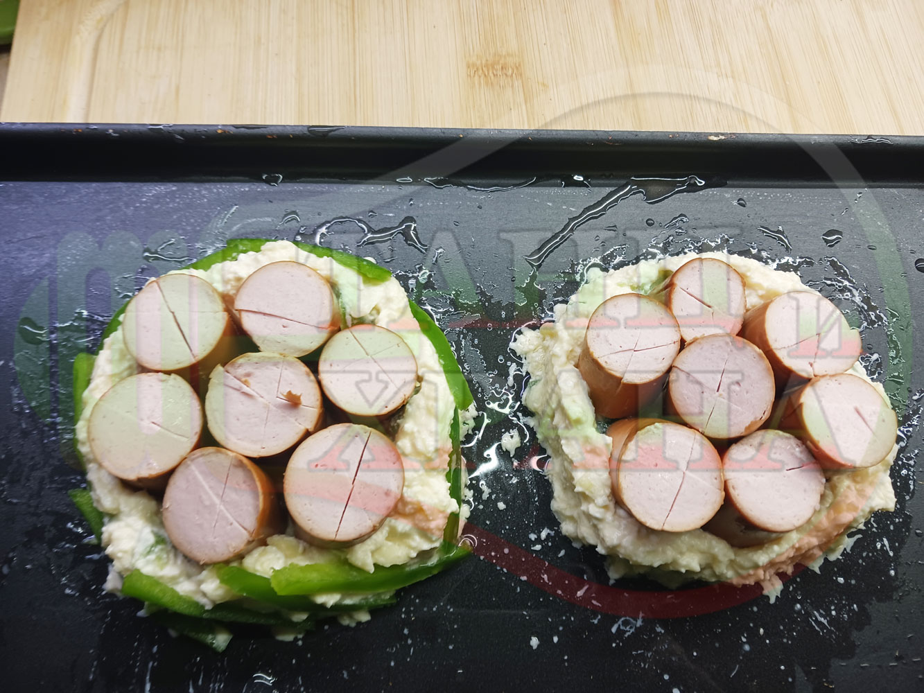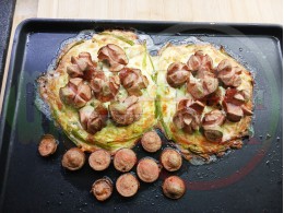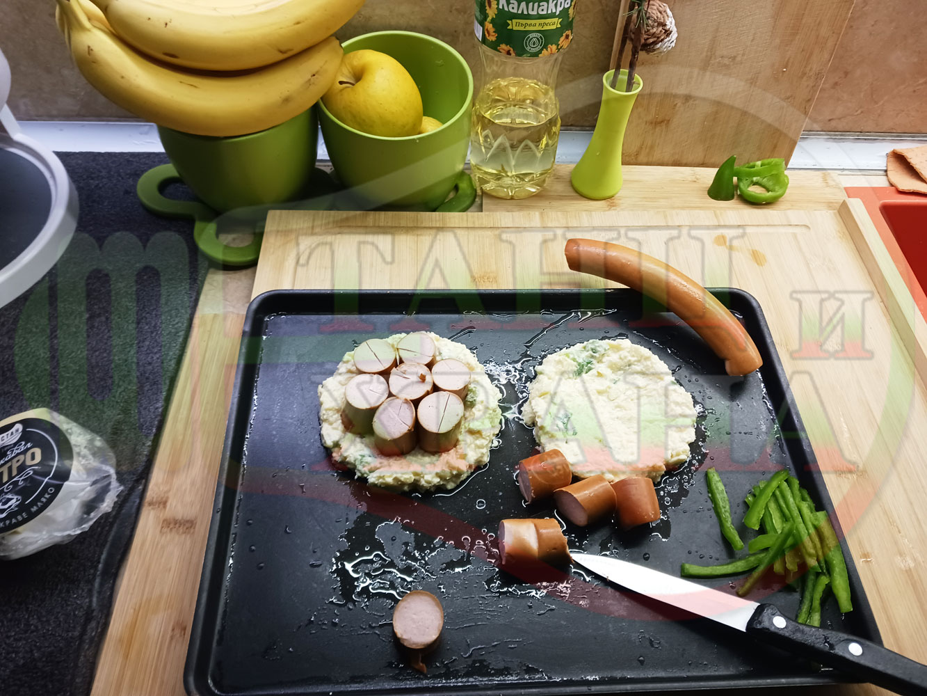 Големи сиренови кюфтета "Кренвиршови зеленочушковокашкавалени с БГсирене" приготвени от яйца, зелени пресни чушки, стар чесън, кашкавал и краве бяло сирене (българско, саламурено) гарнирани и запечени на фурна с нарязани кренвирши
