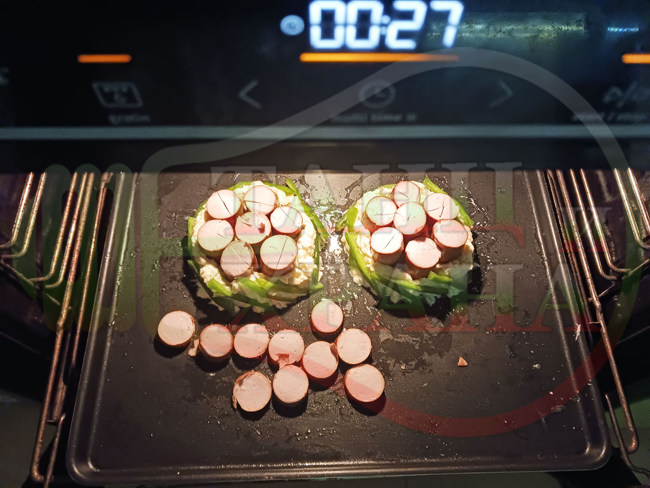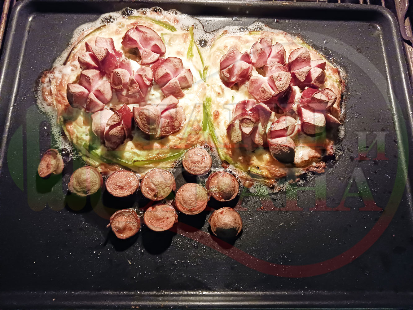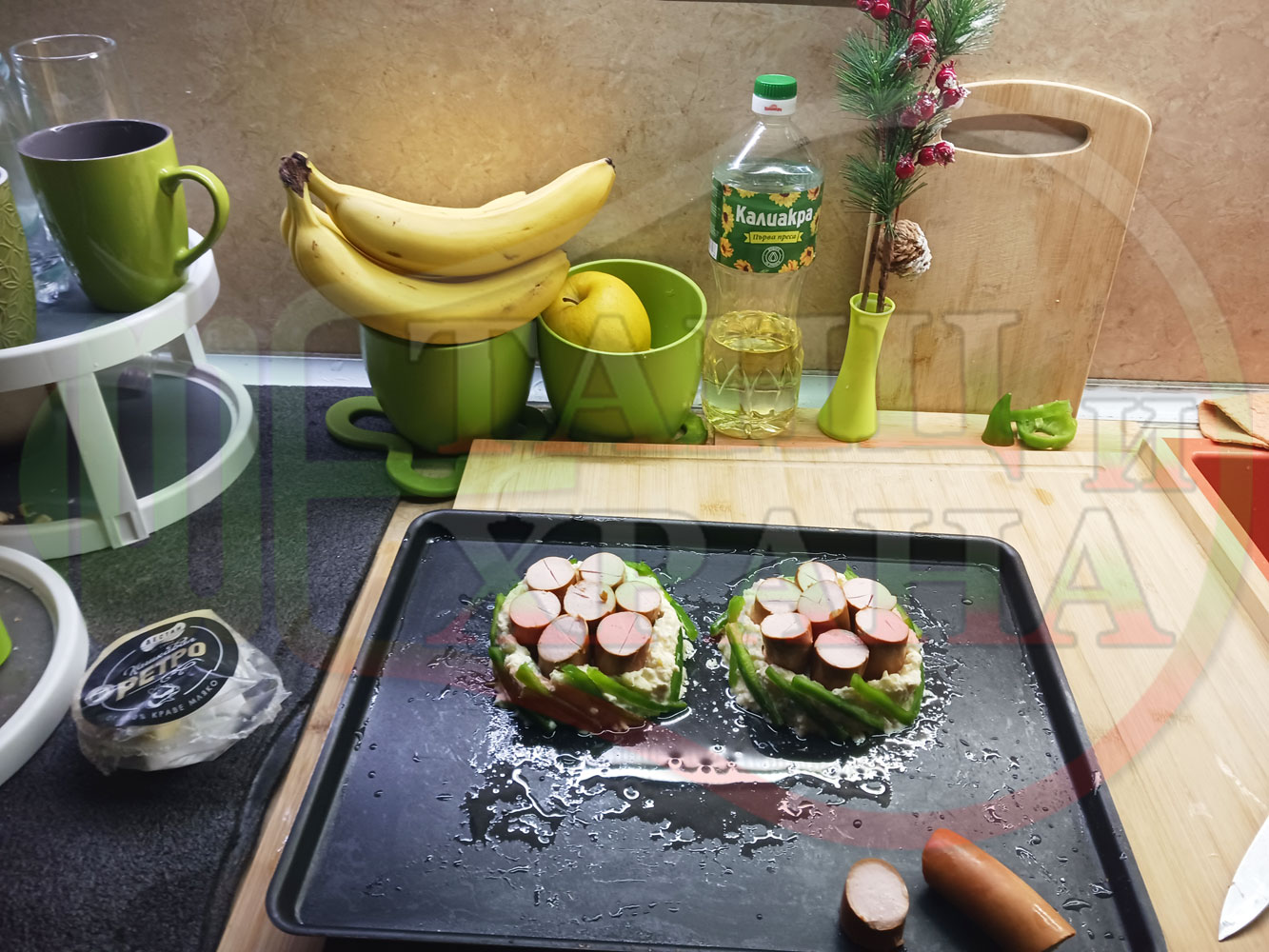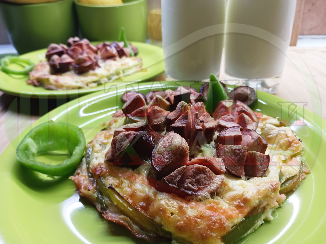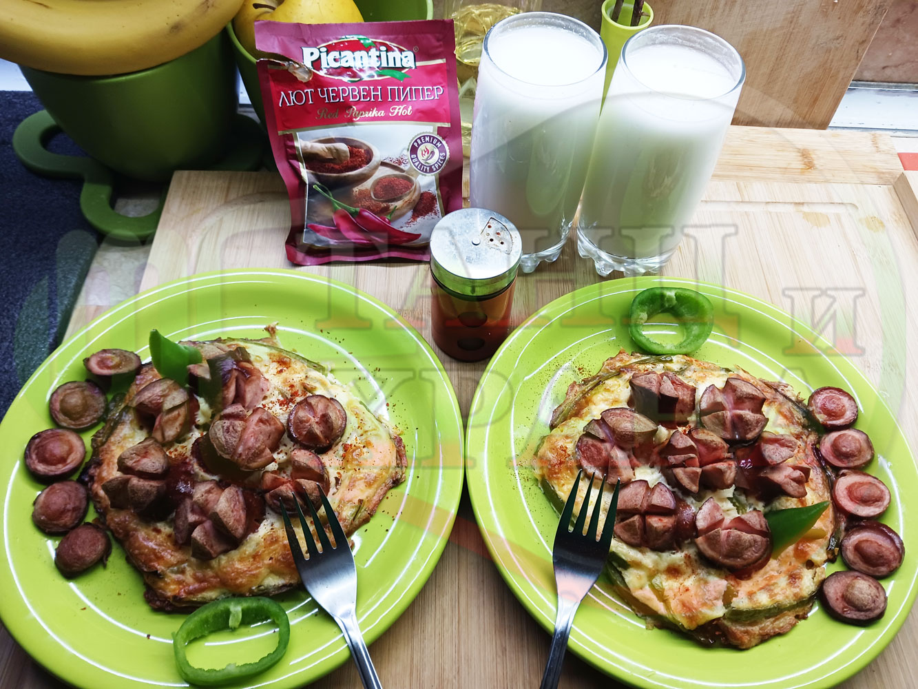 Големи сиренови кюфтета "Кренвиршови зеленочушковокашкавалени с БГсирене" приготвени от яйца, зелени пресни чушки, стар чесън, кашкавал и краве бяло сирене (българско, саламурено) гарнирани и запечени на фурна с нарязани кренвирши