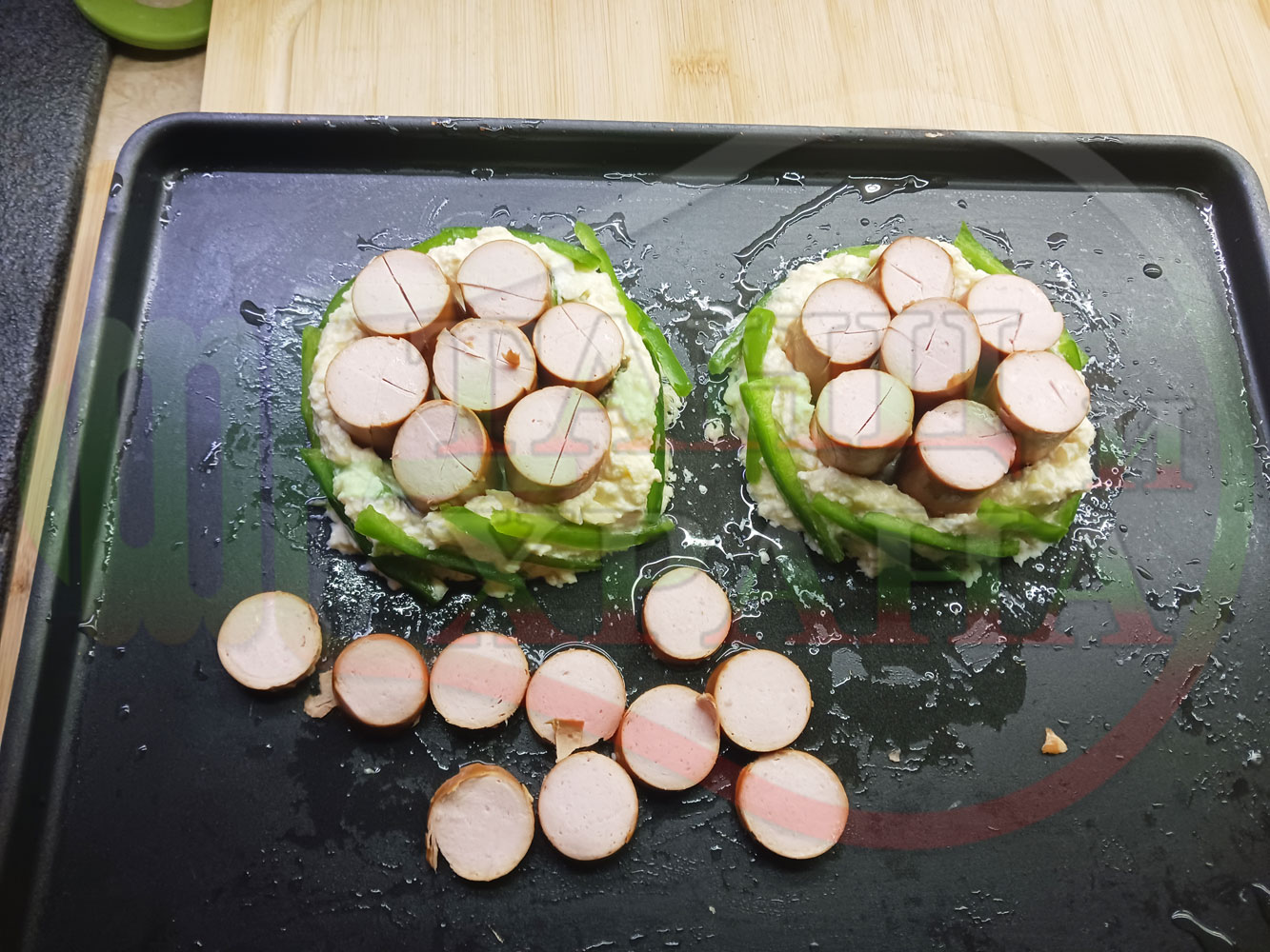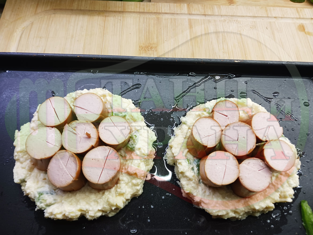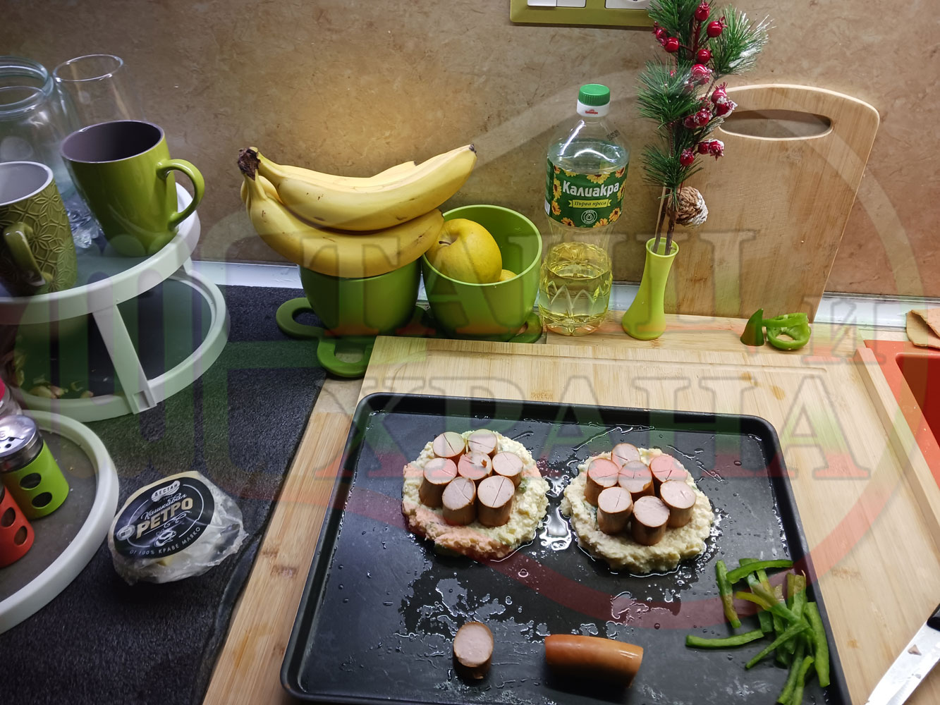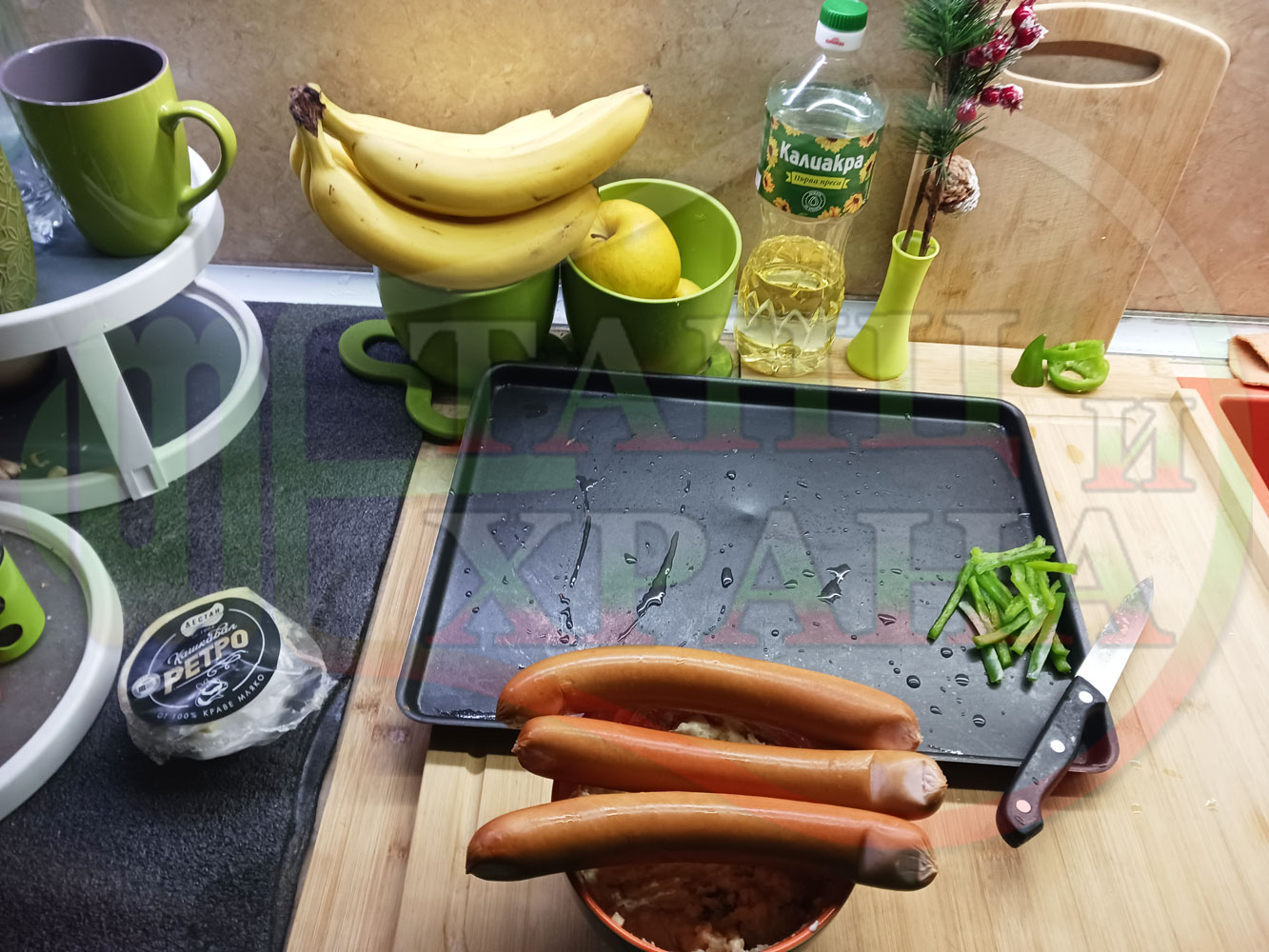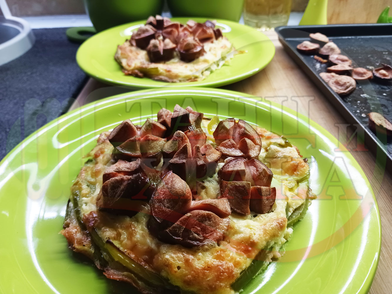 Големи сиренови кюфтета "Кренвиршови зеленочушковокашкавалени с БГсирене" приготвени от яйца, зелени пресни чушки, стар чесън, кашкавал и краве бяло сирене (българско, саламурено) гарнирани и запечени на фурна с нарязани кренвирши