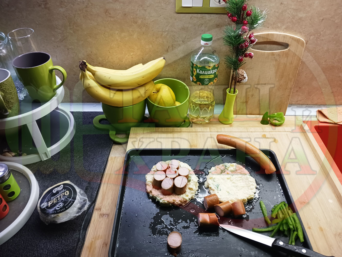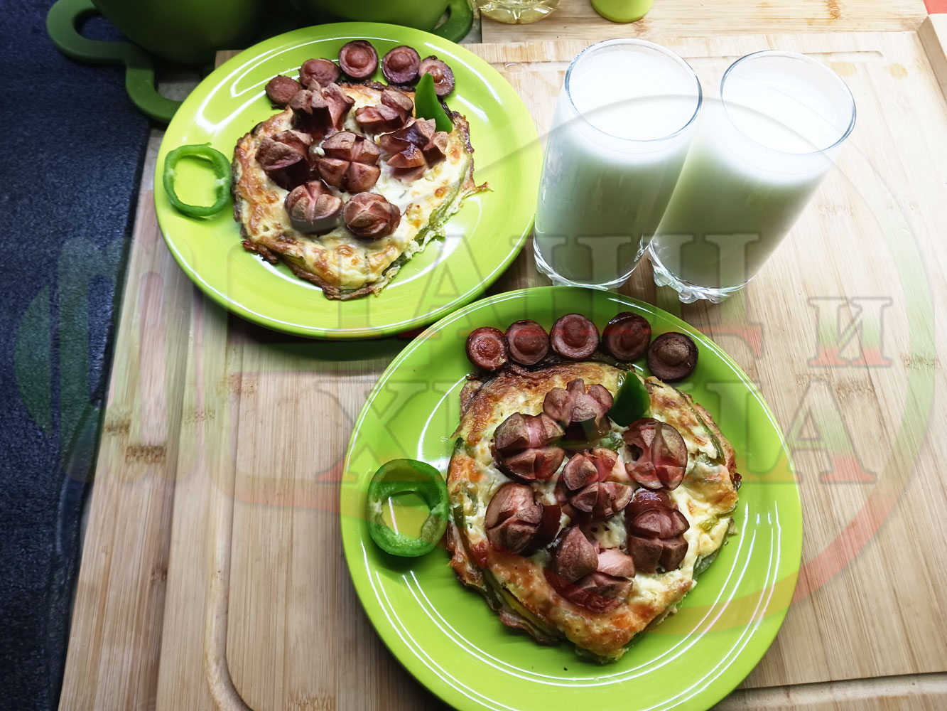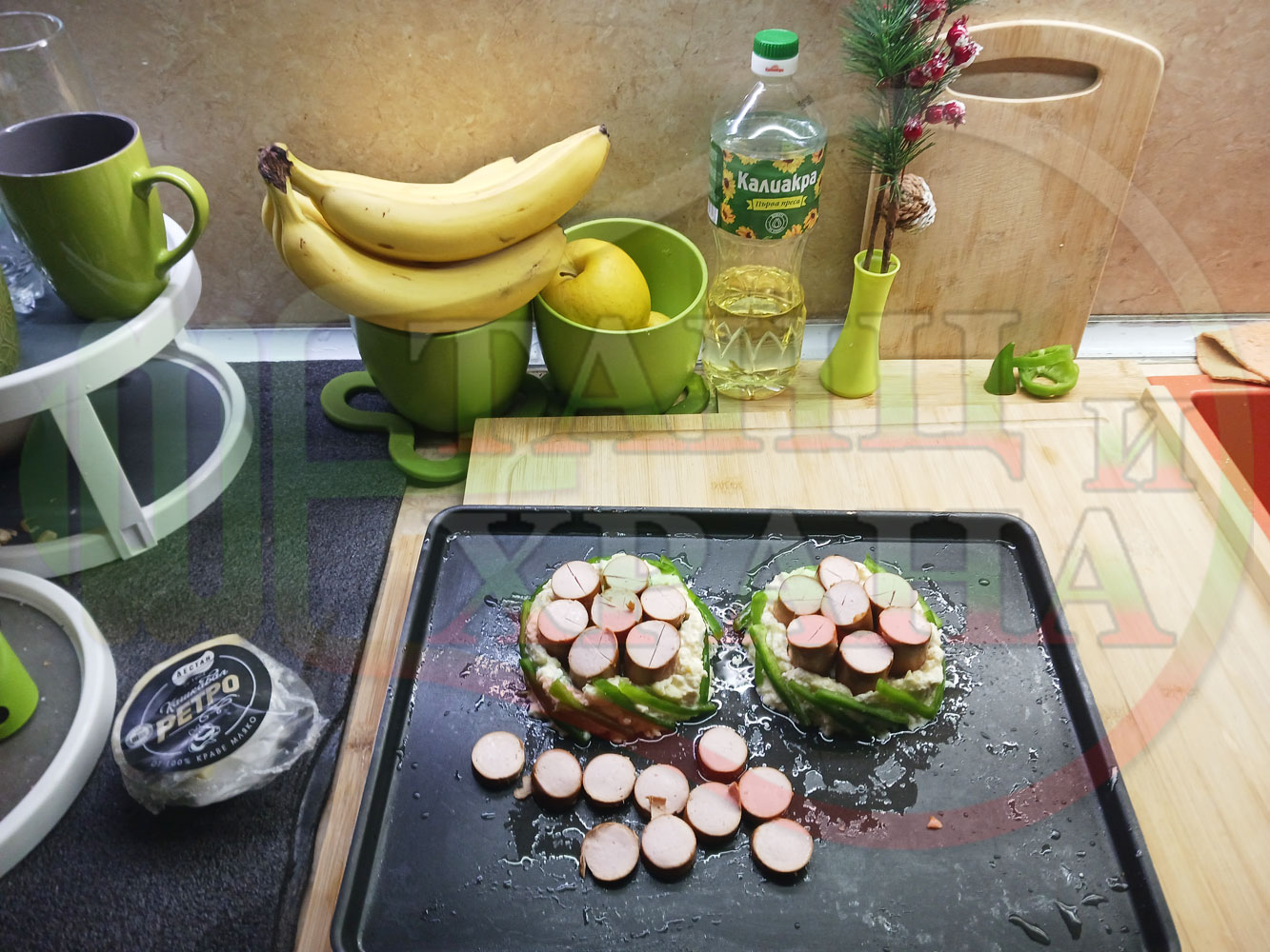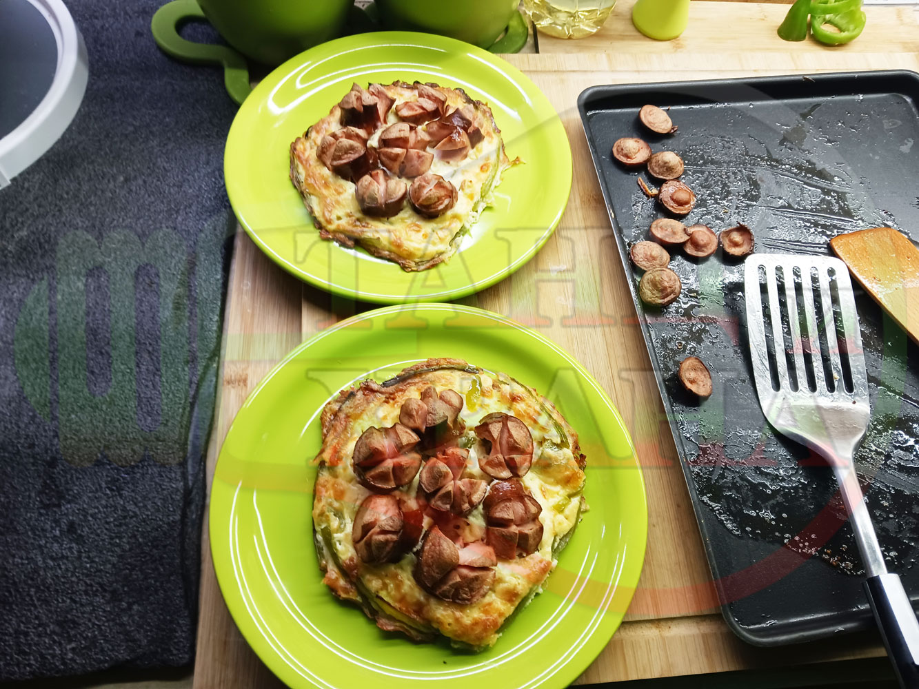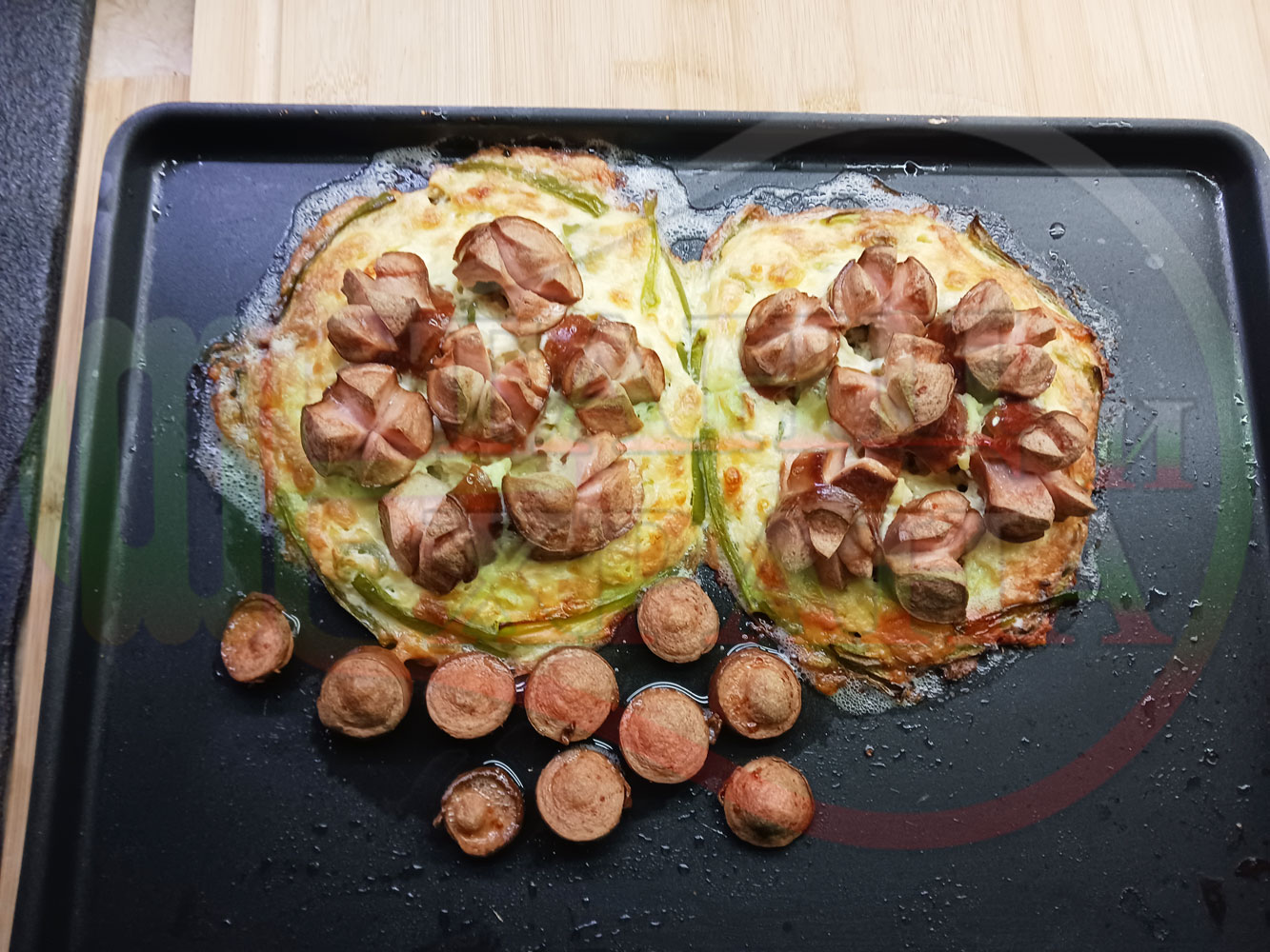 Големи сиренови кюфтета "Кренвиршови зеленочушковокашкавалени с БГсирене" приготвени от яйца, зелени пресни чушки, стар чесън, кашкавал и краве бяло сирене (българско, саламурено) гарнирани и запечени на фурна с нарязани кренвирши