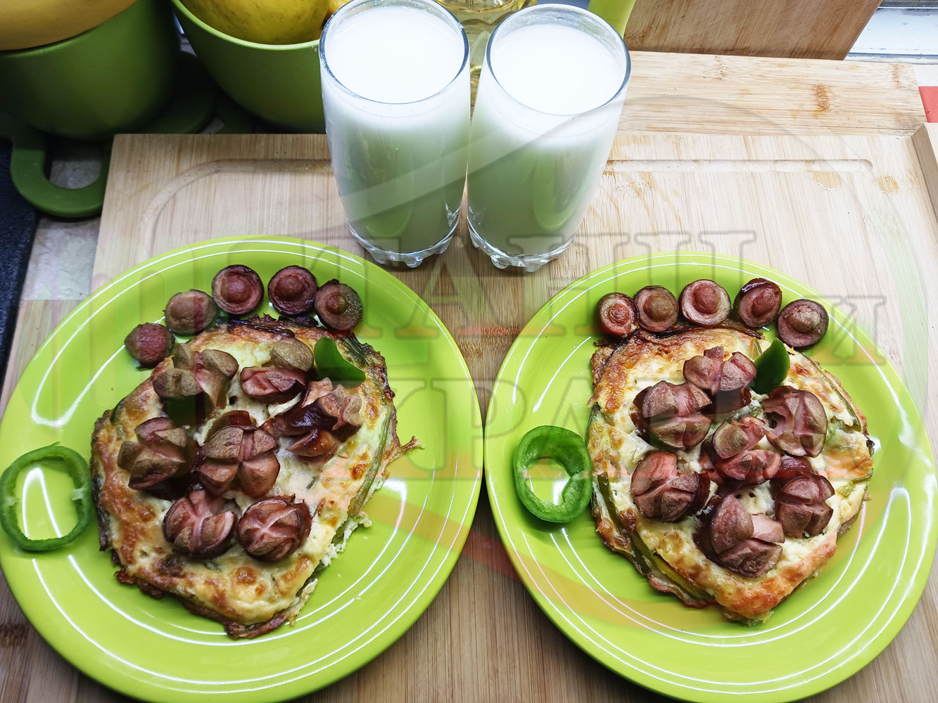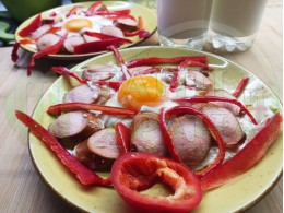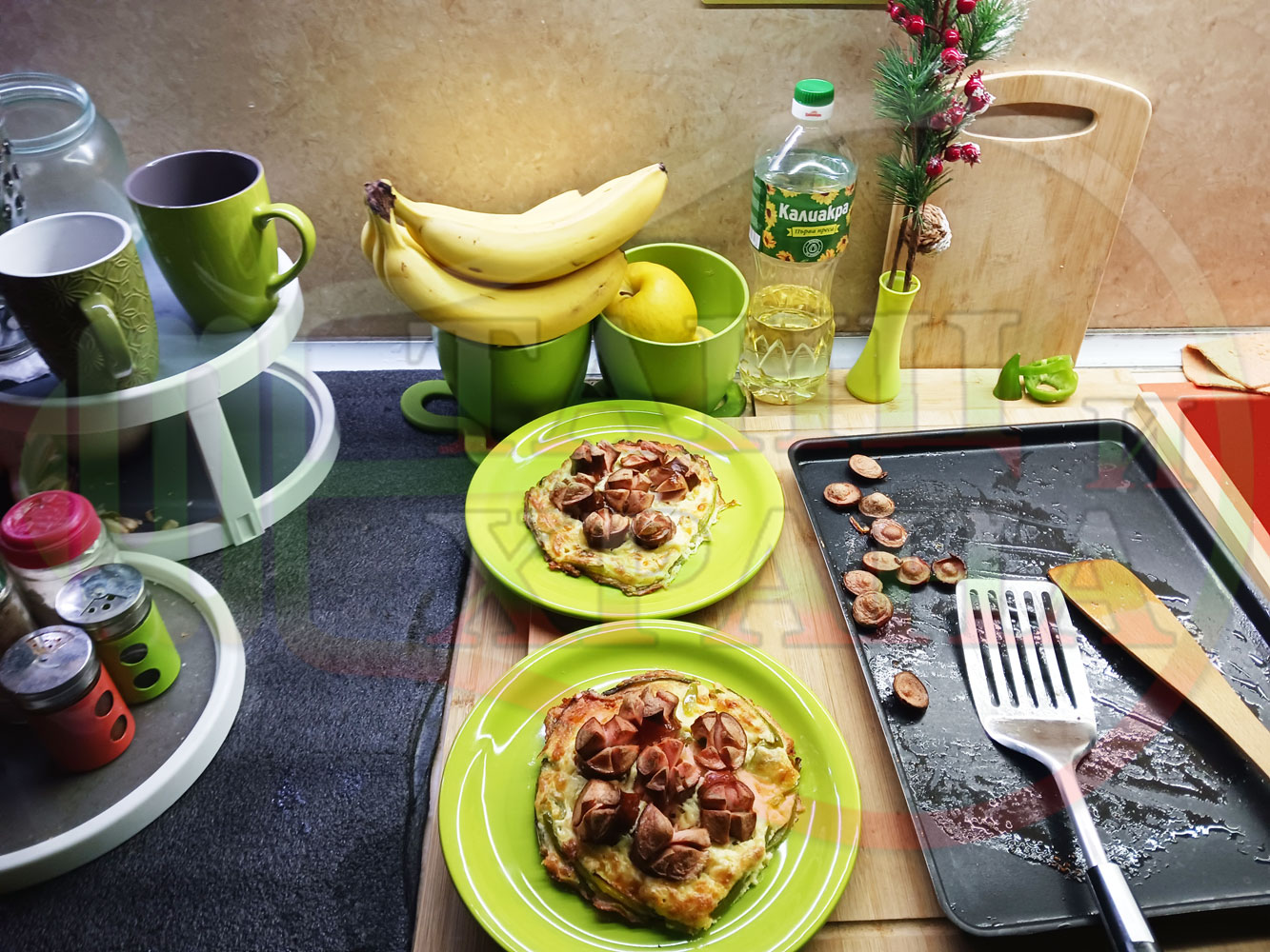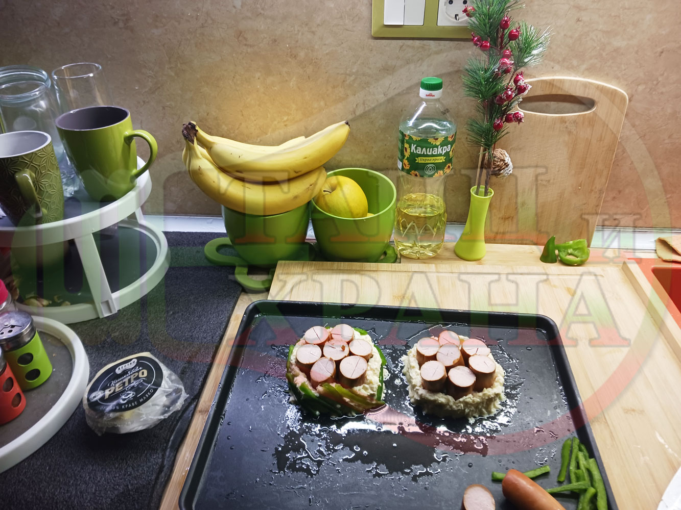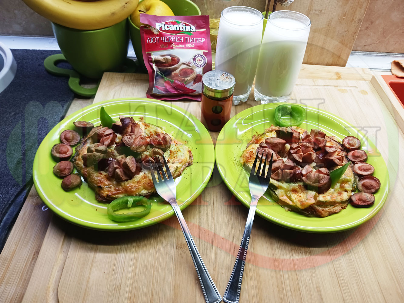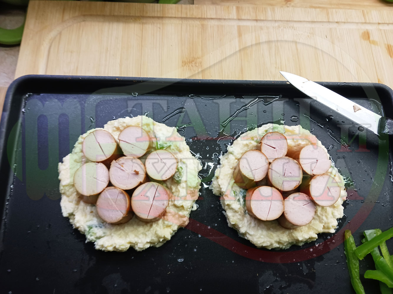 Големи сиренови кюфтета "Кренвиршови зеленочушковокашкавалени с БГсирене" приготвени от яйца, зелени пресни чушки, стар чесън, кашкавал и краве бяло сирене (българско, саламурено) гарнирани и запечени на фурна с нарязани кренвирши