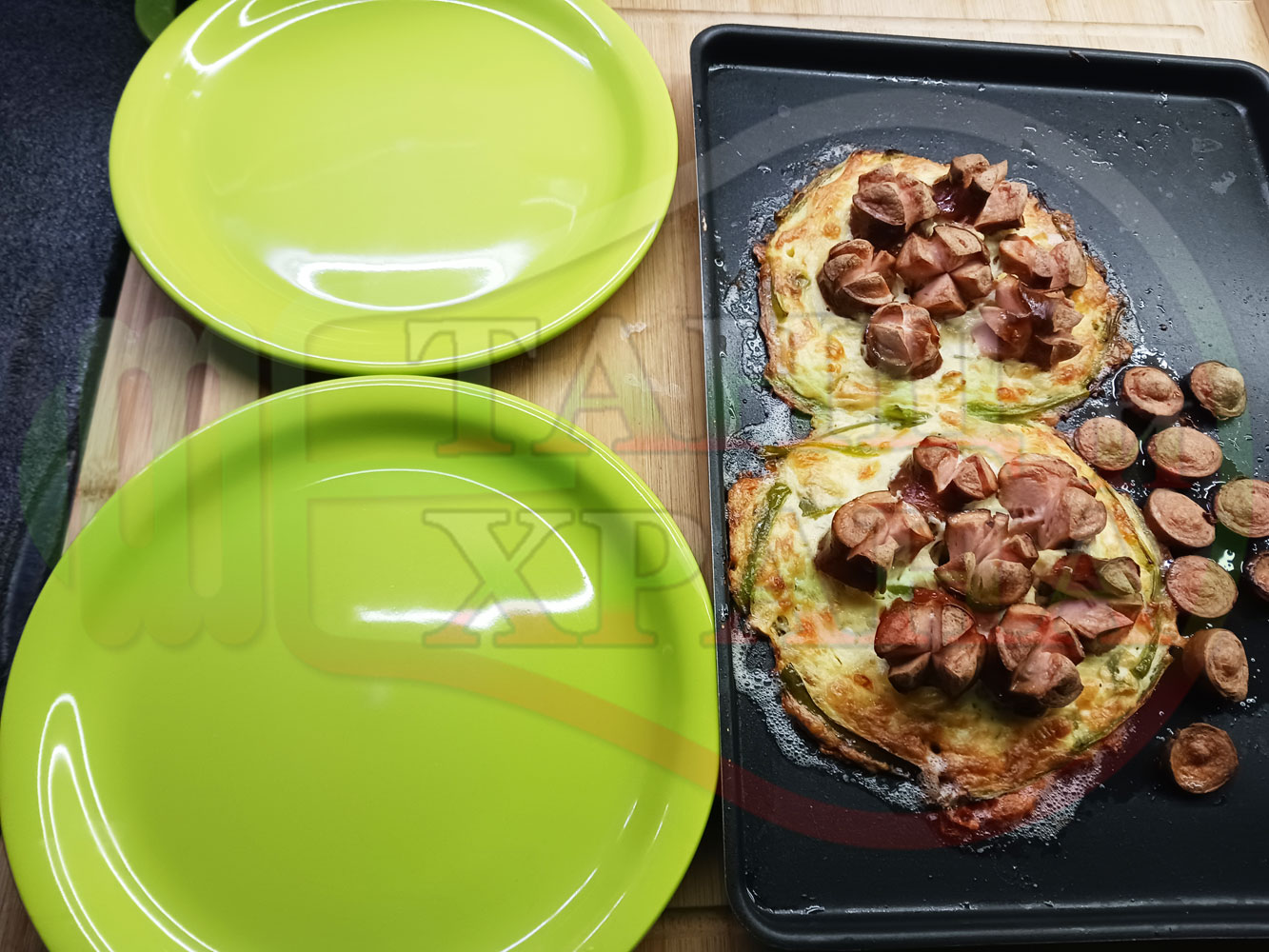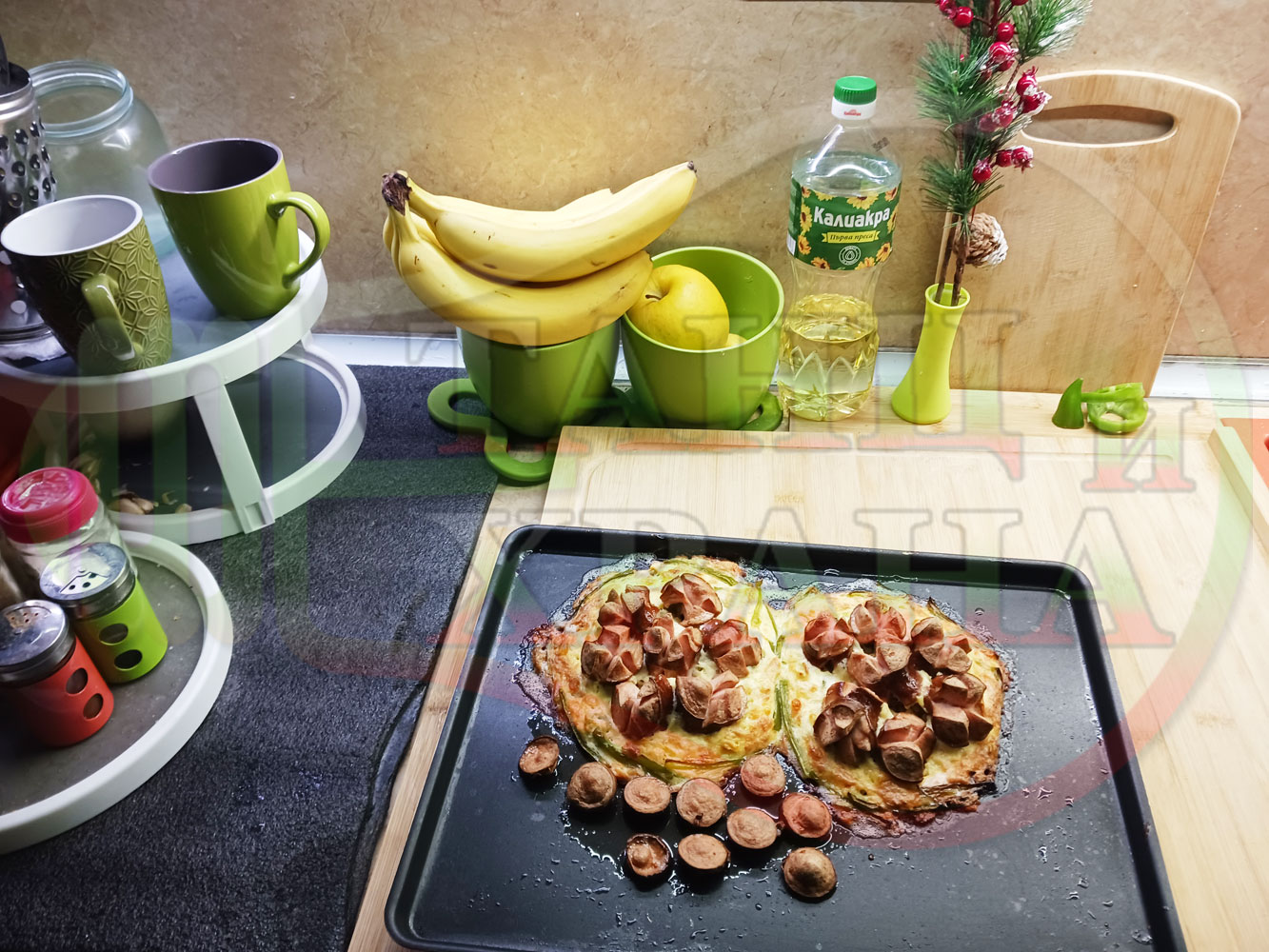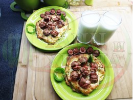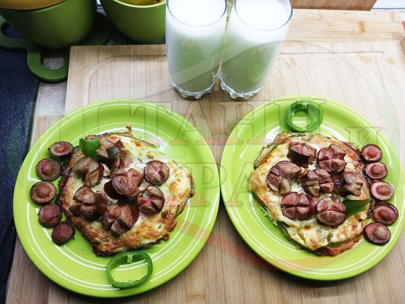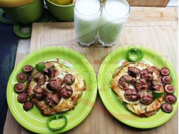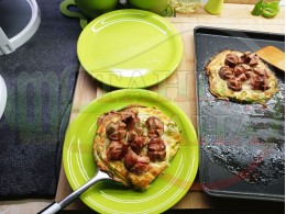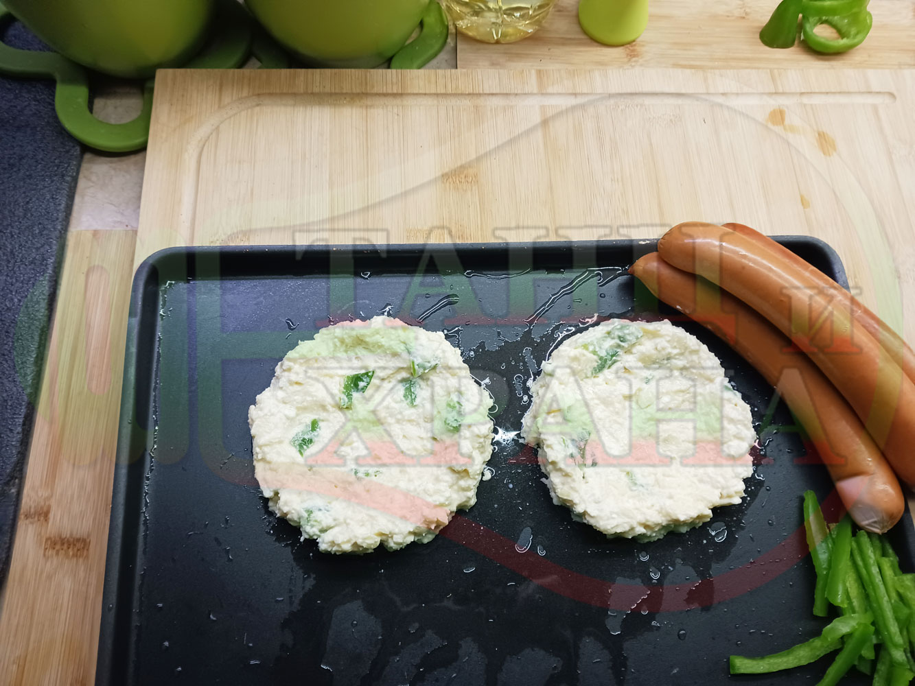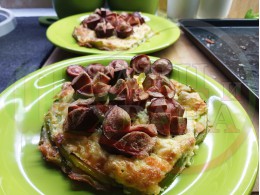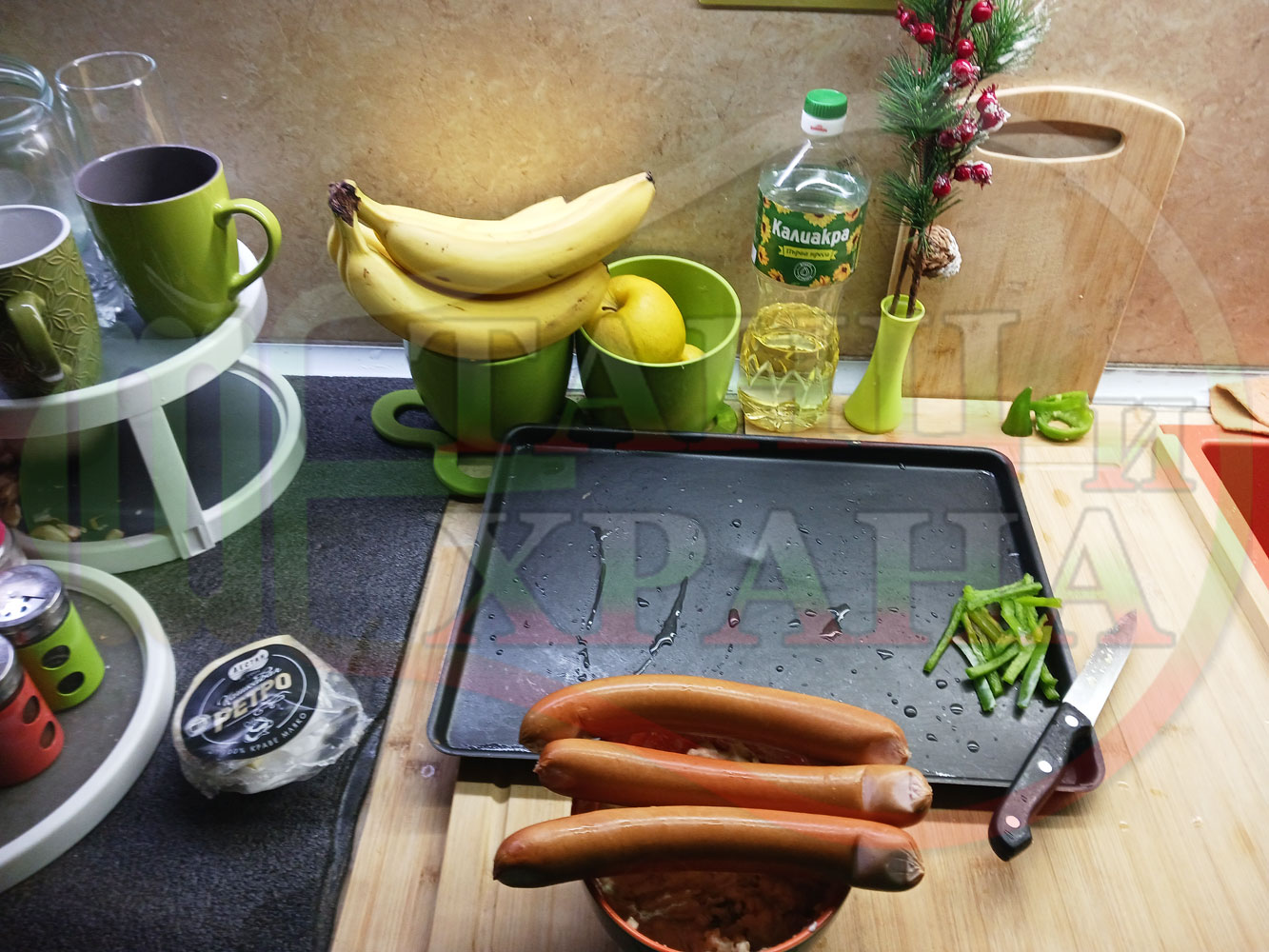 Големи сиренови кюфтета "Кренвиршови зеленочушковокашкавалени с БГсирене" приготвени от яйца, зелени пресни чушки, стар чесън, кашкавал и краве бяло сирене (българско, саламурено) гарнирани и запечени на фурна с нарязани кренвирши