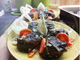 Лозови големи сарми "Кренвиршоволучени" запечени на фурна с ориз и краве масло приготвени с плънка от кренвирши, кромид лук и чесън гарнирани с млечна основа от кисело мляко от България