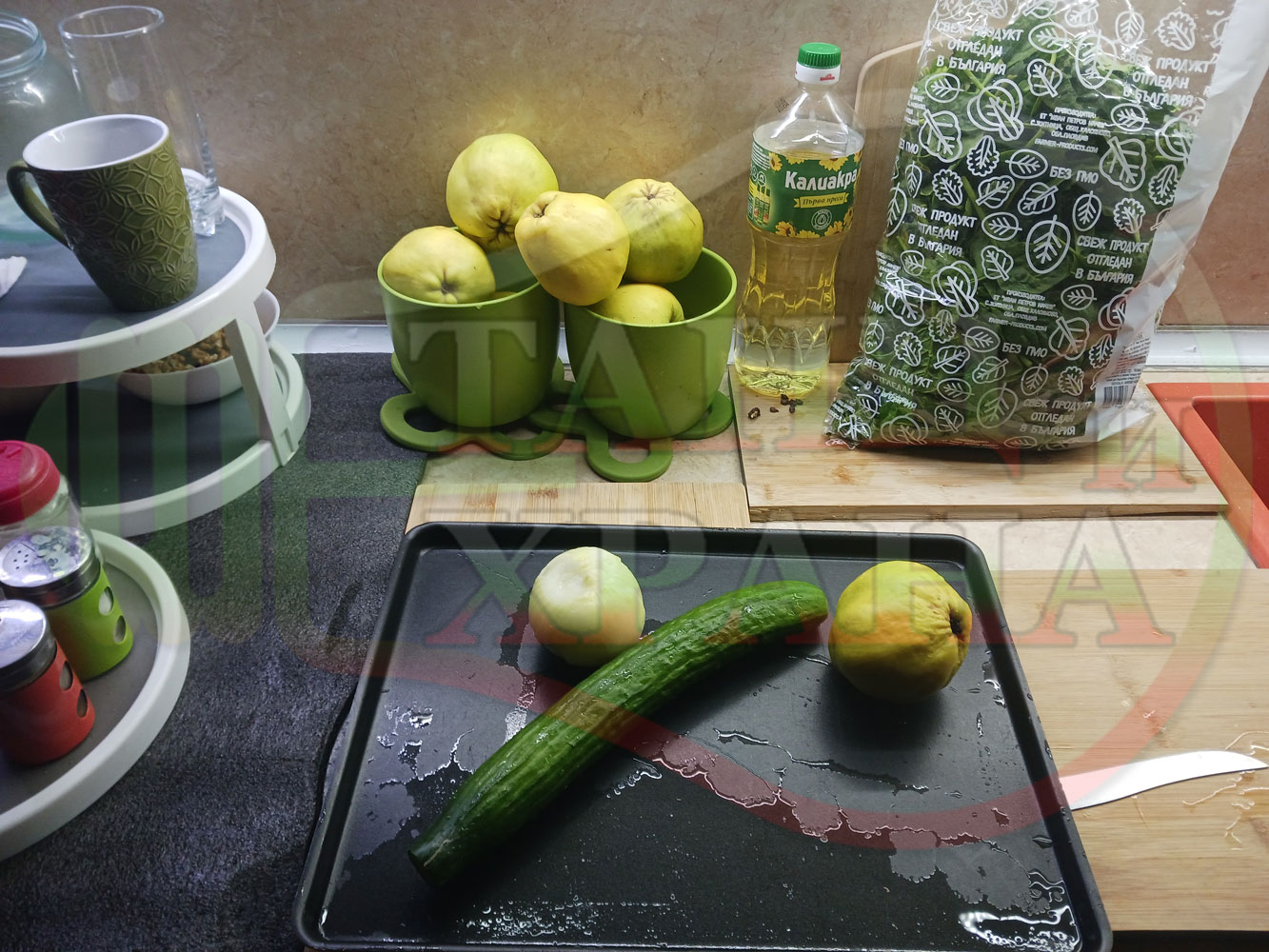 Измийте краставицата и дюлята, нарежете ги на различни форми и ги сипете в намазана с олио тава за печене. Добавете обеления, измит и нарязан на едро лук и посолете продуктите. Налейте топла към гореща вода от чешмата и разбъркайте. Поставете тавата в предварително загрятата фурна (загрейте я за поне 5 минути). Запечете на фурна без вентилатор на 180 градуса за около 40 минути.