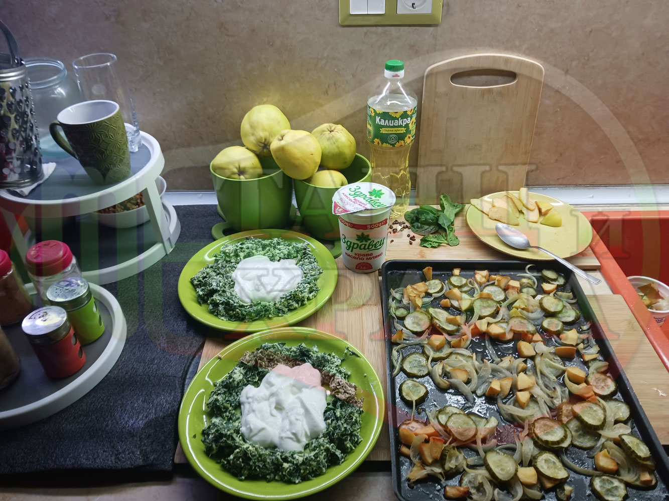Разпределете равномерно сиреново спаначения крем в чиниите и оформете "кладенче". Сипете по 150 гр. кисело мляко в средата на кладенчето и го загладете, така че да покрие плътно вътрешността на кладенчето. Разпределете равномерно запечените дюли, лук и краставици върху киселото мляко. Украсете порциите с резенчета несварени дюли и листенца спанак (украсете по ваше желание и усмотрение).