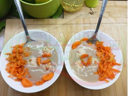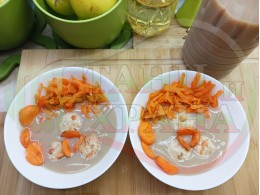 Българска бозова сурова сладка супа "Бозаджийноморковена халвяноорехова" приготвена от боза гарнирана с топчета от халвяно морковен крем с пресни моркови и тахан халва с орехи подходяща за постещи хора - двукомпонентна