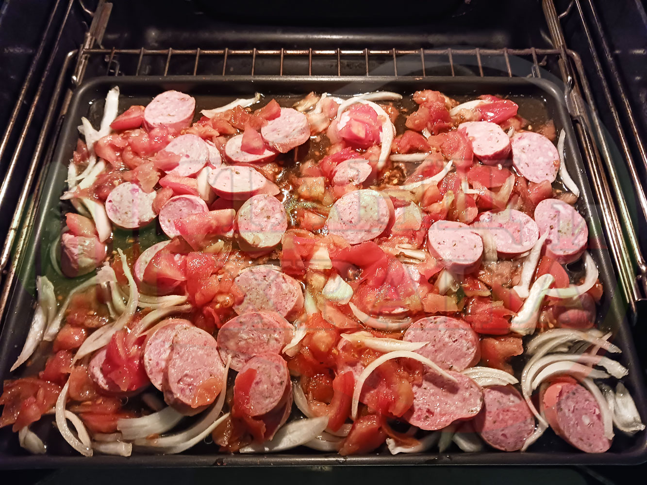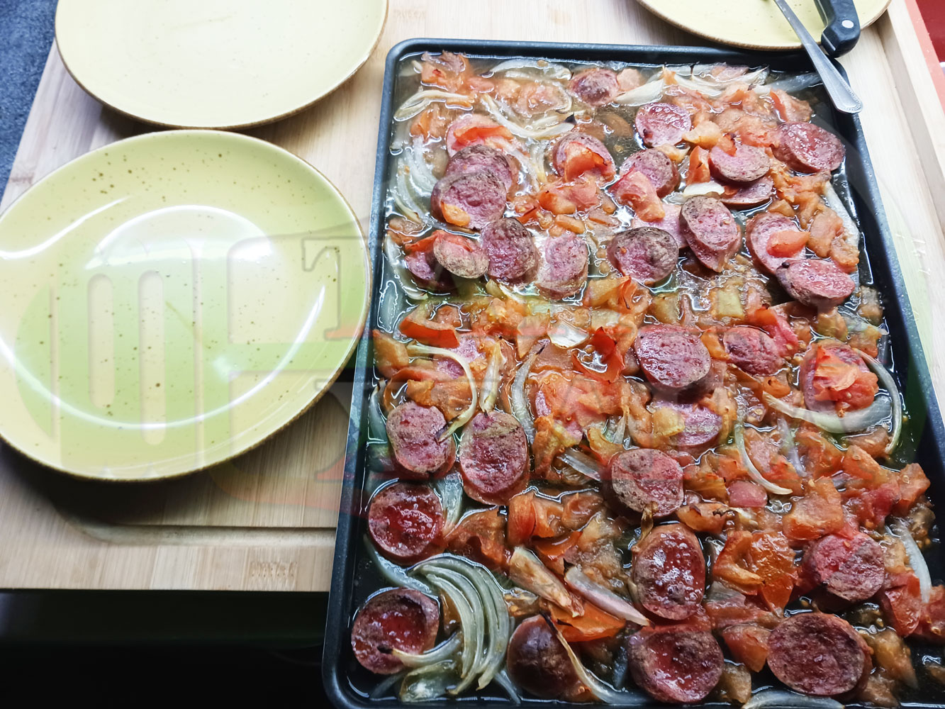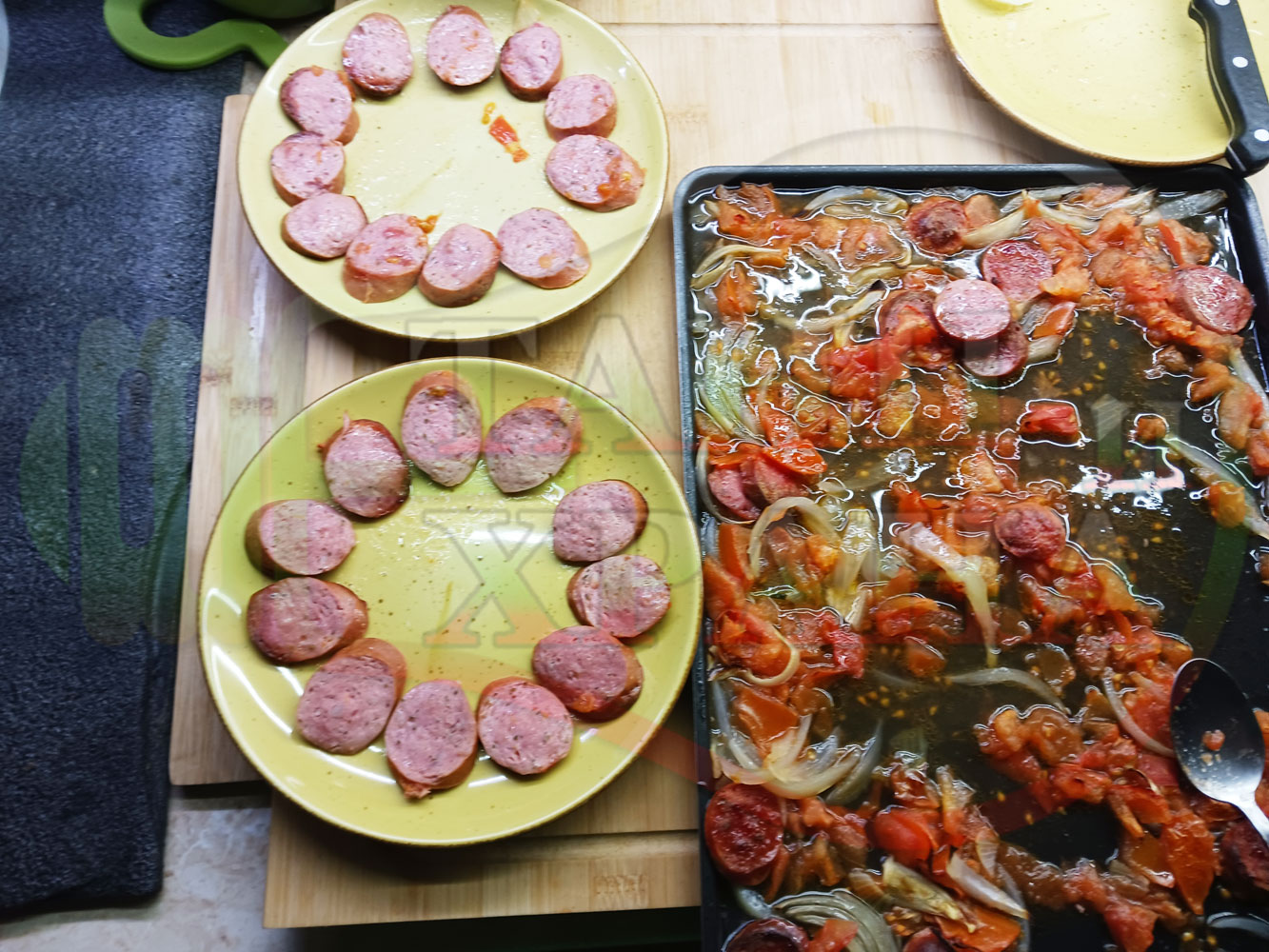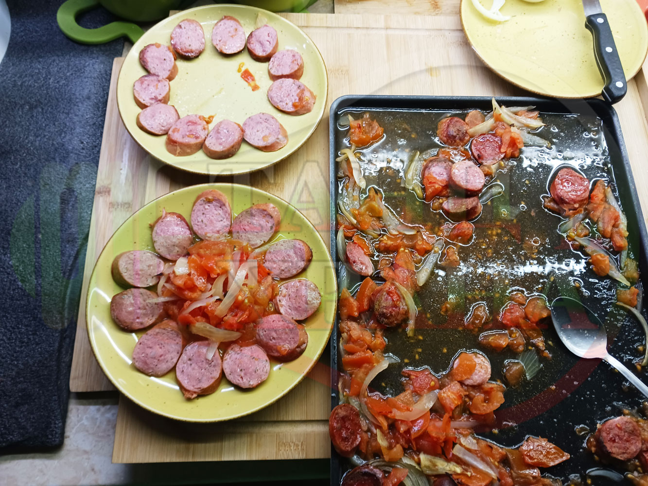 Българска доматена колбасова едрососова яхния "Родопсконаденицова пряснодоматена кромидлучена" запечена на фурна с родопска наденица с мерудии, кромид лук, слънчогледово олио и пресни домати приготвена с 3 основни продукта