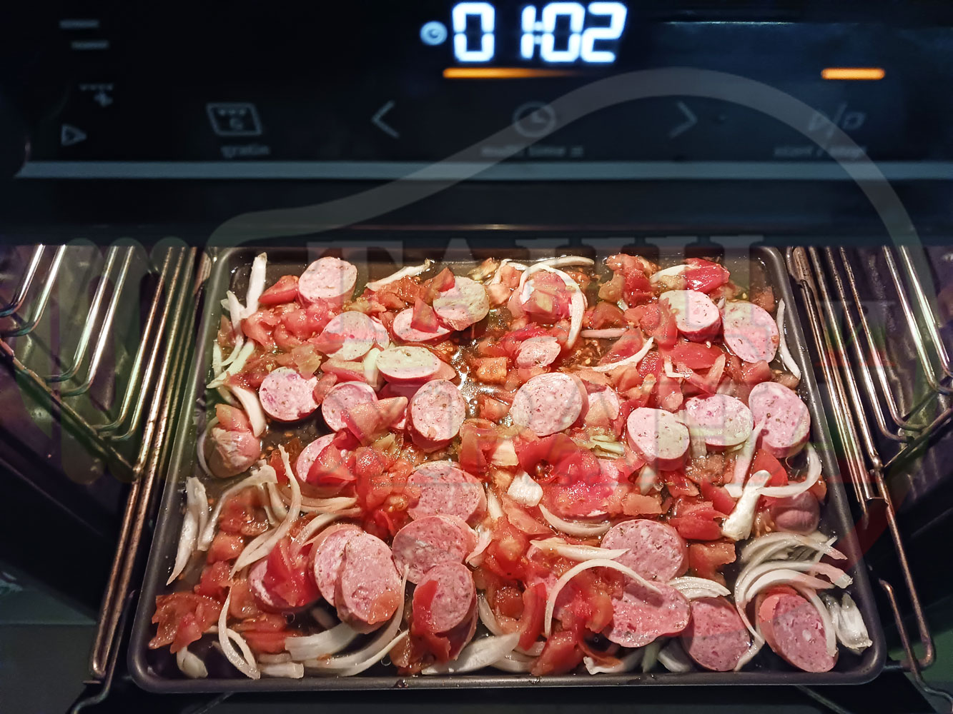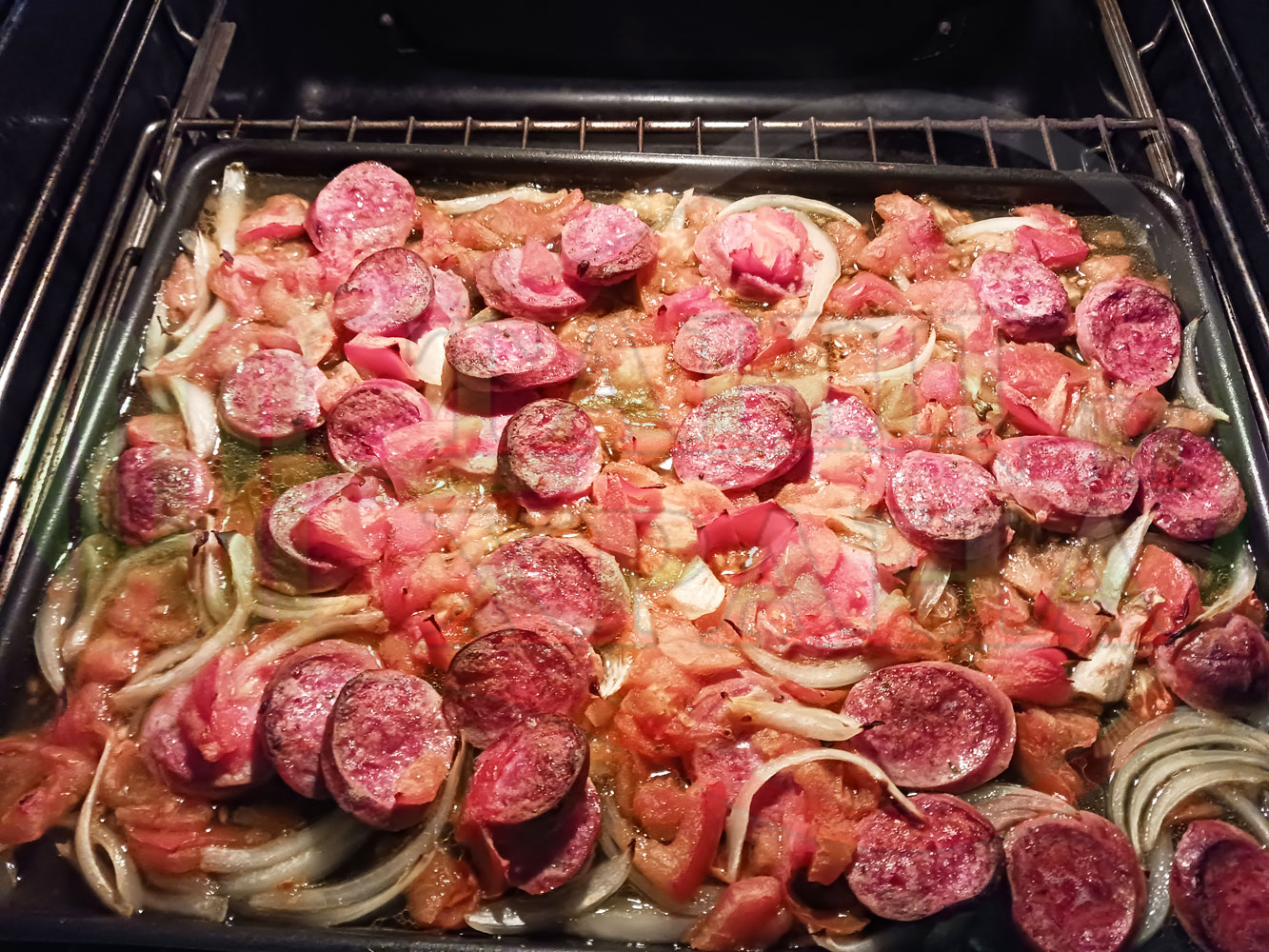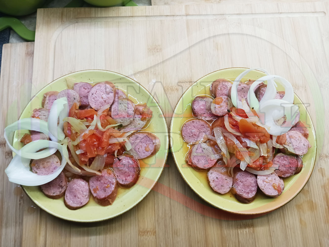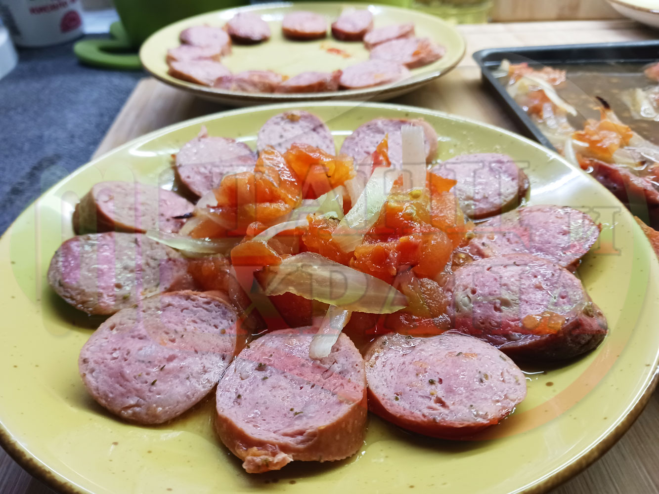 Българска доматена колбасова едрососова яхния "Родопсконаденицова пряснодоматена кромидлучена" запечена на фурна с родопска наденица с мерудии, кромид лук, слънчогледово олио и пресни домати приготвена с 3 основни продукта