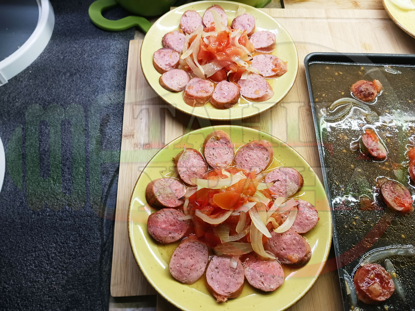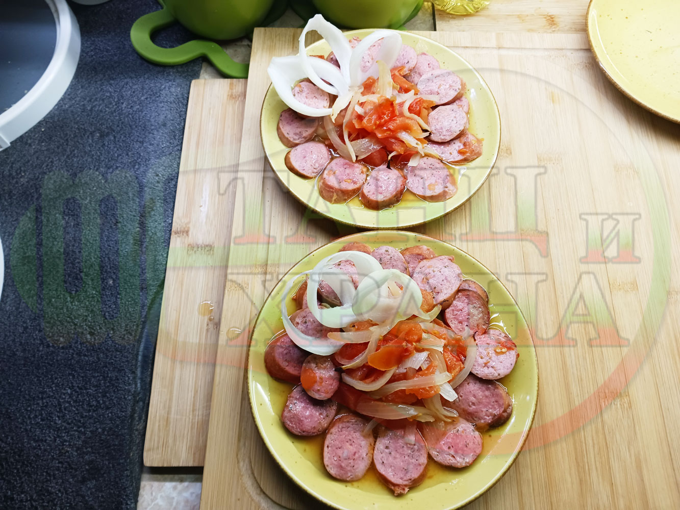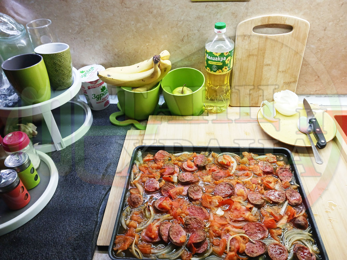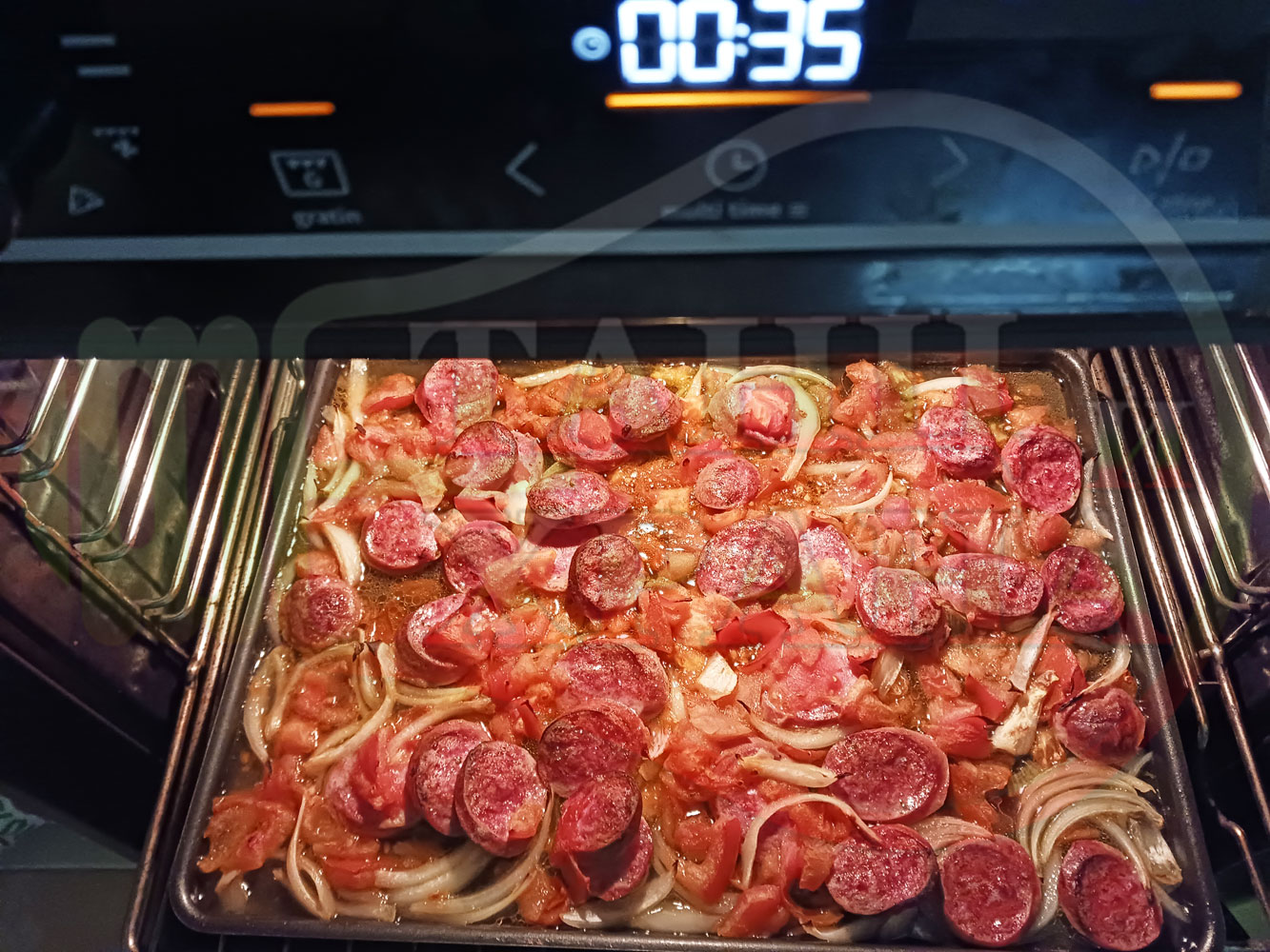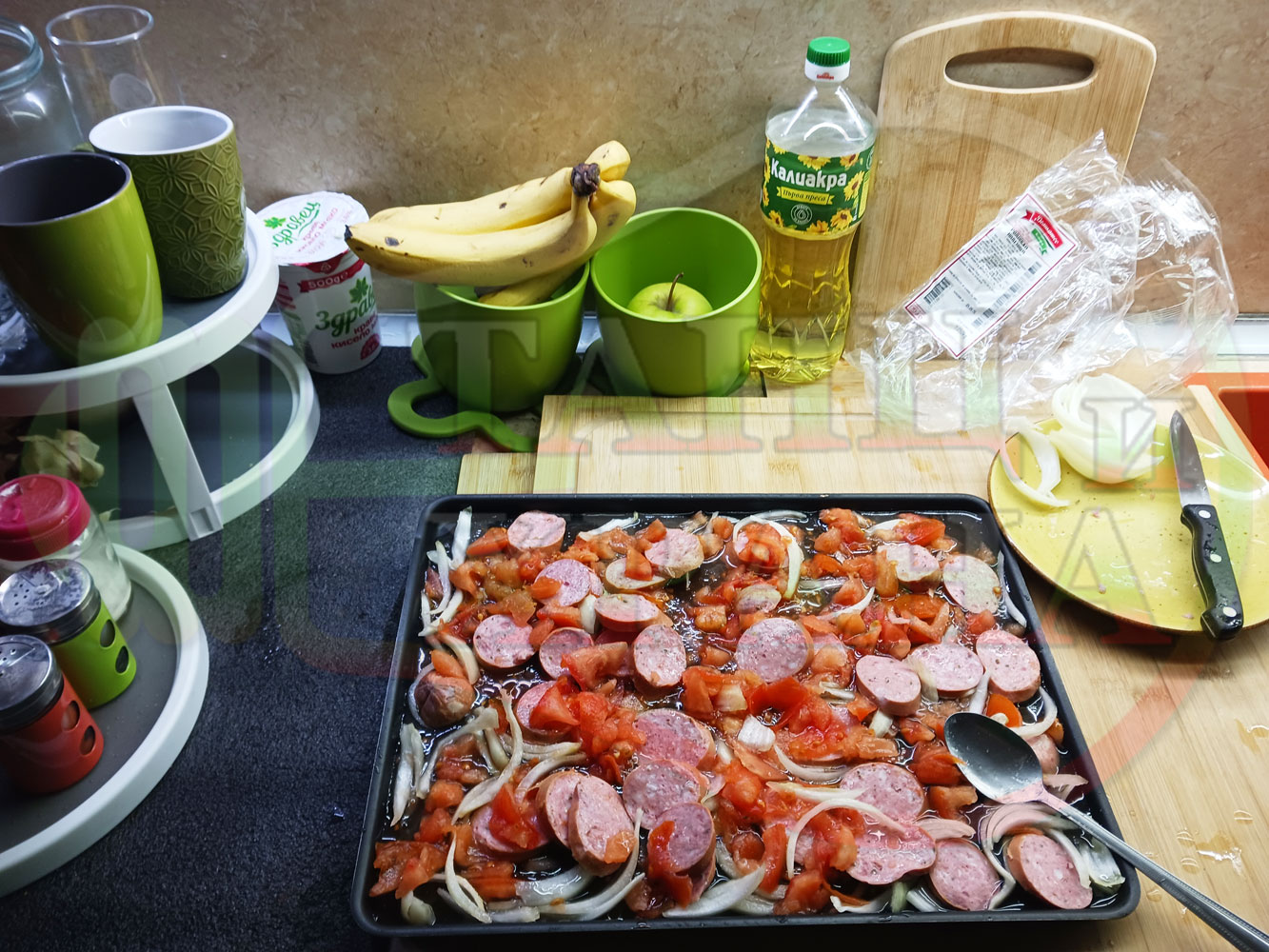 Българска доматена колбасова едрососова яхния "Родопсконаденицова пряснодоматена кромидлучена" запечена на фурна с родопска наденица с мерудии, кромид лук, слънчогледово олио и пресни домати приготвена с 3 основни продукта