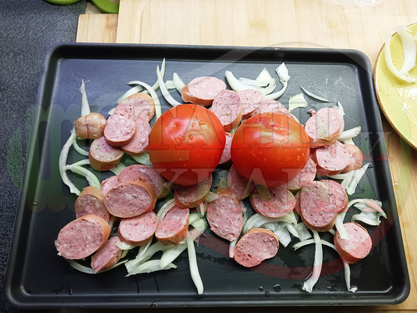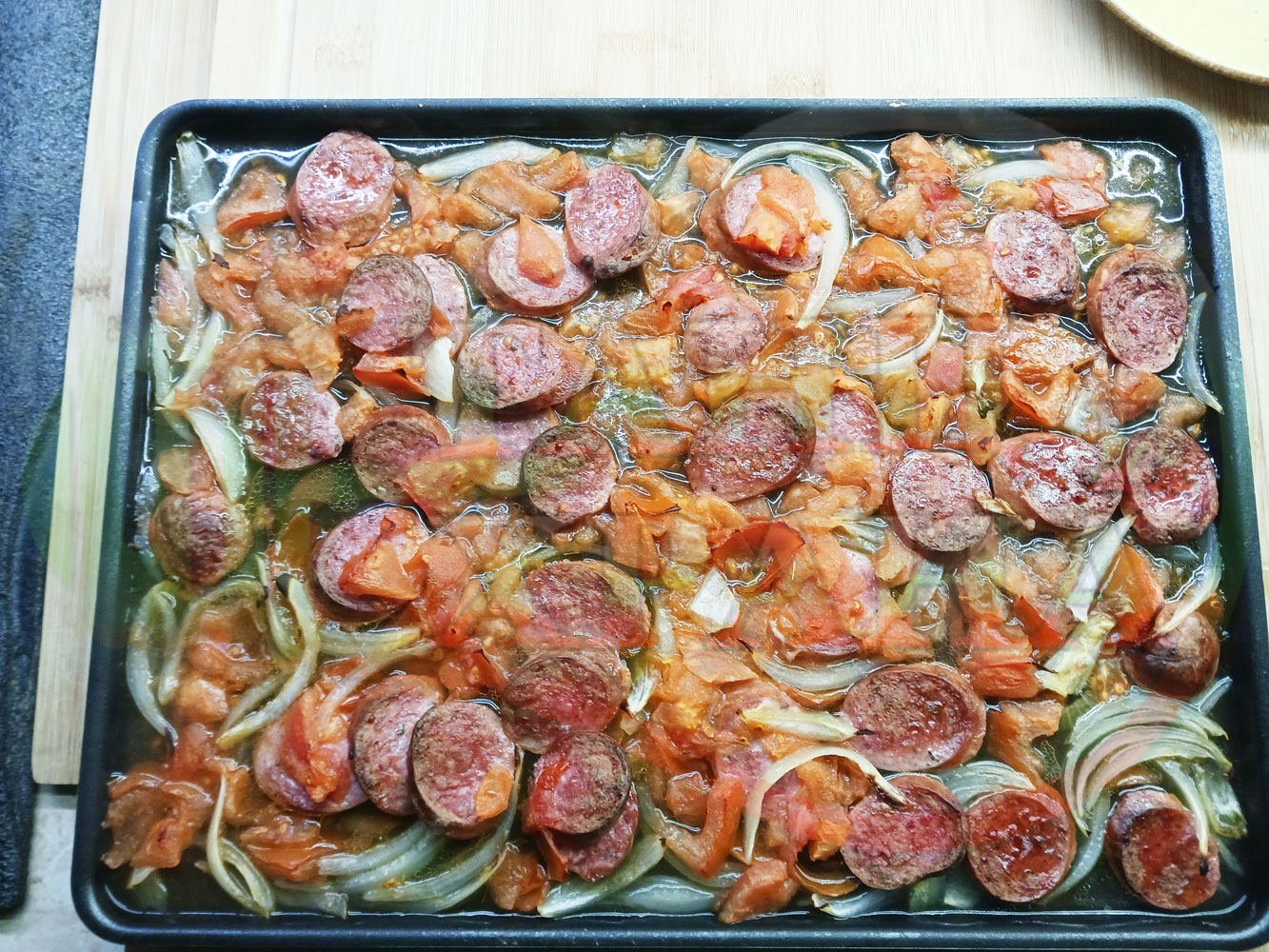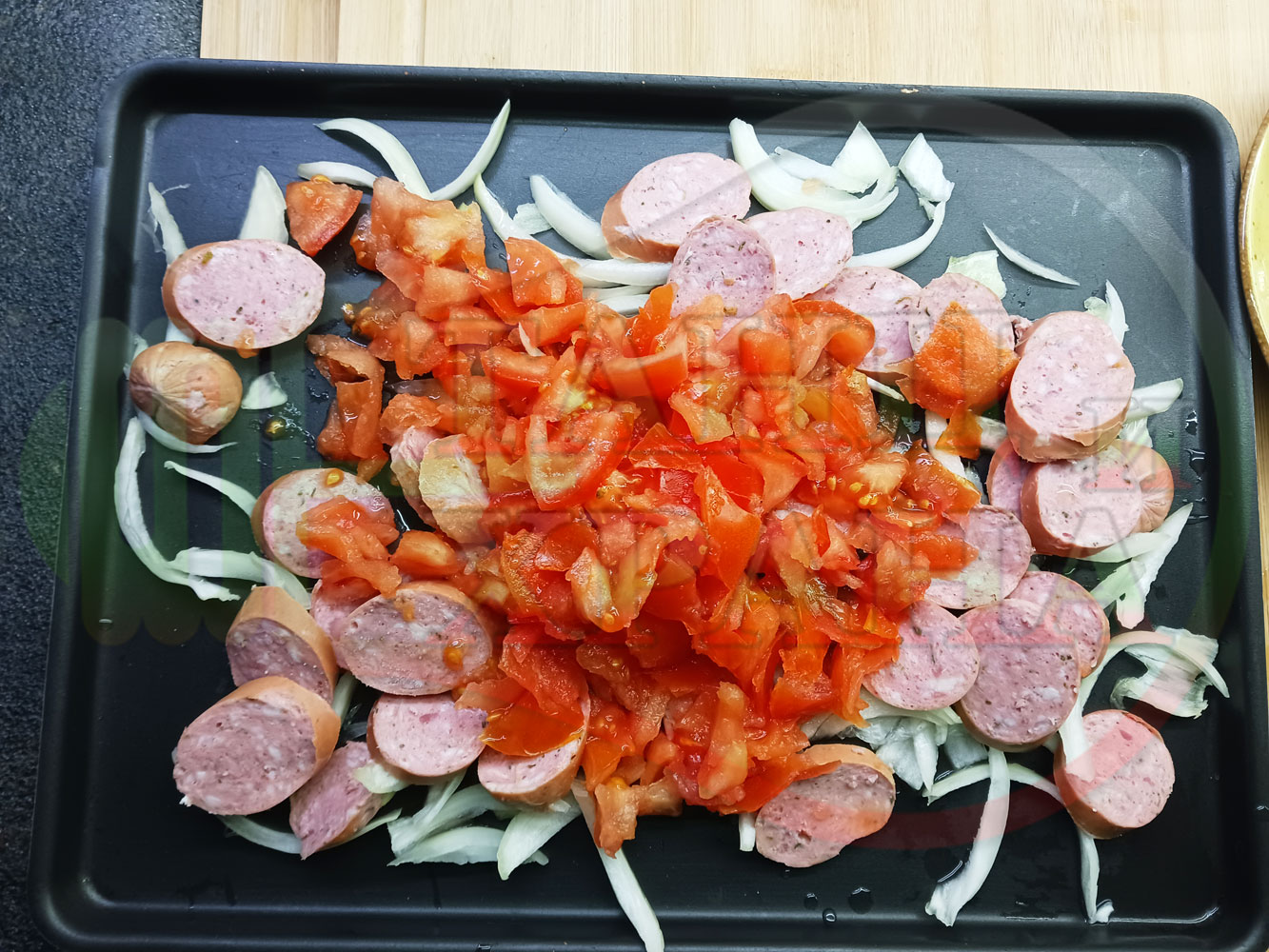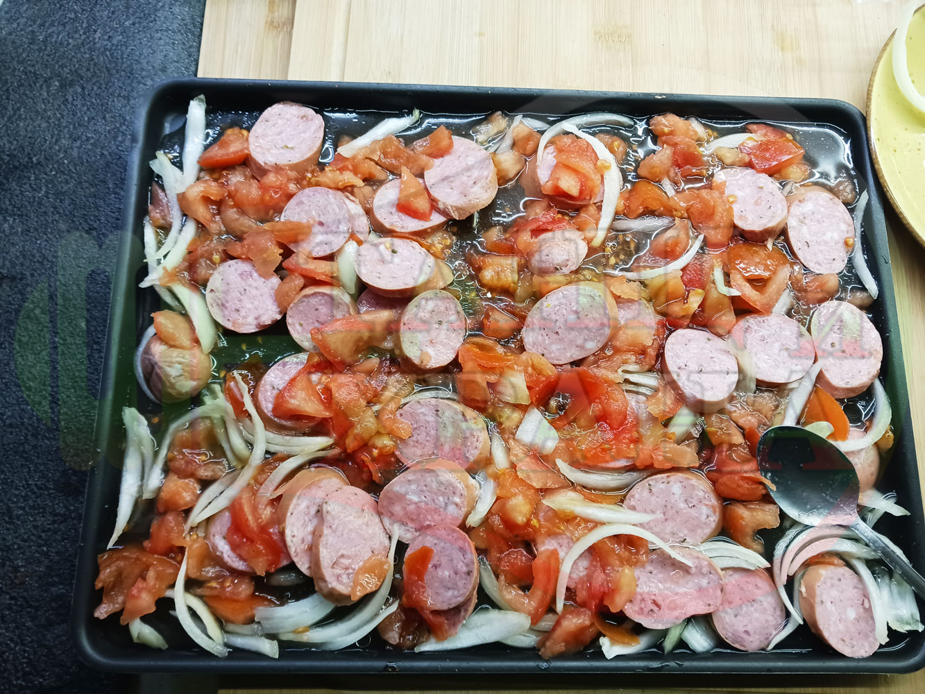 Българска доматена колбасова едрососова яхния "Родопсконаденицова пряснодоматена кромидлучена" запечена на фурна с родопска наденица с мерудии, кромид лук, слънчогледово олио и пресни домати приготвена с 3 основни продукта