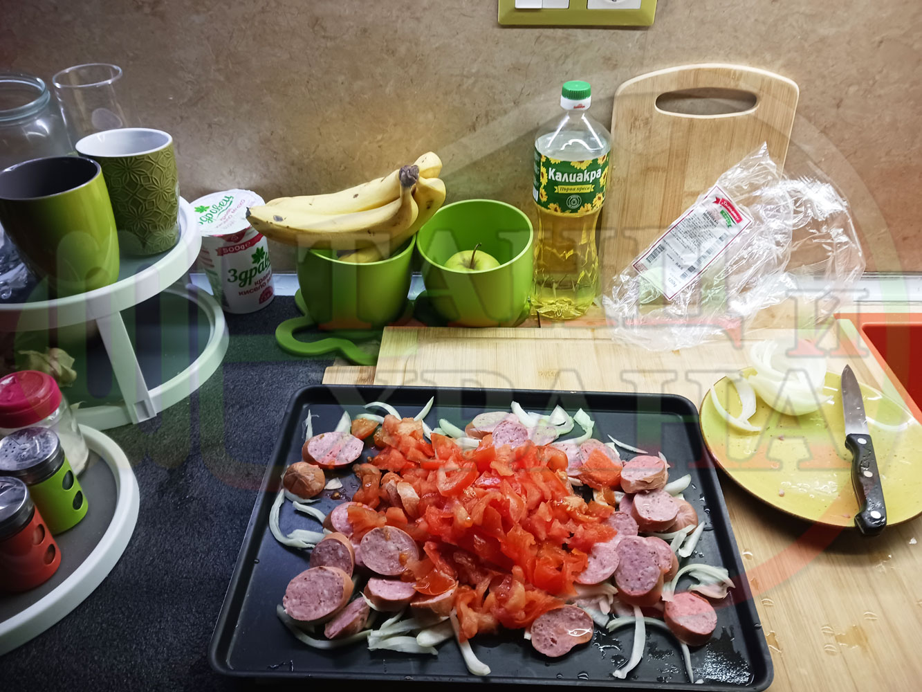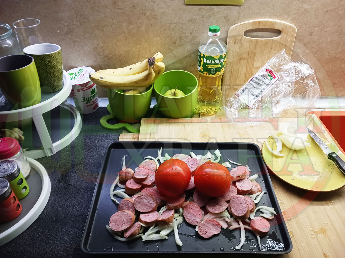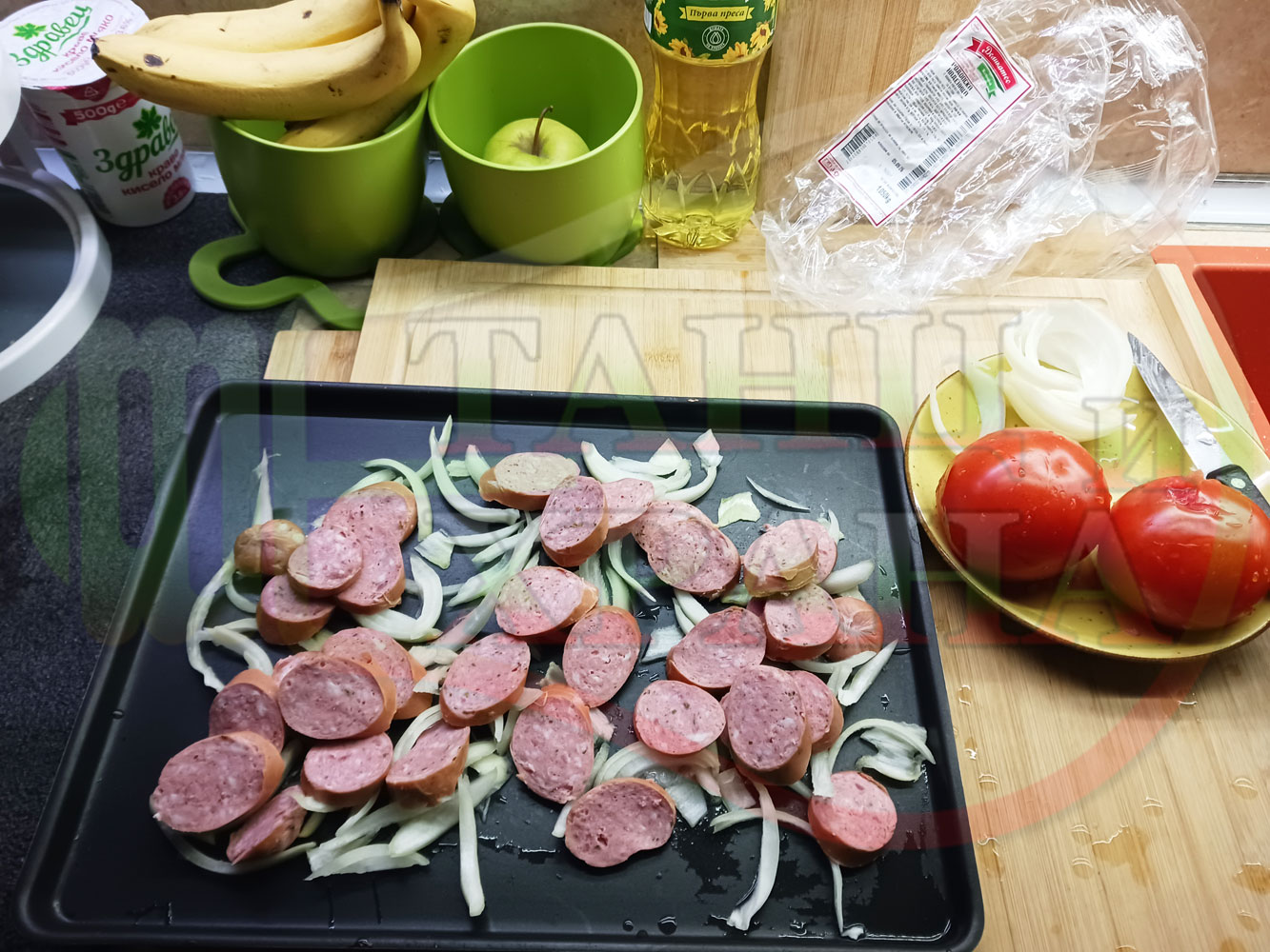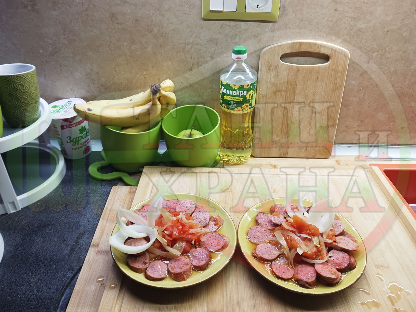 Българска доматена колбасова едрососова яхния "Родопсконаденицова пряснодоматена кромидлучена" запечена на фурна с родопска наденица с мерудии, кромид лук, слънчогледово олио и пресни домати приготвена с 3 основни продукта
