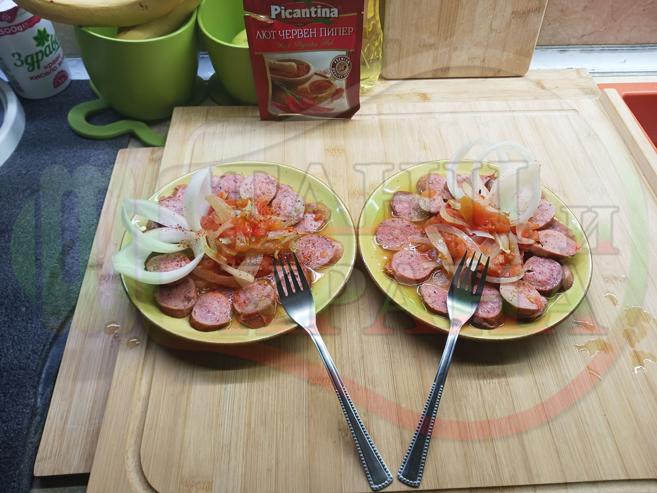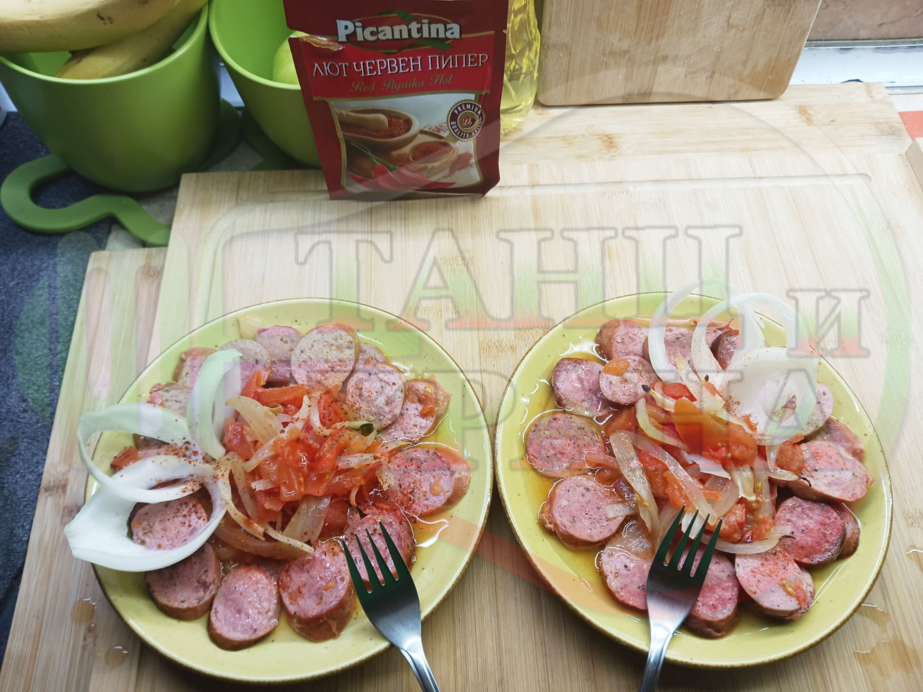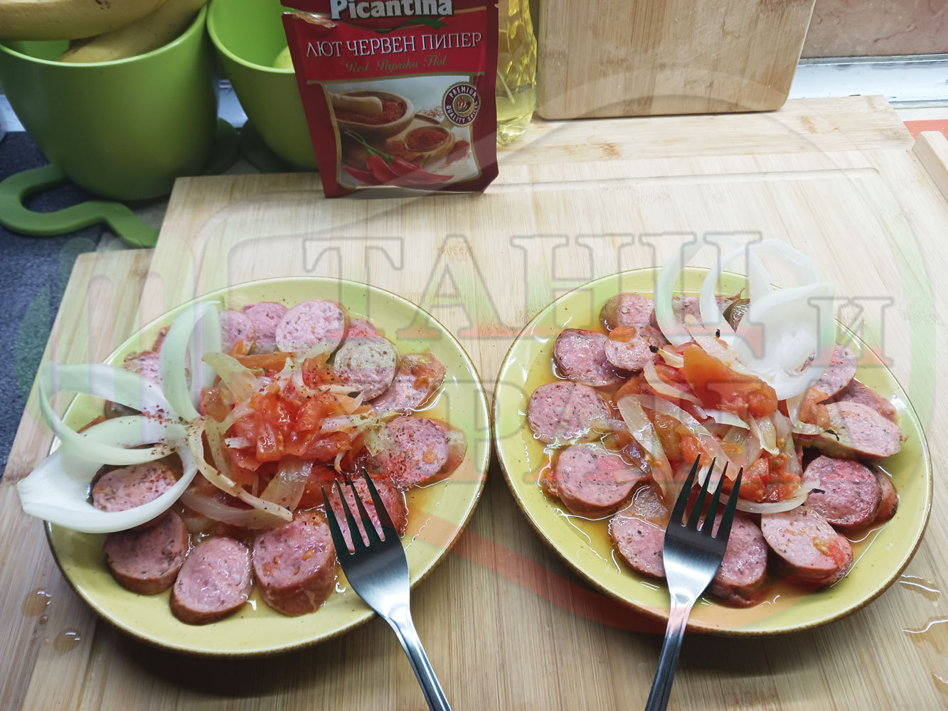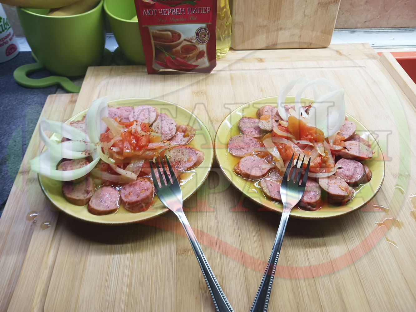 Спретнах изключително вкусна българска доматена колбасова едрососова яхния, приготвена с вкусната родопска наденица с мерудии, кромид лук, слънчогледово олио и пресни домати (само с 3 основни продукти). Ммммм... в кухнята се носи аромат на запечена, цвърчаща наденица, овкусена от соковете на доматите и сладостта на леко запечения кромид лук и отново се получи невероятна вкусно, вкусна, вкусотия (вкуснотия), подходяща за вечеря, обяд и дори като следобедно ястие. ![]()