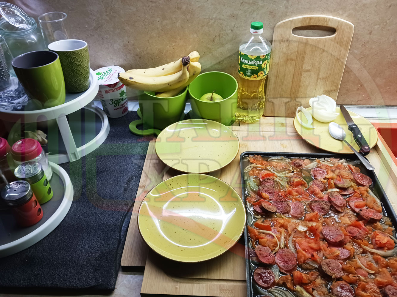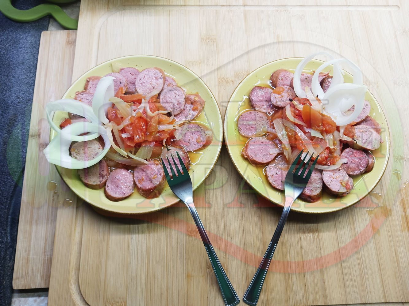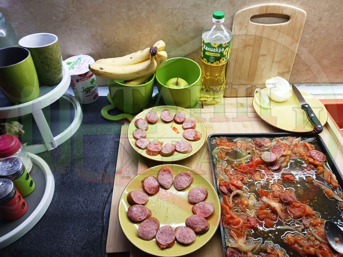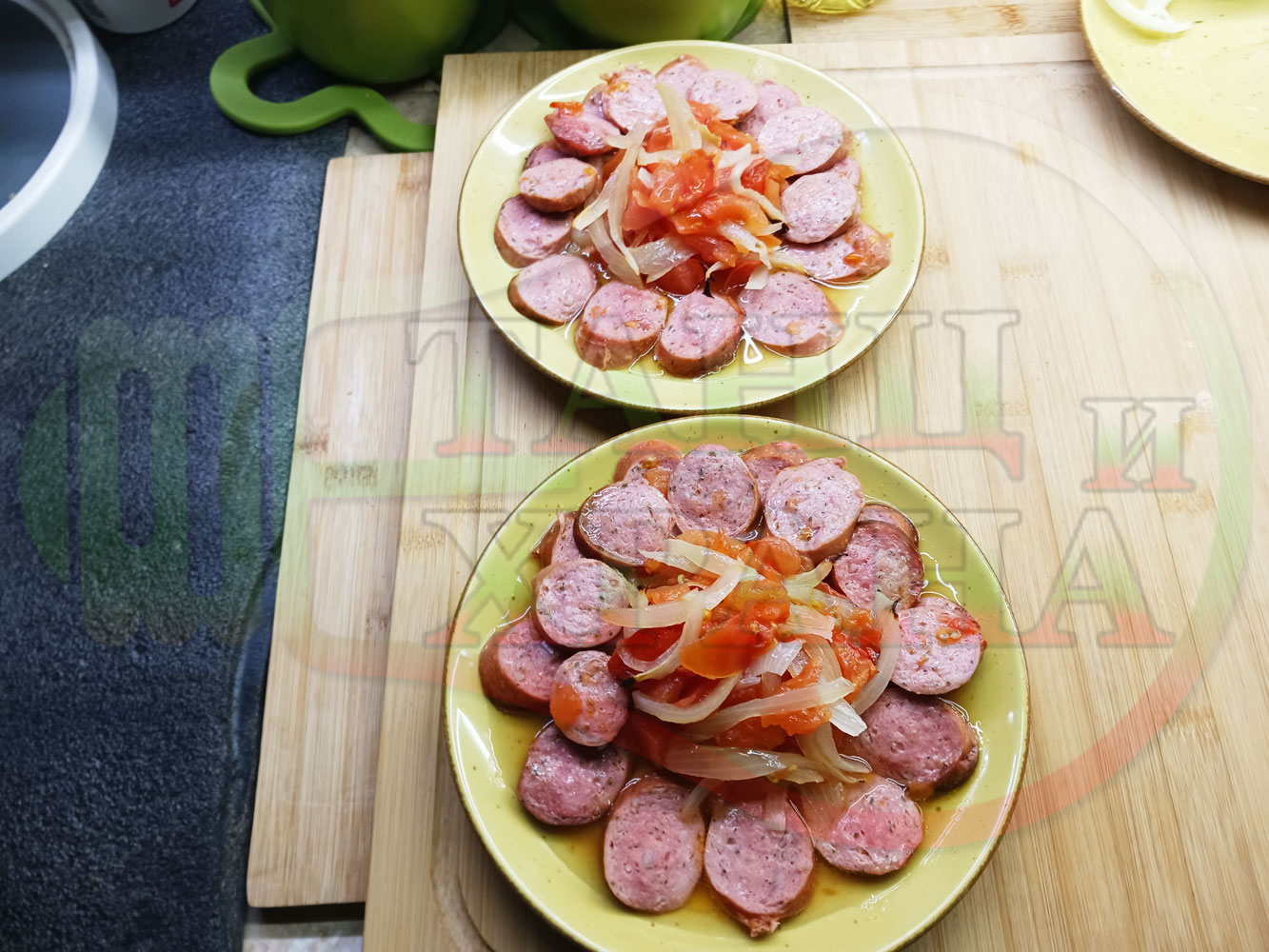Спретнах изключително вкусна българска доматена колбасова едрососова яхния, приготвена с вкусната родопска наденица с мерудии, кромид лук, слънчогледово олио и пресни домати (само с 3 основни продукти). Ммммм... в кухнята се носи аромат на запечена, цвърчаща наденица, овкусена от соковете на доматите и сладостта на леко запечения кромид лук и отново се получи невероятна вкусно, вкусна, вкусотия (вкуснотия), подходяща за вечеря, обяд и дори като следобедно ястие. ![]()