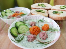 Българска студена млечна супа "Спаначено сиренови топчета" приготвена от краставици, свеж копър, орехи, чесън и кисело мляко от България с топчета от спанак и краве бяло сирене гарнирана с крутони "Червенопиперкови с кромид лук"