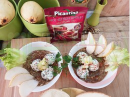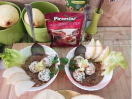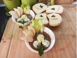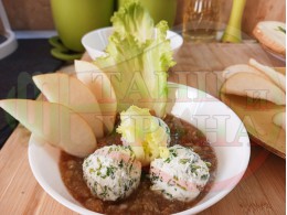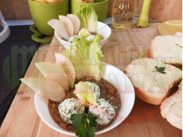 Българска плодова сурова супа "Крушова марулена с БГсирене" приготвена от пресни круши и свежа маруля гарнирана с топчета от сиренов крем с магданоз и краве бяло сирене (българско, саламурено) - двукомпонентна