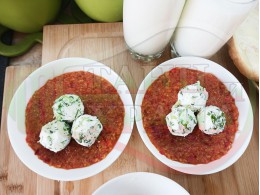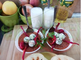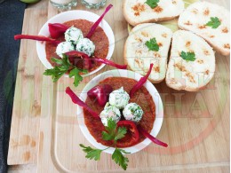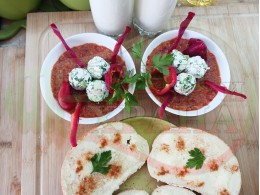 Българска сурова супа "Прасковенокрушова червеночушковолютенична с БГсирене" приготвена от червени пресни чушки, праскови, круши и едросмляна лютеница гарнирана с топчета от сиреново магданозен крем с магданоз и краве бяло сирене - двукомпонентна