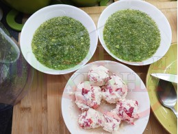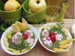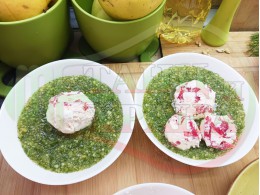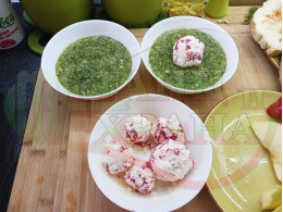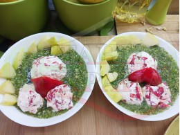 Българска сурова студена супа "Жълтоябълкова копъровозеленочайна с БГсирене" приготвена от пресни ябълки, свеж копър и зелен чай гарнирана с топчета от сиренов крем с червени пресни чушки и краве бяло сирене (българско, саламурено) - двукомпонентна